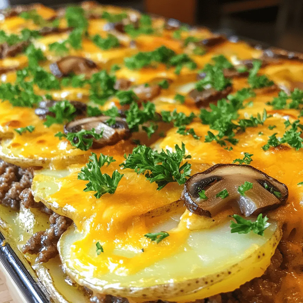 These ingredients create a hearty meal. The ground beef gives it richness, while the onions and mushrooms add depth. The potatoes provide a comforting base, and the cheese tops it all with creamy goodness.