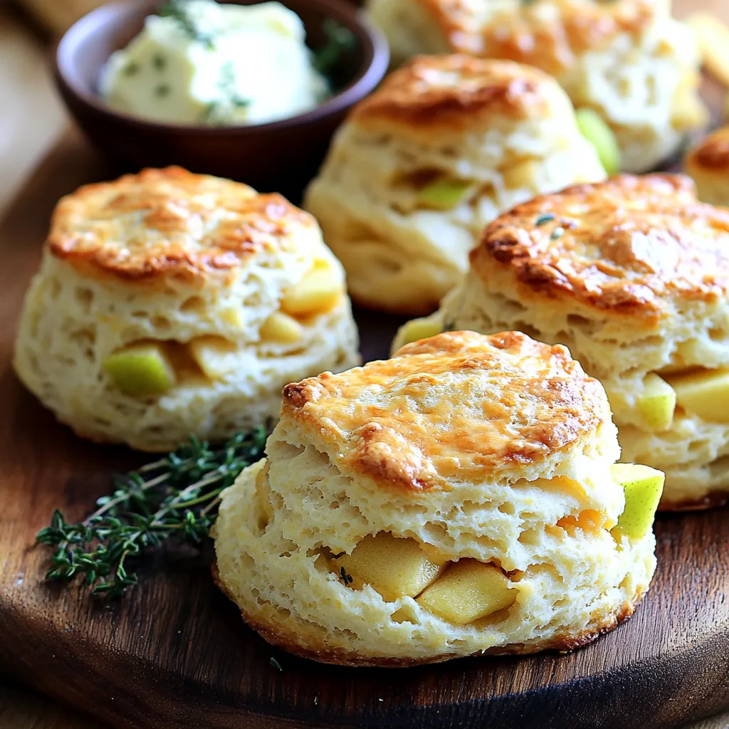 - 2 cups all-purpose flour - 1 tablespoon baking powder - 1 teaspoon baking soda - 1 teaspoon salt - ½ cup unsalted butter, chilled and cubed - 1 cup sharp cheddar cheese, shredded - 1 cup finely diced apples (such as Granny Smith) - ¼ cup honey - ¾ cup buttermilk - 1 tablespoon fresh thyme leaves - Alternative cheeses: You can use mozzarella or Gruyère for a milder taste. - Sweetener options: Maple syrup or agave can replace honey if you prefer. - Gluten-free flour options: Use a gluten-free blend to make these biscuits gluten-free. - Choosing the right apple: Granny Smith apples work best for a nice tart flavor. Other firm apples can work too, but avoid soft varieties. - The role of buttermilk in baking: Buttermilk adds moisture and tang, helping the biscuits rise and stay tender. - Fresh vs. dried thyme: Fresh thyme has a brighter taste, while dried thyme can be more concentrated. Use half the amount of dried if substituting. 1. Preheat your oven to 425°F (220°C). Line a baking sheet with parchment paper. This will help the biscuits not stick. 2. In a large bowl, mix the dry ingredients. Whisk together 2 cups of flour, 1 tablespoon of baking powder, 1 teaspoon of baking soda, and 1 teaspoon of salt until they are well combined. 3. Add the butter to the flour mix. Cut ½ cup of chilled, cubed butter into the dry mixture. Use your fingers or a pastry cutter to blend until it looks like coarse crumbs. 1. Knead the dough lightly. Turn the dough onto a floured surface. Pat it down into a rectangle about ¾ inch thick. 2. Create layers by folding. Fold the dough over itself a couple of times. This helps make the biscuits flaky. 3. Cut your biscuits. You can use a biscuit cutter for rounds or a knife for squares. Keep them about 2 inches apart on the baking sheet. 1. Bake the biscuits. Place the baking sheet in the oven and bake for 15-18 minutes. They should be golden brown on top when done. 2. Check for doneness. Look for a nice golden color. You can also tap the top; it should sound hollow. Now you're ready to enjoy these delicious Apple Cheddar Biscuits with Thyme Butter! To get the best dough, you want it to feel just right. Aim for a slightly sticky texture that holds together well. If it’s too dry, add a little more buttermilk. If it feels too wet, sprinkle in some extra flour. For flakiness, cold butter is key. Make sure your butter stays chilled until you mix it in. When you blend it into the flour, leave small chunks. This gives your biscuits those lovely layers. These biscuits shine when served warm with thyme butter. Slather it on right after they come out of the oven. You can also serve them with soups or salads. They pair well with a creamy tomato soup or a fresh green salad. For a fun twist, think about adding a sprinkle of cheese on top before baking. It adds a nice crust and extra flavor. If your biscuits turn out dense, check your measurements. Too much flour can weigh them down. Try using a kitchen scale for accuracy. For dry biscuits, ensure you use enough buttermilk. If they are still dry, consider adding a bit more honey for moisture. If your biscuits stick to the baking sheet, make sure to use parchment paper. It helps prevent sticking and makes cleanup easier. Should you notice burning, check your oven temperature. An oven thermometer can help ensure it’s accurate. Adjust the temperature down slightly if needed. {{image_2}} You can make Apple Cheddar Biscuits even better. Adding herbs or spices boosts flavor. Try rosemary or sage for a fresh twist. You can also mix in nuts or cranberries. Walnuts add crunch, while cranberries give a sweet-tart taste. Want to make these biscuits vegan? Use plant-based butter and almond milk instead of buttermilk. For a low-sugar option, swap honey for a sugar substitute. This keeps the flavor while reducing sugar. Choosing the right cheddar is key. Mild cheddar gives a softer taste, while sharp cheddar adds a strong flavor. You can even use flavored cheeses. Pepper jack or smoked cheddar brings new tastes to the dish. Experiment to find your favorite! To keep your leftover biscuits fresh, store them in an airtight container. This helps prevent them from drying out. If you have a lot, you can wrap them in plastic wrap before placing them in the container. I recommend using a glass or plastic container with a tight seal. If you want to enjoy these biscuits later, freezing is a great option. First, let the biscuits cool completely. Then, place them in a single layer on a baking sheet. Freeze them for about an hour until solid. After that, move them to a freezer bag or container. When you’re ready to eat, reheat them in the oven. Bake at 350°F (175°C) for about 10-15 minutes. This helps them regain their fluffy texture. At room temperature, these biscuits can last for about 2-3 days. Keep them in a cool, dry place. Watch for signs of spoilage, such as a hard texture, mold, or an off smell. If you notice any of these, it’s best to throw them away. Enjoy your delicious apple cheddar biscuits while they’re fresh! To add more flavor, you can mix in fresh herbs. Try rosemary or sage for a twist. You can also add spices like black pepper or paprika. A pinch of garlic powder brings depth too. Experiment with different types of cheese, like pepper jack or gouda. You can even add nuts or dried fruits for extra texture and taste. Yes, you can make these biscuits ahead of time. Prepare the dough and shape the biscuits. Then, wrap them in plastic wrap and chill in the fridge. This keeps them fresh until you are ready to bake. You can also freeze the shaped biscuits. Just thaw them in the fridge before baking. This works well for busy mornings or gatherings. To reheat leftover biscuits, preheat your oven to 350°F. Wrap the biscuits in foil to keep them moist. Heat in the oven for about 10-15 minutes. You can also microwave them for about 20 seconds. For best results, avoid overheating, as this can dry them out. Enjoy them warm with t