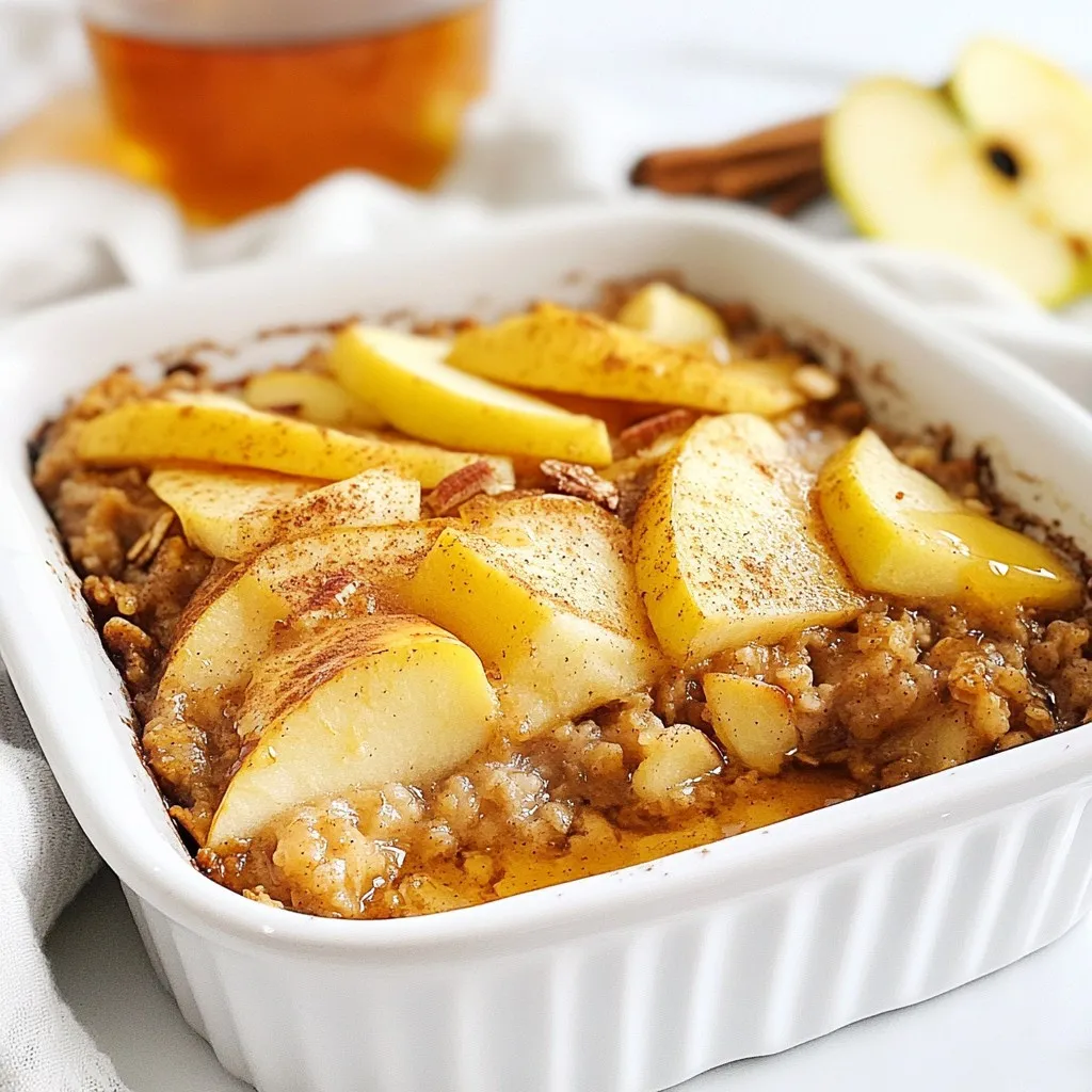A warm and comforting baked oatmeal dish featuring apples and cinnamon, perfect for breakfast.
