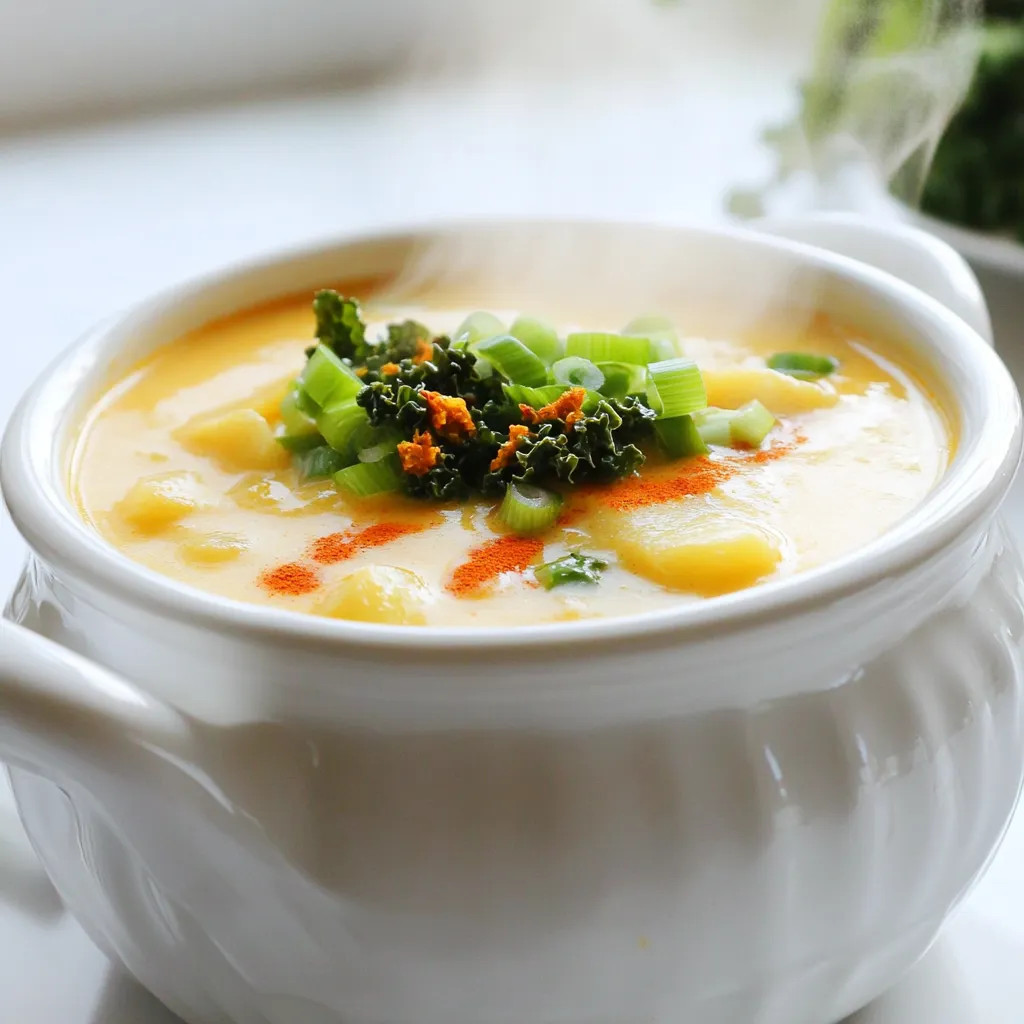 To make a great baked potato soup, you need some key ingredients. Here’s what you’ll need: - 4 large russet potatoes, baked and cooled - 1 tablespoon olive oil - 1 medium onion, diced - 3 cloves garlic, minced - 4 cups vegetable broth - 1 cup heavy cream - 1 cup shredded sharp cheddar cheese - 1/2 cup sour cream - 1 teaspoon smoked paprika - Salt and pepper to taste These ingredients create a rich, creamy soup. The russet potatoes add a hearty base. The heavy cream and sour cream make it smooth and rich. Sharp cheddar cheese gives it a nice flavor. You can make your soup even better with garnishes. Here are some tasty options: - 4 green onions, chopped - Crumbled crispy kale or bacon bits These toppings add crunch and flavor. The green onions give a fresh taste. If you love bacon, it adds a salty kick. You can change some ingredients if needed. Here are a few ideas: - Instead of heavy cream, use coconut cream for a dairy-free option. - Use chicken broth instead of vegetable broth for a different flavor. - If you want a lighter soup, reduce the amount of cream. Feel free to mix and match ingredients as you wish. Cooking is all about finding what you love! Start by preheating your oven to 400°F (200°C). Take four large russet potatoes and wash them well. Place the potatoes directly on the oven rack. Bake for about one hour. You want them soft. Once baked, let them cool down for a bit. After they cool, cut each potato in half lengthwise. Use a spoon to scoop out the insides into a bowl. Leave a thin layer of potato in the skin. This adds some nice texture. In a large pot, pour in one tablespoon of olive oil. Heat it over medium heat. Add one diced medium onion. Sauté it until it turns translucent, which should take about five minutes. Next, add three minced garlic cloves. Cook for one to two minutes until the garlic smells good. Now, pour in four cups of vegetable broth. Bring this mix to a simmer. Stir in the scooped potato flesh, one cup of heavy cream, and one cup of shredded sharp cheddar cheese. Add one teaspoon of smoked paprika, along with salt and pepper to taste. Mix it well until the cheese melts and the soup becomes creamy. Once the soup base is ready, grab an immersion blender. Blend the soup until it reaches the consistency you like. You can make it smooth or leave some chunks for texture. Stir in half a cup of sour cream to enhance creaminess. Taste the soup and adjust the seasoning if needed. Serve it hot, garnished with chopped green onions. You can also add crumbled crispy kale or bacon bits for an extra touch. Enjoy your creamy baked potato soup! To get that creamy texture, use heavy cream. It adds richness. Blend the soup well. If you want chunks, blend only half. This mix makes each bite exciting. Seasoning your soup is key. Use smoked paprika for a deep flavor. Don't forget salt and pepper. They bring out the taste of the potatoes. Fresh herbs like chives can add brightness. Avoid using raw potatoes. Cook them first for a smooth base. Don't skip the blending step. This is crucial for creaminess. Lastly, be careful with salt. Taste as you go to prevent over-salting. {{image_2}} You can make baked potato soup even more fun! Add crispy bacon bits for a salty crunch. Top it with extra cheese for a cheesy bite. You might also like adding sour cream on top for creaminess. Chopped chives or green onions add a fresh taste. You can even throw in some broccoli for a veggie boost. For a vegetarian twist, skip the bacon and use vegetable broth. You can replace heavy cream with coconut milk for a vegan option. Use cashew cream for richness and flavor without dairy. Tofu can add protein and creaminess too. Always check labels to ensure all ingredients are vegan. Want to spice things up? Add more smoked paprika for a smoky flavor. You can mix in some cayenne pepper for heat. If you love herbs, try thyme or rosemary for extra depth. A squeeze of lemon juice can brighten the soup. Experiment with these flavors to find your favorite. After you enjoy your baked potato soup, store leftovers in the fridge. Use an airtight container to keep it fresh. The soup stays good for about 3 to 4 days. Before you put it away, let it cool down first. This helps prevent extra steam inside the container. When you want to heat up your soup, pour it into a pot. Use medium heat on the stove. Stir it well to avoid sticking. Heat until warm, but don’t let it boil. You can also use the microwave. Just heat it in short bursts, stirring in between. This way, it warms evenly. You can freeze this soup for later! First, let it cool completely. Then, put it in a freezer-safe container. Leave some space at the top for expansion. It can stay in the freezer for up to 3 months. When you’re ready to eat it, thaw it in the fridge overnight before reheating. Yes, you can make baked potato soup ahead of time. Just follow the recipe, and let it cool. Store it in the fridge for up to three days. When you're ready to eat, reheat it on the stove. Stir it well to keep it creamy. To thicken the soup, you have a few options. You can add more potatoes. Just cook and mash a few more russet potatoes. You can also mix in some cornstarch. Just blend one tablespoon of cornstarch with cold water, then stir it into the soup. Let it cook for a few minutes to thicken. If you need a substitute for heavy cream, try using half-and-half. You can also use coconut milk for a dairy-free option. If you want something lighter, use whole milk and add a bit of butter. This will give you some creaminess without being too heavy. Yes, baked potato soup is gluten-free. Just make sure your vegetable broth is gluten-free. Most store-bought broths are, but it's always good to check the label. This soup is great for those who need to avoid gluten. To make baked potato soup in a slow cooker, first, bake the potatoes. Once they cool, scoop out the insides and add them to the slow cooker. Add the onion, garlic, vegetable broth, and seasonings. Cook on
