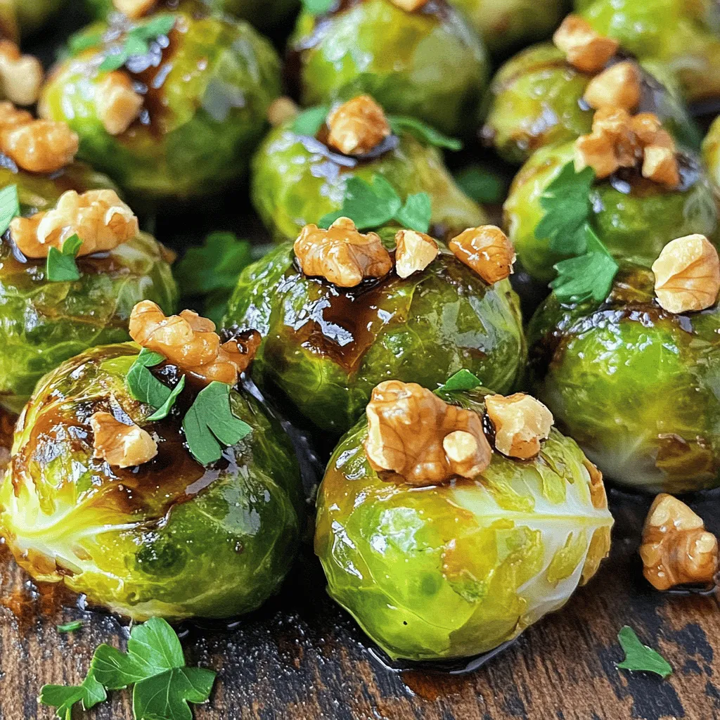 ![To make balsamic roasted Brussels sprouts, you need: - 1 lb Brussels sprouts, trimmed and halved - 3 tablespoons balsamic vinegar - 2 tablespoons olive oil - 1 tablespoon honey (or maple syrup for a vegan option) - 2 cloves garlic, minced - Salt and pepper to taste For added flavor and crunch, consider: - 1/2 cup chopped walnuts or pecans - 1 teaspoon smoked paprika - Fresh parsley, chopped for garnish You can swap items if needed. Use lemon juice instead of balsamic vinegar. You can also replace honey with agave nectar. If you do not have walnuts or pecans, try almonds or sunflower seeds. For a nut-free option, simply skip the nuts. This will still taste great! 1. Start by preheating your oven to 425°F (220°C). This heat helps the sprouts get crispy. 2. Trim one pound of Brussels sprouts by cutting off the stem ends. Cut each sprout in half. 3. In a large bowl, mix three tablespoons of balsamic vinegar and two tablespoons of olive oil. 4. Add one tablespoon of honey or maple syrup for sweetness. This gives a nice glaze. 5. Mince two cloves of garlic and toss them into the bowl. Add salt and pepper to taste. 6. If you like, add one teaspoon of smoked paprika to bring a smoky flavor. 7. Toss the halved Brussels sprouts in the bowl until they are evenly coated. 1. Line a baking sheet with parchment paper. Spread the Brussels sprouts out in a single layer. 2. Place the baking sheet in the hot oven. Roast for 20 minutes. 3. Halfway through, take out the baking sheet. Toss the Brussels sprouts to ensure even roasting. 4. After 20 minutes, sprinkle half a cup of chopped walnuts or pecans on top. 5. Return the baking sheet to the oven and roast for another 10 to 15 minutes. 6. Look for a nice caramelized color and crispy texture on the sprouts and nuts. 1. Once done, take the baking sheet out of the oven. Let the Brussels sprouts cool for a few minutes. 2. Garnish your dish with fresh parsley for a pop of color. 3. Serve these balsamic roasted Brussels sprouts as a side dish with your favorite meal. 4. They pair well with chicken, fish, or even a hearty grain bowl. 5. For more details, check the Full Recipe for a complete guide on this dish. To get crispy Brussels sprouts, start with fresh ones. Choose firm, green sprouts. Trim the ends and cut them in half. Preheat your oven to 425°F (220°C) for the best results. Spread the sprouts in a single layer on the baking sheet. Avoid crowding them; this helps them roast instead of steam. Toss them halfway through cooking for even crispiness. Balsamic vinegar adds a rich flavor, but you can boost it. Try adding some maple syrup for sweetness. Smoked paprika gives a nice smoky taste. Garlic adds depth, so don’t skip it! For a nutty crunch, toss in walnuts or pecans during the last few minutes of roasting. Fresh parsley adds a bright finish. Timing is key for perfect Brussels sprouts. Roast them for 20 minutes, then toss. After that, add the nuts and roast for another 10-15 minutes. Check for doneness; they should be golden brown and crispy. Keep an eye on them to avoid burning. Use the [Full Recipe] for precise timings. {{image_2}} You can swap honey for different sweeteners. Maple syrup works great for a vegan option. Agave nectar adds a light flavor as well. You might also try brown sugar for a richer taste. Each sweetener changes the flavor slightly, so choose one you like best. To make this dish heartier, add proteins. Cooked bacon or pancetta adds a salty crunch. Chickpeas are a great plant-based choice. You can toss them in right before roasting. If you prefer, try adding shredded chicken for extra protein. These options make the dish more filling and satisfying. Spice it up with different herbs and spices. Try adding thyme or rosemary for an earthy taste. A pinch of chili flakes will give a nice kick. For a fresh touch, sprinkle in lemon zest. You can mix and match spices to fit your taste. Feel free to get creative and make this recipe your own! For the full recipe, check out the instructions above. After enjoying your delicious balsamic roasted Brussels sprouts, let them cool down. Place them in an airtight container. You can keep them in the fridge for up to three days. Storing them properly helps keep their flavor and texture. To reheat your leftovers, the oven works best. Preheat your oven to 350°F (175°C). Spread the Brussels sprouts on a baking sheet. Heat them for about 10 to 15 minutes. This method helps restore their crispiness. You can also use a microwave, but they may lose some crunch. If you want to save some for later, freezing is a great option. First, let the Brussels sprouts cool completely. Then, place them in a freezer-safe bag or container. Make sure to remove as much air as possible. They can last for up to two months in the freezer. When ready to enjoy, thaw them in the fridge before reheating. Yes, you can prepare these Brussels sprouts ahead of time. To do this, roast them as instructed and let them cool. Then, store them in an airtight container in the fridge. They stay fresh for up to three days. When you're ready to serve, just reheat them in the oven for a few minutes. This way, you enjoy the same tasty crunch! These Brussels sprouts pair well with many dishes. I love serving them with roasted chicken or grilled fish. They also go great with quinoa or rice. For a vegetarian meal, serve them with a hearty grain salad. The flavor of the balsamic glaze complements many foods, making it easy to create a balanced plate. Yes, this recipe is vegan-friendly! To keep it vegan, use maple syrup instead of honey. The rest of the ingredients are plant-based, making it a great choice. You can enjoy these delicious Brussels sprouts without any animal products. For the full recipe, check out the instructions above. Balsamic roasted Brussels sprouts offer a simple way to elevate your meals. We covered main and optional ingredients, plus swaps for simple changes. I shared easy steps for preparation, cooking, and ideas for ser