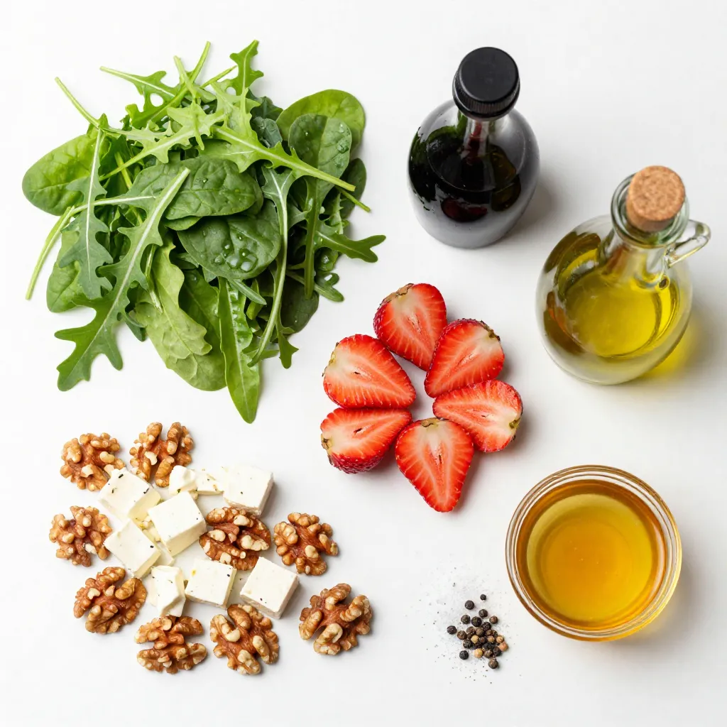 Gather these fresh ingredients for a vibrant Balsamic Strawberry Salad. Start with mixed salad greens. I love using a mix of arugula, spinach, and romaine. Each green adds a different taste and texture.