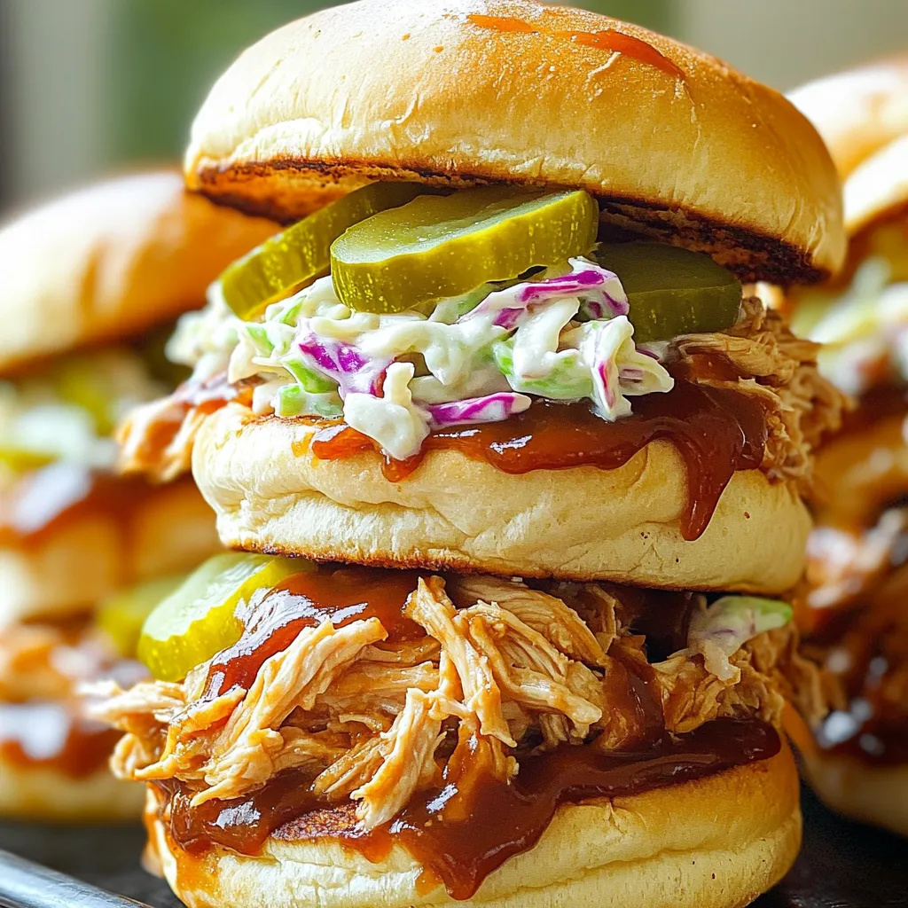 When the chicken is done, take it out of the slow cooker. Use two forks to shred the chicken into bite-sized pieces. Return the shredded chicken to the slow cooker. Mix it with the remaining sauce for about 10 minutes. This helps the chicken soak up all the flavors. While this happens, toast your slider buns lightly. Assemble your sliders by placing a generous amount of pulled chicken on each bun. You can add coleslaw and pickles on top if you want. Enjoy your delicious BBQ pulled chicken sliders!