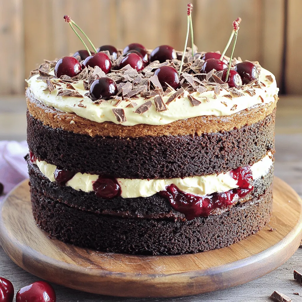 To make a great Black Forest cake, you need a few key ingredients. Each plays a vital role in creating the cake's rich flavor and texture. Here’s what you will need: - For the Chocolate Cake: - 1 ¾ cups all-purpose flour - 1 ¾ cups granulated sugar - ¾ cup unsweetened cocoa powder - 1 ½ teaspoons baking powder - 1 teaspoon baking soda - 1 teaspoon salt - 2 large eggs - 1 cup whole milk - ½ cup vegetable oil - 2 teaspoons vanilla extract - 1 cup boiling water - For the Cherry Filling: - 2 cups fresh or frozen cherries, pitted - ¼ cup granulated sugar - 1 tablespoon cornstarch - 1 tablespoon lemon juice - For the Whipped Topping: - 2 cups heavy whipping cream - ½ cup powdered sugar - 1 teaspoon vanilla extract - For Garnish: - Chocolate shavings - Fresh cherries The cherry filling gives this cake its signature taste. You can use fresh or frozen cherries. I love using fresh cherries when they are in season. They add a bright, juicy flavor. Combine the cherries with sugar, cornstarch, and lemon juice. The sugar brings out their sweetness, while cornstarch helps thicken the mixture. Cooking this mix until it bubbles creates a rich, flavorful filling. Let it cool before using it in your cake. The whipped topping is creamy and light, balancing the rich chocolate and cherries. You will use heavy whipping cream for the best results. Beat it until it thickens, then add powdered sugar and vanilla extract. The sugar adds sweetness, while vanilla gives a lovely aroma. Whip until stiff peaks form for a fluffy topping. This topping is perfect for layering between cake layers and decorating the top. For the full recipe, check out the complete instructions in the recipe section. To start, you need to preheat your oven to 350°F (175°C). Then, grab a large mixing bowl. Combine 1 ¾ cups of all-purpose flour, 1 ¾ cups of granulated sugar, ¾ cup of unsweetened cocoa powder, 1 ½ teaspoons of baking powder, 1 teaspoon of baking soda, and 1 teaspoon of salt. Whisk these dry ingredients until they are well mixed. Next, it’s time for the wet ingredients. Add 2 large eggs, 1 cup of whole milk, ½ cup of vegetable oil, and 2 teaspoons of vanilla extract into the bowl. Mix everything until it’s smooth. Now, carefully pour in 1 cup of boiling water. Mix again, but remember, the batter will be thin and runny. Now that your batter is ready, divide it evenly between two greased 9-inch round cake pans. Place them in your preheated oven. Bake for 30 to 35 minutes. To check if they are done, insert a toothpick in the center. If it comes out clean, your cakes are ready. Once baked, let them cool in the pans for about 10 minutes. Then, transfer the cakes to wire racks to cool completely. After your cakes have cooled, it’s time to assemble them. Carefully slice each cake in half horizontally. This gives you four layers in total. Place one layer on a serving plate. Spread some of the cherry filling on top, then add a layer of whipped cream. Repeat this for the next two layers, stacking them one on top of the other. Finally, place the last layer of chocolate cake on top. Frost the top and sides of your cake with the remaining whipped cream. For the finishing touch, garnish with chocolate shavings and fresh cherries. Your Black Forest Cake is now ready to impress! If you want to see the complete recipe, check out the Full Recipe. To make your Black Forest cake moist, use these tips: - Use fresh ingredients. Fresh eggs and dairy give the best results. - Don't overmix the batter. Mix just until combined for a light texture. - Include boiling water. This step helps the cake rise and stay moist. - Cool the cakes properly. Let them cool in the pans for ten minutes, then move them to a wire rack. To wow your guests, try these decorating ideas: - Layered cherries and cream. Alternate layers of cherries and whipped cream for a beautiful effect. - Top with chocolate shavings. Use a vegetable peeler to create shavings from a chocolate bar. - Fresh cherries as garnish. Place whole cherries on top for a pop of color. - Serve with extra cherry filling. A small bowl of cherry filling on the side looks appealing. Avoid these common mistakes: - Skipping the baking powder. It’s vital for the cake to rise. - Ignoring cake temperature. Ensure cakes are completely cool before frosting. - Using too much cornstarch. This can make the cherry filling too thick. - Rushing the assembly. Take your time to layer and frost carefully. These tips will help you create a beautiful and moist Black Forest cake. For the complete recipe, check out the Full Recipe. {{image_2}} You can make a delicious eggless Black Forest cake. Substitute eggs with yogurt or applesauce. Use ½ cup of yogurt or ¼ cup of applesauce for each egg. This keeps the cake moist. Mix the dry ingredients as usual. Then, add your yogurt or applesauce when you mix wet ingredients. This simple swap makes the cake just as tasty! Making a vegan Black Forest cake is easy too! Replace eggs with flaxseed meal. Mix 1 tablespoon of flaxseed meal with 3 tablespoons of water. Let it sit for five minutes. This creates a great egg substitute. Use almond milk or coconut milk instead of dairy milk. For the whipped topping, you can use coconut cream. Chill it, then whip it like regular cream. Your vegan cake will be rich and creamy! Want to make your cake unique? Try adding coffee to the chocolate batter. This deepens the flavor. You can also mix in orange zest for a fresh twist. It adds a nice citrus note. Consider using different fruits too. Raspberries or strawberries can be great alternatives to cherries. They bring a fun flavor and color to your cake. Get creative and have fun with your Black Forest cake! For a full recipe, check out the [Full Recipe]. To keep your Black Forest Cake fresh, wrap it well. Use plastic wrap or foil. Store it in the fridge. This will help keep the cake moist. It can last for up to five days in the fridge. Make sure to check for any signs of spoilage befo