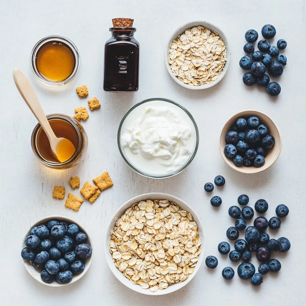 The main ingredients for blueberry cheesecake overnight oats are simple yet tasty. You need rolled oats, which give a hearty base. Milk of your choice makes the oats creamy. Greek yogurt adds a rich texture and tangy flavor. These three main ingredients create the perfect canvas for your oats.