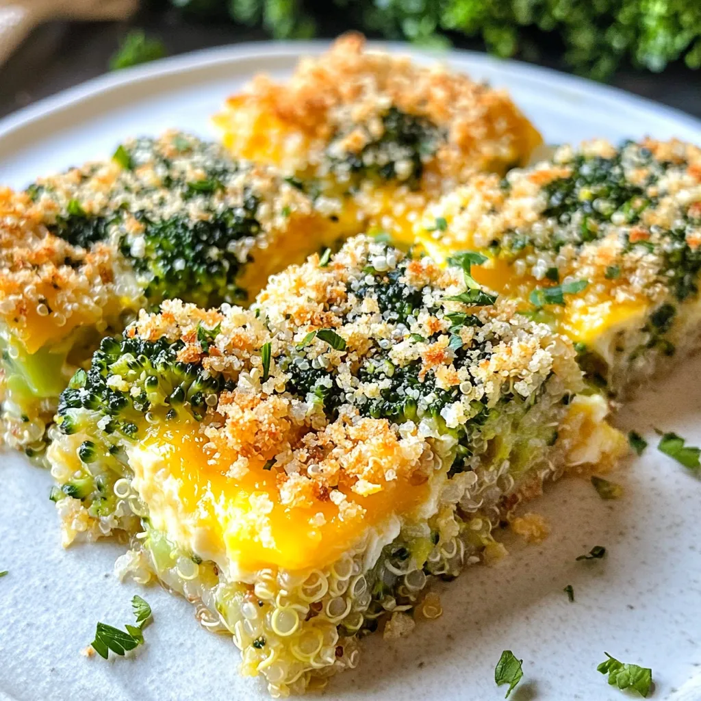 - 1 cup quinoa, rinsed - 2 cups vegetable broth - 2 cups fresh broccoli florets, steamed - 1 cup sharp cheddar cheese, shredded - 1/2 cup cottage cheese - 1/4 cup grated Parmesan cheese - 1/2 cup plain Greek yogurt - 2 large eggs, beaten The main part of this dish is quinoa. Quinoa is a great grain that is full of protein. Rinsing it helps remove bitter flavors. Next, we have fresh broccoli florets. They add a nice crunch and bright color. Sharp cheddar cheese brings a rich taste. Cottage cheese and Greek yogurt make the bake creamy and help with texture. - 1 teaspoon garlic powder - 1 teaspoon onion powder - Salt and pepper to taste - 1/2 cup breadcrumbs (for topping) - 2 tablespoons olive oil Seasonings make this dish pop. Garlic powder and onion powder give a savory flavor. Salt and pepper enhance all the ingredients. For the topping, breadcrumbs mixed with olive oil create a crunchy layer. This adds a nice contrast to the soft bake. Each bite is a mix of creamy and crunchy goodness. {{ingredient_image_1}} First, rinse the quinoa under cold water. This step removes the bitter coating. Then, in a medium pot, bring 2 cups of vegetable broth to a boil. Add the rinsed quinoa, reduce the heat, and cover. Let it simmer for about 15 minutes. Check that all the liquid is absorbed. The quinoa should be fluffy when done. In a large bowl, mix the cooked quinoa and 2 cups of steamed broccoli florets. Add 1 cup of shredded sharp cheddar cheese, 1/2 cup of cottage cheese, and 1/4 cup of grated Parmesan cheese. Then, stir in 1/2 cup of plain Greek yogurt and 2 beaten eggs. Next, season the mixture with 1 teaspoon of garlic powder, 1 teaspoon of onion powder, salt, and pepper to taste. Mix everything well until fully combined. Prepare your baking dish by greasing it with 2 tablespoons of olive oil. Pour the quinoa mixture into the dish, spreading it evenly. In a small bowl, mix 1/2 cup of breadcrumbs with 2 tablespoons of olive oil. Sprinkle this breadcrumb mix on top for a crispy finish. Bake the dish in your preheated oven at 350°F for 25 to 30 minutes. Look for a golden, crunchy top. Let it cool for a few minutes before slicing into squares. Enjoy your delicious Broccoli Cheddar Quinoa Bake! - Rinsing: Always rinse your quinoa under cold water. This removes a bitter coating called saponin. Use a fine mesh strainer for best results. - Boiling: Use two cups of vegetable broth for every cup of quinoa. Bring the broth to a boil before adding your rinsed quinoa. This adds great flavor. To get the right texture, let the quinoa simmer on low heat. Cover it and let it cook for about 15 minutes. The quinoa should be fluffy and the liquid should be absorbed when done. You can swap out cheese based on your needs. Try mozzarella or gouda if you want a different flavor. For a dairy-free option, use vegan cheese. Adding proteins can make this bake heartier. You can stir in cooked chicken, beans, or even tofu. Feel free to throw in other veggies like bell peppers or carrots for more color and nutrients. For a nice presentation, cut the bake into squares. Serve it warm and consider garnishing with fresh herbs like parsley. Pair your quinoa bake with a side salad. A light salad with lemon dressing works well. You can also add some crusty bread for a comforting meal. Pro Tips Cook Quinoa Properly: Always rinse quinoa before cooking to remove any bitterness. Make sure the water is fully absorbed for a fluffy texture. Use Fresh Ingredients: Fresh broccoli not only enhances the flavor but also adds more nutrients. Steaming it lightly retains its vibrant color and crunch. Cheese Variations: Feel free to experiment with different types of cheese like mozzarella or gouda for a unique flavor profile. Let it Rest: Allow the bake to cool slightly before slicing. This helps the layers set and makes for cleaner cuts. {{image_2}} You can switch up the cheese in this bake. Try using Monterey Jack, Gouda, or even a mix. Each cheese brings new flavors. If you want a vegan option, use cashew cheese or a store-bought vegan cheese. These options melt well and still taste great. For more protein, add cooked chicken or beans. Shredded rotisserie chicken works well for a quick option. If you prefer plant-based, chickpeas or black beans add protein and fiber. Both choices make your bake heartier and more filling. Feel free to swap in other vegetables. Spinach, zucchini, or bell peppers are tasty alternatives. You can also use whatever is fresh at your local market. This keeps your dish exciting and in tune with the seasons. Mixing in seasonal veggies can change the flavor and texture too! To store leftovers, let the quinoa bake cool first. Once cooled, cut it into squares. Place the pieces in an airtight container. You can keep it in the fridge for up to four days. This helps keep it fresh and tasty. If you want to enjoy it later, you can reheat it easily. I recommend using glass or BPA-free plastic containers. These containers seal well and protect the bake from air. This way, the flavors stay intact. If you have any extra toppings, store them separately to maintain crunchiness. To freeze the bake, follow these steps. First, let it cool completely. Then, wrap each square tightly in plastic wrap. After that, place the wrapped squares in a freezer-safe bag. This helps prevent freezer burn. You can freeze it for up to three months. When you want to eat it, thaw the bake in the fridge overnight. If you're in a hurry, you can use the microwave. Heat it on low until warm. For best results, reheat in an oven. Preheat your oven to 350°F (175°C) and bake for 15-20 minutes. This will keep the texture nice and cheesy. Yes, you can prepare this dish in advance. First, make the quinoa bake as directed. Once baked, let it cool down. After it cools, store it in an airtight container. You can keep it in the fridge for up to three days. To reheat, place it in a preheated oven at 350°F (175°C) for about 20 minutes. This way, you can enjoy a warm, c