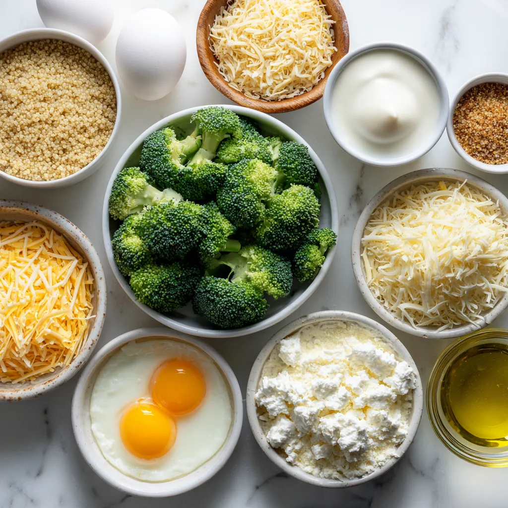 • In a large mixing bowl, combine the cooked quinoa, steamed broccoli florets, shredded cheddar cheese, cottage cheese, grated Parmesan cheese, Greek yogurt, and beaten eggs.