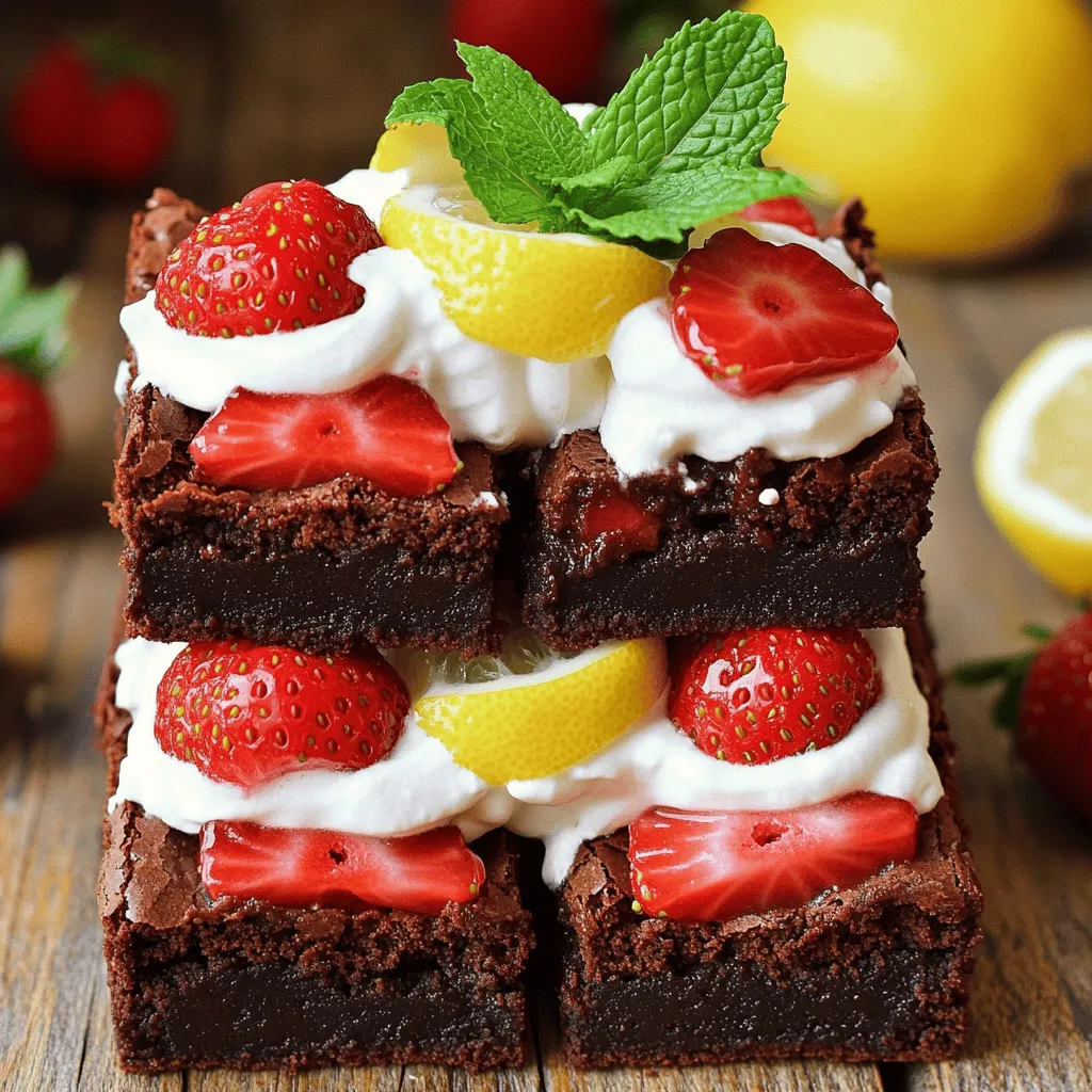 ![- 1 cup unsweetened cocoa powder - 1 cup granulated sugar - 1 cup brown sugar, packed - 1/2 cup unsalted butter, melted - 4 large eggs - 1 teaspoon vanilla extract - 1/2 cup all-purpose flour - 1/4 teaspoon salt - 2 cups fresh strawberries, hulled and sliced - 1 tablespoon lemon juice - 1 cup heavy cream - 2 tablespoons powdered sugar - Optional chocolate drizzle - Fresh mint leaves for garnish - Baking pan - Mixing bowls - Electric mixer (for whipping cream) The ingredients for this brownie strawberry shortcake are simple yet effective. The cocoa powder gives a rich taste. The mix of sugars adds sweetness. Butter provides richness, while eggs bind everything together. Vanilla brings warmth to the flavor. Flour and salt balance the mix. Fresh strawberries add a juicy and fruity bite. Lemon juice brightens the strawberries’ flavor. Heavy cream becomes a fluffy topping when whipped. Powdered sugar sweetens the cream perfectly. You can add a chocolate drizzle for extra flair. For equipment, a baking pan helps shape the brownies. Mixing bowls are essential for combining ingredients. An electric mixer makes whipping cream easy and quick. You can find all these ingredients and tools at your local store. This recipe is well-rounded. You get rich brownies, sweet strawberries, and creamy whipped cream. Enjoy the balance of flavors and textures in every bite. I love how simple it is to make this treat delicious and beautiful. You can find the full recipe above. 1. Preheat oven and prepare baking pan: Set your oven to 350°F (175°C). Grease a 9x9-inch baking pan. Line it with parchment paper, leaving some overhang. This helps with easy removal later. 2. Mixing dry ingredients: In a big bowl, whisk together 1 cup cocoa powder, 1 cup granulated sugar, 1 cup brown sugar, 1/2 cup flour, and 1/4 teaspoon salt. Make sure everything blends well. 3. Incorporating wet ingredients: Add 1/2 cup melted butter to the dry mix. Stir until smooth. Next, add 4 large eggs, one at a time. Then, mix in 1 teaspoon vanilla extract until well combined. 1. Pouring and spreading the batter: Pour your brownie batter into the prepared pan. Use a spatula to spread it out evenly. 2. Baking time and checking for doneness: Bake for 25-30 minutes. To check if they are done, insert a toothpick in the center. It should come out with a few moist crumbs. 3. Cooling brownies before assembly: Once baked, let the brownies cool completely in the pan. Place them on a wire rack. After they cool, lift them out using the parchment paper and cut them into squares. 1. Macerating the strawberries with lemon juice: In a bowl, mix 2 cups hulled and sliced strawberries with 1 tablespoon lemon juice. Let them sit for about 15 minutes. This softens them and brings out their sweetness. 2. Preparing the whipped cream: In another bowl, whip 1 cup heavy cream and 2 tablespoons powdered sugar together. Beat until soft peaks form. This creates a light and fluffy topping. 3. Tips for achieving perfect whipped cream: To get the best whipped cream, use cold cream and a chilled bowl. This helps it whip faster and hold its shape better. Now, you have all the steps to create this luscious Brownie Strawberry Shortcake delight! For the full recipe, check [Full Recipe]. To make your brownies just right, avoid over-mixing your batter. When you mix too much, the brownies can become tough. Mix until the flour disappears, and then stop. This keeps the brownies soft and chewy. Next, aim for the ideal brownie texture. You want them fudgy, not cakey. Check them in the oven around 25 minutes. When a toothpick comes out with a few moist crumbs, they are done. Let them cool completely before cutting to help maintain their shape. When you assemble your dessert, think about layering. Start with a brownie square, then add strawberries and whipped cream. Repeat the layers for a tall treat. This creates a beautiful, tasty dessert. For a nice plate presentation, use a drizzle of chocolate sauce. Place a mint leaf on top for color. This adds a fresh touch, making your dessert look as good as it tastes. You can use alternative sweeteners in your whipped cream. Try honey or maple syrup for a different flavor. This can make your cream lighter and still sweet. To boost the flavor, add extracts. A drop of almond or orange extract can elevate your whipped cream. This small change can make a big difference in taste. For the full recipe, check out the complete guide to Brownie Strawberry Shortcake. {{image_2}} You can switch up the fruit toppings for this dessert. Instead of strawberries, try raspberries or blueberries. They add a nice tartness. You can also mix in nuts or chocolate chips into the brownie batter. Walnuts or pecans give a nice crunch. Chocolate chips add more chocolate flavor. Both options make the brownies even more exciting. If you want vegan options, you can replace eggs with applesauce or flaxseed. Use plant-based butter and coconut cream for the whipped topping. For gluten-free brownies, swap all-purpose flour with almond flour or a gluten-free blend. This way, everyone can enjoy this dessert. You can serve this treat in fun ways. Individual dessert cups are great for parties. Layer the brownies, whipped cream, and fruit in clear cups. This looks pretty and makes it easy to serve. Another idea is to layer all the ingredients in a trifle dish. This big dessert looks impressive and is perfect for sharing. To keep your dessert layers fresh, store them in a cool, dry place. Use an airtight container to prevent moisture from ruining the brownies or whipped cream. If you have leftover strawberries, keep them in the fridge. You can also layer the components in a container to save space. For reheating brownies, place them in the microwave for 10-15 seconds. This will make them soft and warm. In the refrigerator, your Brownie Strawberry Shortcake will last about 3 days. If you want to keep it longer, you can freeze it. Wrap the brownies tightly in plastic wrap and then in