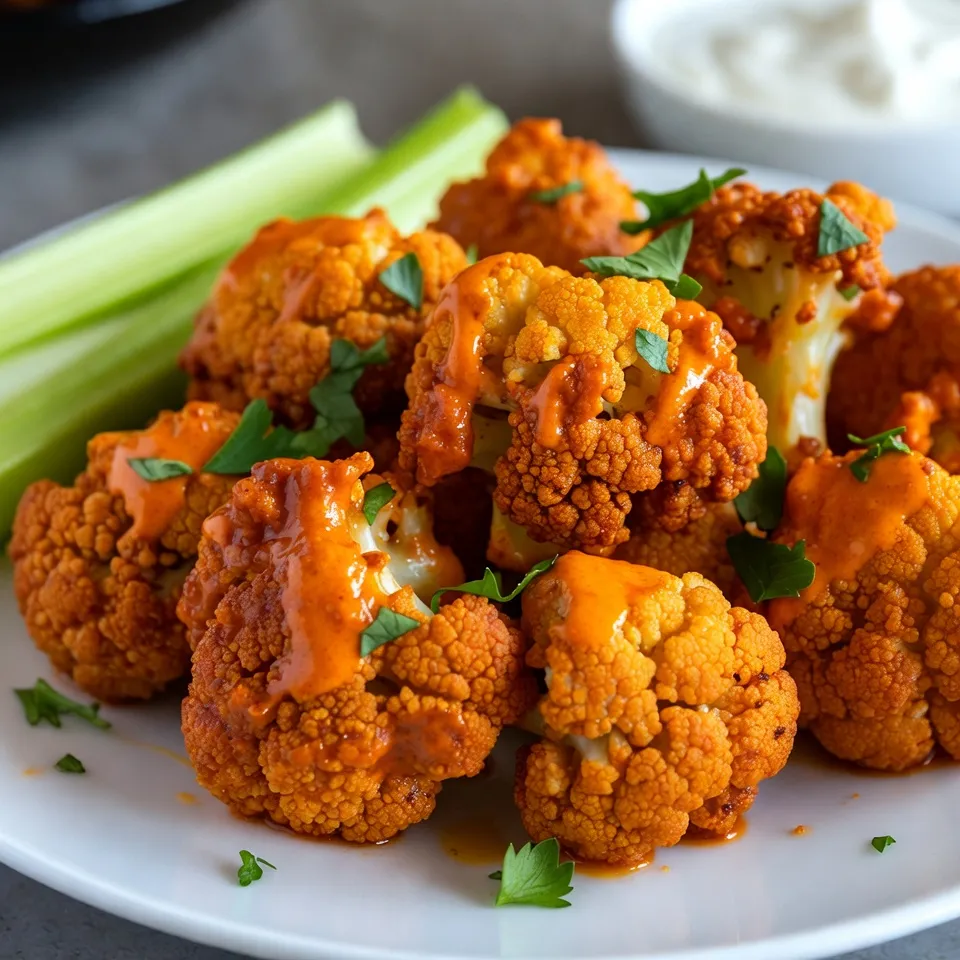 Crispy cauliflower florets coated in spicy buffalo sauce, perfect as a snack or appetizer.