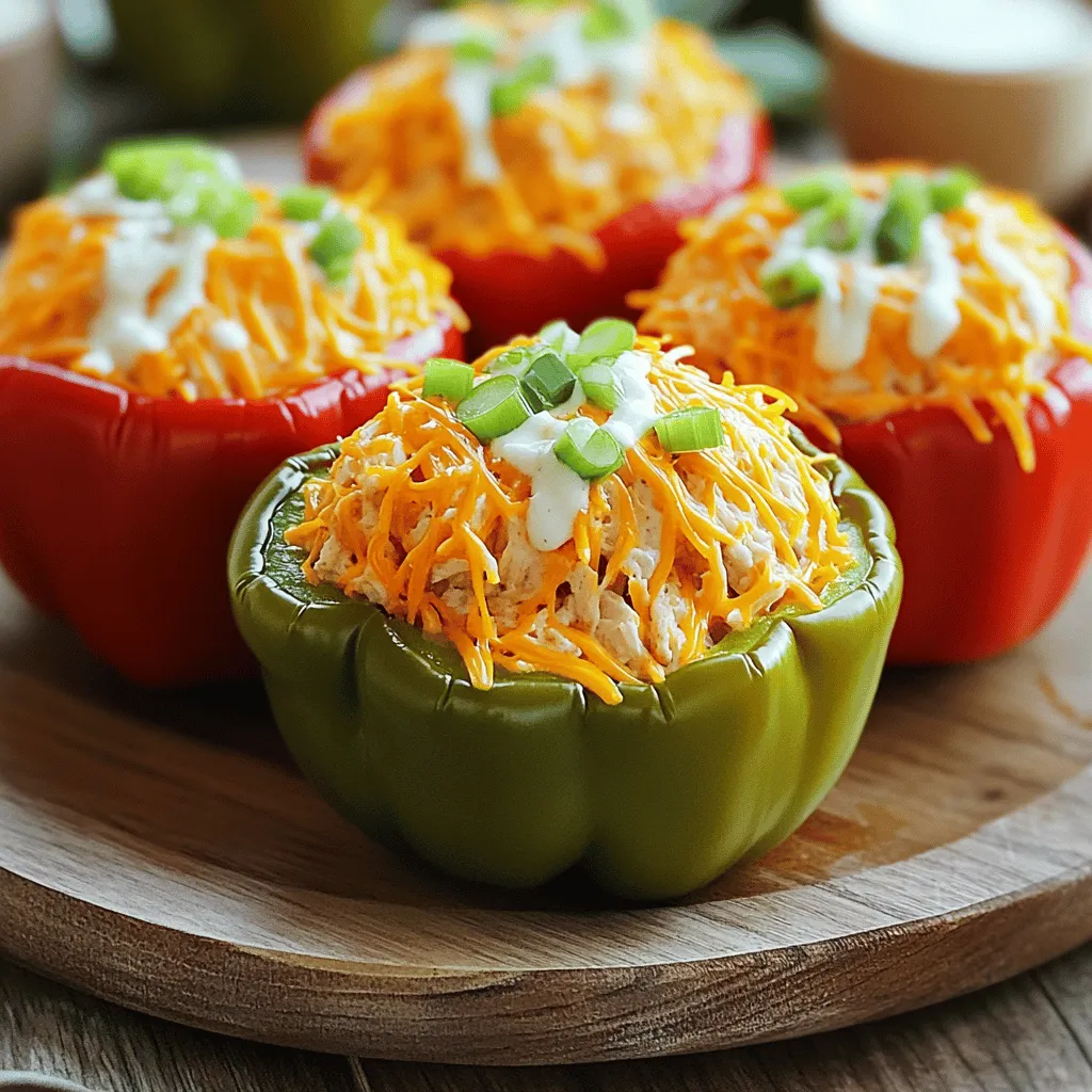 - 4 large bell peppers (any color) - 2 cups cooked chicken, shredded - 1/2 cup buffalo sauce - 1 cup cream cheese, softened - 1/2 cup shredded cheddar cheese - 1/4 cup diced green onions - 1/4 cup ranch dressing - Salt and pepper to taste - Olive oil spray for baking Selecting fresh bell peppers: Look for peppers with bright skin. They should feel firm and heavy. If they have soft spots, skip them. Choosing the right buffalo sauce: Pick a sauce that matches your heat level. Some sauces pack a punch, while others are milder. Taste a bit before using it. Recommended types of chicken: Use rotisserie chicken for ease. You can also boil or bake your chicken. Just make sure it is fully cooked and shredded for the best texture. For the Full Recipe, check the details above. First, preheat your oven to 375°F (190°C). This makes sure the peppers cook well. Next, take four large bell peppers and cut off their tops. Remove the seeds and any white parts inside. Rinse them under water to clean. Lightly spray the outside of each pepper with olive oil. This helps them brown nicely. Place them upright in a baking dish. In a large bowl, mix two cups of shredded chicken with half a cup of buffalo sauce. You can adjust the amount of sauce to your taste. Then, add one cup of softened cream cheese and half a cup of shredded cheddar cheese. Don’t forget to include a quarter cup of diced green onions and a quarter cup of ranch dressing. Mix everything together until all the chicken is coated well. Season with salt and pepper to taste. Now, it’s time to stuff the peppers. Use a spoon to fill each pepper with the chicken mixture. Pack it in firmly so they hold together. Cover the baking dish with aluminum foil. Bake for 25 minutes. After that, take off the foil and bake for another 10 to 15 minutes. This lets the filling get bubbly and the peppers tender. Let the stuffed peppers cool for a few minutes before serving. Enjoy your meal! For more details, check the Full Recipe. Adjusting the spiciness of your buffalo chicken stuffed peppers is key. You can control heat by changing the amount of buffalo sauce. If you want a milder dish, use less sauce. If you love heat, add more! You can also try different brands of buffalo sauce. Some are hotter than others. For extra flavor, think about add-ins. You can mix in black beans, corn, or even diced celery. These ingredients add texture and taste. Another great idea is to sprinkle in some spices. Garlic powder or smoked paprika can elevate the flavor. You can use different cooking methods for these stuffed peppers. If you own an air fryer, it can cook them quickly and keep them crispy. Set it to 375°F (190°C) and cook for about 15-20 minutes. A slow cooker is another option. It takes longer, around 4 hours on low, but makes the peppers soft and full of flavor. For even cooking, make sure to cut the peppers to the same size. This helps them cook at the same rate. If you want a nice texture, consider roasting the peppers briefly before stuffing them. This gives them a charred, smoky flavor. Garnishing your stuffed peppers makes them look great! Use fresh green onions and a drizzle of ranch dressing on top. This adds color and flavor. You can also serve them with a side of celery sticks and carrot sticks. They’re crunchy and refreshing. For side dishes, think about a light salad or some crispy sweet potato fries. These pair well with the rich flavors of the peppers. If you want a heartier side, try serving them with rice or quinoa. They balance the meal and add more filling options. {{image_2}} You can easily make these stuffed peppers vegetarian! First, substitute chicken with plant-based protein. Options like shredded jackfruit or tofu work well. Next, adjust the sauces. Use a spicy buffalo sauce without animal products. You can also add some vegan cream cheese for creaminess. Want to mix it up? You can add more ingredients. Try black beans or cooked quinoa for extra texture. For flavor, switch to BBQ sauce or taco seasoning. Both options give a fun twist. They add a new taste to each bite. Not all peppers are the same. Explore different types for your dish. Jalapeños add heat, while poblanos offer a rich flavor. Remember that pepper size matters. Larger peppers take longer to cook. Smaller ones need less time. Choose based on your preference! To keep your stuffed peppers fresh, store them in the fridge. Place them in an airtight container. This helps keep the flavors intact and prevents drying. You can also wrap them tightly in plastic wrap. Make sure to eat them within three to four days for the best taste. When you reheat stuffed peppers, avoid the microwave if possible. Instead, use the oven. Preheat it to 350°F (175°C). Place the peppers in a baking dish and cover with foil. This keeps them moist. Heat for about 15-20 minutes. You can also serve with extra ranch dressing or green onions for a fresh touch. If you want to freeze your stuffed peppers, do it before cooking. Wrap each pepper in plastic wrap and place them in a freezer bag. This way, they stay fresh for up to three months. When you’re ready to eat, take them out and thaw overnight in the fridge. Bake them at 375°F (190°C) until hot and bubbly, about 30-35 minutes. This process keeps the flavors strong and the peppers tender. For the complete recipe, check the Full Recipe above. Can I make Buffalo Chicken Stuffed Peppers ahead of time? Yes, you can prepare these stuffed peppers a day in advance. Just stuff the peppers, cover them, and store them in the fridge. Bake them when you are ready to eat. This makes dinner easy! What can I substitute for cream cheese? If you don’t have cream cheese, try using Greek yogurt or sour cream. These give a creamy texture with fewer calories. You could also use a dairy-free cream cheese for a vegan option. How do I make them gluten-free? This recipe is already gluten-free! Just make sure the buffalo sauce and ranch dressing you use are gluten-free. Always c