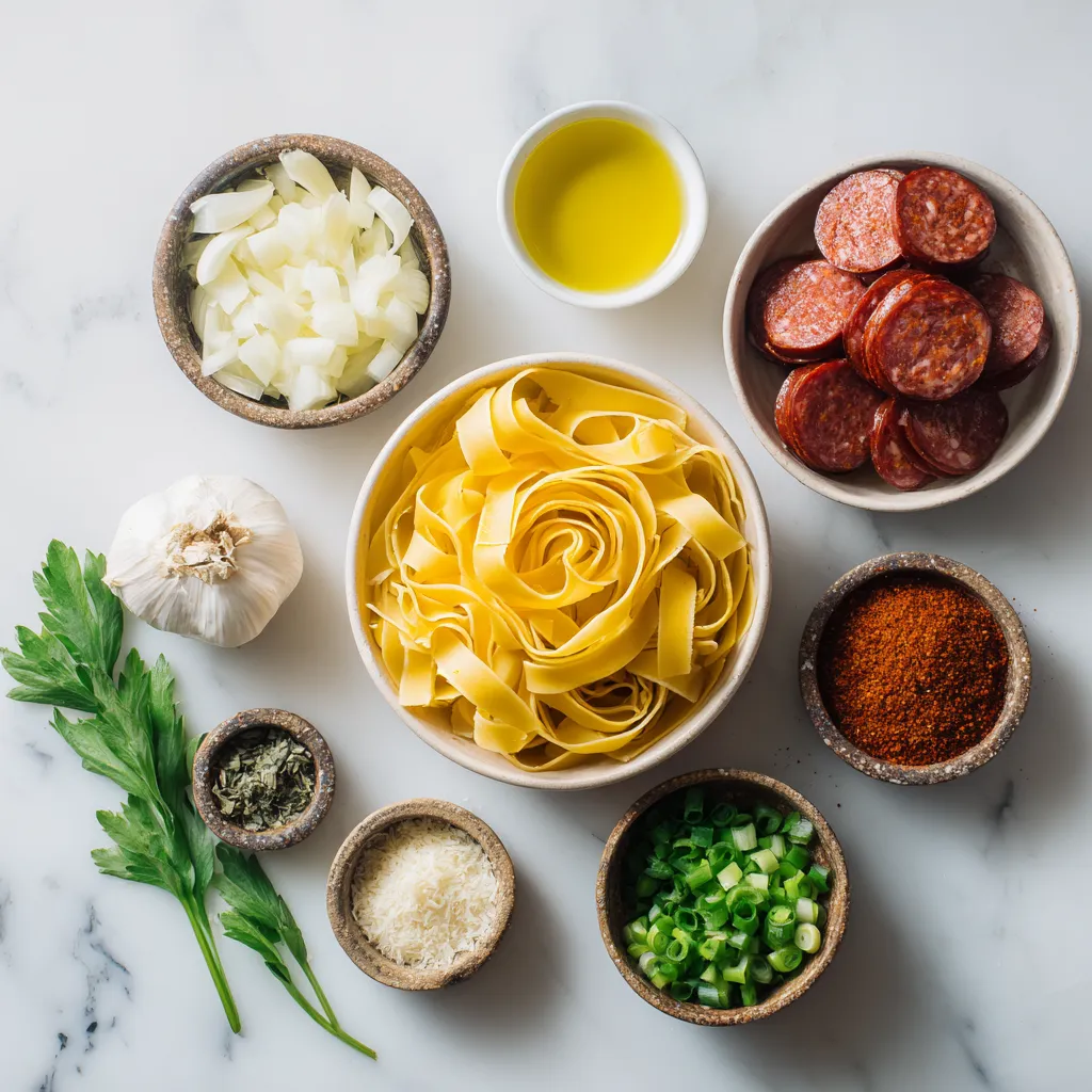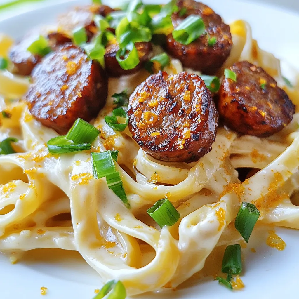 A creamy and spicy pasta dish featuring fettuccine, smoked sausage, and a rich Alfredo sauce.