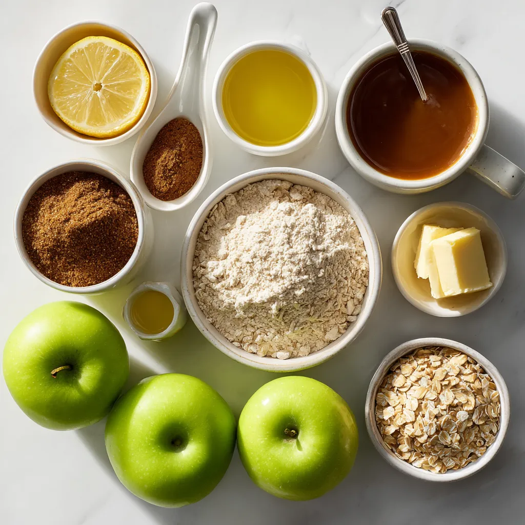 Cinnamon and nutmeg bring warmth and spice. They enhance the apple flavor. You also need some flour for the apple mix and the crumb topping. Rolled oats give the topping a hearty texture. Finally, use unsalted butter for richness and caramel sauce to drizzle on top for that sweet, sticky goodness.