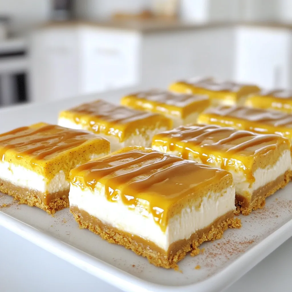 Carefully pour the cheesecake filling over the cooled crust. Spread it out evenly. Bake in the oven for 28-32 minutes. The edges should be set, but the center can still jiggle a little. Once done, take it out and let it cool in the dish for at least one hour. After that, place it in the fridge for at least four hours, or overnight if you can wait. When chilled, lift the cheesecake bars out of the dish using the parchment paper edges. Cut them into squares. Drizzle with caramel sauce just before serving to add that sweet touch!