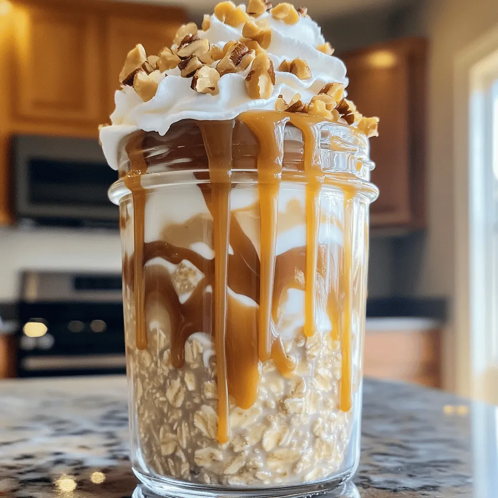 ![To make delicious caramel macchiato overnight oats, gather these key ingredients: - 1 cup rolled oats - 1 cup unsweetened almond milk (or any milk of choice) - 1 tablespoon chia seeds - 1 tablespoon vanilla extract - 2 tablespoons maple syrup (adjust to taste) - 1 teaspoon espresso granules (or instant coffee) - 1/4 cup caramel sauce (plus extra for drizzling) - 1/2 teaspoon cinnamon - Pinch of salt These ingredients work together to create a creamy and sweet breakfast. The oats soak up the flavors overnight, making them rich and satisfying. Add fun and flavor with these toppings: - Whipped cream - Chopped nuts - Additional caramel sauce These toppings not only enhance taste but also add texture to your oats. You can mix and match based on what you like best. If you want to change things up, here are some easy swaps: - Use any milk, like soy, oat, or coconut, for a different taste. - Swap maple syrup for honey or agave syrup if needed. - For a caffeine-free option, skip espresso granules or use decaf coffee. These substitutions let you customize your oats while keeping the core flavor intact. Enjoy experimenting! For the full recipe, check out the [Full Recipe]. To start, gather all your ingredients. You will need: - 1 cup rolled oats - 1 cup unsweetened almond milk (or any milk of choice) - 1 tablespoon chia seeds - 1 tablespoon vanilla extract - 2 tablespoons maple syrup (adjust to taste) - 1 teaspoon espresso granules (or instant coffee) - 1/4 cup caramel sauce (plus extra for drizzling) - 1/2 teaspoon cinnamon - Pinch of salt - Optional toppings: whipped cream, chopped nuts, or additional caramel sauce In a medium bowl, mix the rolled oats, almond milk, chia seeds, and vanilla extract. Add the maple syrup, espresso granules, cinnamon, and a pinch of salt. Stir well to combine. Next, grab a jar or container. Pour half of the oat mixture into the jar. Then, add 2 tablespoons of caramel sauce on top. This step creates a sweet layer of flavor. After that, pour the rest of the oat mixture on top of the caramel layer. Seal the jar tightly with a lid to keep everything fresh. Refrigerate your jar overnight, or for at least 4 hours. This soaking time allows the oats to absorb the milk and soften. When you're ready to enjoy, stir the oats well. This mixes in the caramel and flavors. To make it extra special, top with whipped cream, chopped nuts, and an extra drizzle of caramel sauce. Enjoy your creamy, delicious Caramel Macchiato Overnight Oats! For the full recipe, check out the detailed instructions. To boost the taste of your caramel macchiato overnight oats, try these ideas: - Add more spices: A pinch of nutmeg or cardamom can add warmth. - Use flavored milk: Almond or oat milk with vanilla can enhance the taste. - Experiment with sweeteners: Try honey or agave syrup instead of maple syrup. These small changes can make your oats even more delightful. Chia seeds are a great addition. They help thicken your oats and add nutrition. Here’s how to use them well: - Soak them: Chia seeds need liquid to expand, so mix them in early. - Mix well: Stir the mixture well to avoid clumps. - Use the right amount: One tablespoon per cup of oats is a good rule. Following these tips will ensure the best texture in your overnight oats. This recipe is easy to make vegan. Here’s how to ensure it stays plant-based: - Choose dairy-free milk: Use almond, soy, or oat milk. - Use vegan caramel: Look for caramel sauce made without dairy. - Check maple syrup: Most are vegan, but always read the label. With these swaps, anyone can enjoy this tasty breakfast! {{image_2}} You can switch up the flavors in your Caramel Macchiato Overnight Oats. Try adding cocoa powder for a chocolate twist. You can also mix in pumpkin spice for a fall vibe. If you love nuts, add some almond or hazelnut extract. These changes add new tastes without much effort. To make your oats even healthier, think about adding some chia seeds or flaxseeds. These seeds pack a punch of fiber and omega-3s. You can also toss in some fresh fruits like berries or banana slices. They add natural sweetness and nutrients. Try a spoonful of nut butter for creaminess and protein. When it's time to serve, you can get creative. Top your oats with whipped cream to make it fancy. Chopped nuts can add crunch. For more caramel flavor, drizzle extra caramel sauce on top. You can also layer it in a clear glass to show off those beautiful layers. Enjoy your oats cold or warm them up a bit if you prefer! Store your caramel macchiato overnight oats in a sealed jar. Glass jars work best. Make sure the lid is tight to keep the oats fresh. You can also use plastic containers. Just ensure they are airtight. These oats stay fresh in the fridge for up to five days. The flavors will blend more over time. If you notice any off smells or odd textures, it's best to toss them. Keep an eye on the caramel sauce; it may thicken as it sits. You can enjoy these oats cold or warm. If you prefer them warm, scoop the oats into a bowl. Heat them in the microwave for 30 seconds. Stir and check the temperature. Add a splash of almond milk if they seem too thick. Enjoy your creamy, caramel delight! For the full recipe, check out the details above. Yes, you can use many types of milk. Almond milk is great, but you can also try oat milk, coconut milk, or regular dairy milk. Each option gives a unique taste. If you want a creamier texture, choose whole milk or a nut milk. To make it dairy-free, simply use any plant-based milk. Almond, soy, or oat milk works well. You can also skip the whipped cream topping or use a dairy-free version. This way, you can enjoy the flavor without dairy. Yes, you can prep it the night before. Just follow the steps and let it soak overnight. You can also make it for the whole week. Store each jar in the fridge. This makes a quick breakfast option. Leftovers can last for about three days in the fridge. You can eat them cold or warm them up. If the oats seem dry, add