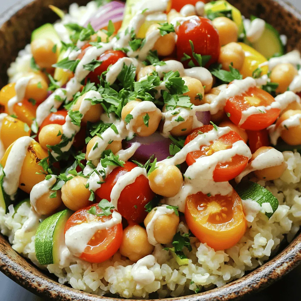 ![- 1 medium head of cauliflower, riced - 1 tablespoon olive oil - 1 teaspoon cumin - 1 teaspoon smoked paprika - 1 bell pepper, diced (any color) - 1 small red onion, diced - 1 zucchini, diced - 1 cup cherry tomatoes, halved - 1 cup chickpeas, drained and rinsed - 2 tablespoons tahini - 2 tablespoons lemon juice - Salt and pepper to taste - Fresh parsley, chopped, for garnish The main star of this dish is the riced cauliflower. It gives a light and fluffy base. I love how it soaks up flavors from spices and veggies. The olive oil adds a nice richness and helps the spices stick. Spices like cumin and smoked paprika bring warmth and depth. Next, we add colorful vegetables. Bell peppers add crunch and sweetness. Red onion gives a sharp, savory taste. Zucchini adds a nice texture. Cherry tomatoes burst with juicy flavor. The chickpeas provide protein and a satisfying bite. Finally, the tahini dressing ties everything together. It adds creaminess and tang. A squeeze of lemon juice brightens the dish. This bowl is not just healthy; it's a feast for the senses. You can find the Full Recipe above for this vibrant cauliflower rice bowl. Enjoy your cooking! First, take your medium head of cauliflower. Remove the outer leaves and stem. Cut it into small florets. Now, you can rice the cauliflower using a food processor. Pulse the florets until they look like grains of rice. If you don’t have a food processor, use a box grater to achieve the same effect. Next, heat one tablespoon of olive oil in a large skillet over medium heat. Add the diced red onion and bell pepper. Sauté for about five minutes. You want them to soften a bit before adding more ingredients. Now it's time to add some flavor. Stir in one teaspoon of cumin and one teaspoon of smoked paprika. Cook for another minute. This step toasts the spices and brings out their taste. After that, add the diced zucchini. Cook it for three to four minutes. You want the zucchini to become tender but not mushy. Once that's done, add your riced cauliflower and one cup of drained and rinsed chickpeas. Remember to season with salt and pepper. Stir well and cook for about five to six minutes. The cauliflower should be tender by now. While your cauliflower mix cooks, let’s make the tahini dressing. In a small bowl, whisk together two tablespoons of tahini and two tablespoons of lemon juice. If the dressing is too thick, add a little water. Stir until you reach your desired consistency. Once the cauliflower rice is ready, remove it from the heat. Stir in one cup of halved cherry tomatoes. This adds freshness to the dish. Now, you can spoon the cauliflower rice mixture into bowls. Drizzle with the tahini dressing and garnish with chopped parsley for a burst of flavor. For the full recipe, check [Full Recipe]. Enjoy your tasty and colorful cauliflower rice bowl! To avoid mushy cauliflower rice, start with fresh cauliflower. When you rice it, aim for small, even pieces. If the pieces are too small, they may turn mushy. Cook the cauliflower on medium heat, not high. Stir it gently, and make sure it cooks evenly. This helps maintain a nice, firm texture. Want more flavor? Try adding spices like garlic powder or chili flakes. Fresh herbs like cilantro or basil can also add great taste. If you prefer a different dressing, consider yogurt or balsamic vinaigrette. Both can make your bowl pop with flavor. Preparing ingredients ahead saves time. You can rice the cauliflower and chop veggies in advance. Store them in airtight containers in the fridge. For cooked cauliflower rice, let it cool before storing it. Keep it in the fridge for up to four days. This way, you’ll always have a quick meal option ready. Check out the Full Recipe for a delicious way to enjoy your bowl! {{image_2}} You can change up your cauliflower rice bowl with fresh veggies. Use seasonal vegetables like carrots, peas, or broccoli. These add color and flavor. Try adding creamy avocado or bright spinach for a fun twist. Both can make your meal richer and more filling. Explore different proteins to enhance your dish. You can use grilled chicken, shrimp, or steak for a meat option. If you prefer plant-based proteins, chickpeas are a great choice. Other options include tofu or tempeh. These can give your bowl a hearty texture and boost nutrition. Add crunch with nut and seed toppings. Try almonds, sunflower seeds, or pumpkin seeds for extra texture. Don't forget about sauces! A drizzle of soy sauce, sriracha, or homemade pesto can add a burst of flavor. You can also layer in fresh herbs like cilantro or basil for an extra pop. Check out the Full Recipe for more ideas! To store your cauliflower rice bowl leftovers, let it cool first. Place the rice in an airtight container. It keeps well in the fridge for up to four days. When you want to reheat, scoop out a serving. Use a microwave or a skillet on low heat. Stir occasionally to heat evenly. Add a splash of water if it feels dry. Freezing cooked cauliflower rice is simple. First, let it cool completely. Then, portion it into freezer-safe bags or containers. Remove as much air as you can before sealing. Label the bags with the date. It can last for up to three months in the freezer. To thaw, move the cauliflower rice to the fridge overnight. You can also thaw it in the microwave. Just use the defrost setting for a few minutes. When ready to use, heat it in a skillet or microwave until hot. Enjoy it in your next meal! Cauliflower rice is simply cauliflower that you chop into small pieces. It looks like rice but is lower in carbs. This veggie is packed with vitamins C and K. It also has fiber, which helps with digestion. Plus, cauliflower rice is gluten-free and great for weight loss. You can use it in many dishes. It makes a healthy base for meals, adding flavor and nutrients without extra calories. Yes, you can use frozen cauliflower rice. Frozen rice is convenient and saves time. It’s already cut, so you don't need to rice it yourself. However