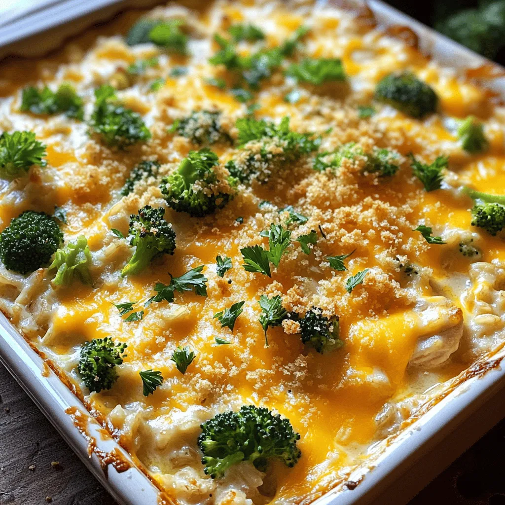 ![- 2 cups cooked brown rice - 1 pound boneless, skinless chicken breasts, diced - 2 cups fresh broccoli florets - 1 cup shredded cheddar cheese - 1/2 cup cream cheese, softened - 1 cup chicken broth - 1 cup milk - 1 teaspoon garlic powder - 1 teaspoon onion powder - 1/2 teaspoon paprika - Salt and pepper to taste - 1/2 cup breadcrumbs (optional for topping) To make this Cheesy Chicken Broccoli Rice Bake, you need some key ingredients. First, use cooked brown rice as your base. It adds great texture and is healthy. Next, add diced chicken breasts. They are the star of the dish. You want them tender and juicy. Now, let’s talk about the broccoli. Fresh florets add color and crunch. They also boost the nutrition of this dish. For the creamy part, you will need cheddar and cream cheese. The cheddar cheese melts beautifully, while the cream cheese makes it rich and smooth. Don’t forget the chicken broth and milk. They help blend all the flavors. Spices like garlic powder, onion powder, and paprika give the dish great taste. Adjust salt and pepper to your liking. Finally, if you want a crunchy topping, breadcrumbs are a nice option. They add a lovely texture contrast. All these ingredients create a warm and cozy dish. Make sure to check the Full Recipe for detailed steps! - Preheat your oven to 350°F (175°C). Grease a 9x13 inch baking dish with cooking spray or butter. - In a large skillet over medium heat, cook 1 pound of diced, boneless, skinless chicken breasts until golden brown, about 5-7 minutes. Season it with 1 teaspoon garlic powder, 1 teaspoon onion powder, 1/2 teaspoon paprika, and salt and pepper to taste. - In a large bowl, mix 2 cups of cooked brown rice, the cooked chicken, 2 cups of fresh broccoli florets, 1/2 cup of softened cream cheese, 1 cup of chicken broth, and 1 cup of milk. Stir until everything is evenly combined. - Once mixed, add 1/2 cup of shredded cheddar cheese and adjust the seasoning if needed. You want it to taste just right. - Pour the mixture into your prepared baking dish and spread it evenly. - Top with the remaining 1/2 cup of shredded cheddar cheese. If you like a crunch, sprinkle 1/2 cup of breadcrumbs on top. - Bake in the preheated oven for 25-30 minutes. You want the cheese to melt and bubble. The top should turn golden brown. - To check for doneness, look for a bubbly surface and a golden color. Let it cool for a few minutes before serving. For the full recipe, check the [Full Recipe]. To keep your chicken moist, cook it just until golden. Overcooking makes it dry. Use a meat thermometer to check for doneness at 165°F (74°C). This will help you serve juicy chicken every time. For perfect broccoli, steam it for just a few minutes. You want it bright green and tender-crisp. If you cook it too long, it gets mushy. You can also sauté broccoli in a pan with a bit of oil. This adds extra flavor. For a rich and creamy bake, I love using cheddar cheese. It melts well and provides a great flavor. You can also mix in mozzarella for extra stretchiness. If you want a sharp taste, try a bit of Gruyère. When melting cheese, add it near the end of cooking. This keeps it from clumping. Stir gently as it melts to create a smooth texture. You can also mix in a little milk for a creamier result. Pair your Cheesy Chicken Broccoli Rice Bake with a fresh salad. A simple green salad with a light vinaigrette works well. You can also serve it with garlic bread for a comforting meal. For garnishing, add fresh parsley on top right before serving. It adds color and freshness. You can also sprinkle more cheese on top once it comes out of the oven for that extra cheesy touch. For the full recipe, check the earlier section. {{image_2}} You can switch chicken for turkey or tofu. Turkey gives a leaner taste, while tofu suits plant lovers. Cooked sausage or ham also adds great flavor. Simply mix them in with the rice and broccoli. Feel free to add other vegetables. Carrots, peas, or bell peppers work well. Fresh veggies are tasty, but frozen ones save time and still taste good. Just toss them in without thawing. For a low-carb option, use cauliflower rice instead of brown rice. It’s light and still filling. If you need a gluten-free choice, skip the breadcrumbs or find gluten-free ones. Enjoy the same cheesy goodness without worry. To keep your Cheesy Chicken Broccoli Rice Bake fresh, store leftovers in the fridge. Use airtight containers to prevent drying out. I recommend glass or plastic containers with tight-fitting lids. These containers can help keep flavors intact and avoid spills. If you want to save some for later, freezing is easy. First, let the bake cool completely. Then, transfer it into freezer-safe containers or heavy-duty freezer bags. Label them with the date. When you want to eat it, thaw overnight in the fridge. Reheat in the oven at 350°F until hot. You can also use the microwave, but the oven keeps it crispy. In the fridge, your bake will stay good for about 3 to 4 days. If you freeze it, it can last up to 3 months. However, for best taste, try to eat it sooner. Always check for any signs of spoilage before eating. It takes about 15 minutes to prep. Baking takes 25-30 minutes. So, you can enjoy this dish in about 45 minutes. Yes, you can prep everything a day ahead. Just mix all the ingredients and store them in the fridge. When ready, bake it straight from the fridge. This way, you save time on busy days. You can use Greek yogurt for a lighter option. Sour cream works too, adding creaminess. Both will give a nice texture without changing the taste much. Absolutely! Swap out the chicken for chickpeas or tofu. Use vegetable broth instead of chicken broth. Add more veggies like bell peppers or carrots for a heartier meal. Yes, you can reheat leftovers easily. Use the oven at 350°F for about 15-20 minutes. This helps keep the dish moist. Microwaving works too, but it may dry out the rice. Enjoy your delicious Cheesy Chicken Broccoli Rice Bake! For the F