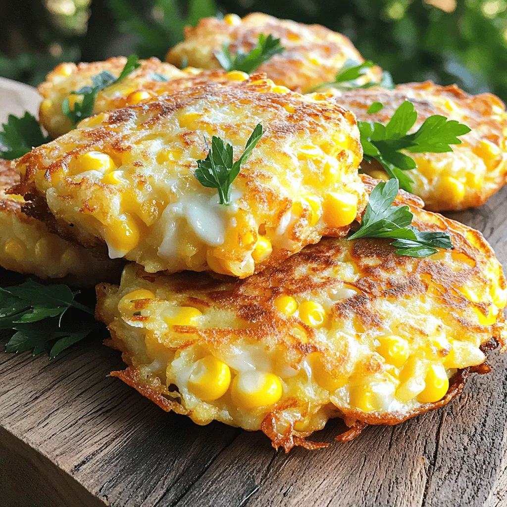 ![To make Cheesy Corn Fritters, you need a few key items. Here’s what you will use: - 1 cup fresh or frozen corn kernels - 1 cup all-purpose flour - ½ cup shredded cheese (cheddar or mozzarella work great) - 1 large egg - ½ cup milk - 1 teaspoon baking powder - ½ teaspoon garlic powder - ½ teaspoon onion powder - Salt and pepper to taste - Oil for frying These ingredients create a delightful base for the fritters. The corn gives sweetness, while the cheese adds creaminess. Garnishes can turn a simple dish into something special. Here are some ideas: - 2 tablespoons chopped fresh parsley (for garnish) - A sprinkle of chili flakes for heat - A dollop of sour cream or yogurt - Fresh chives for extra color These extras can enhance the look and taste of your fritters. You can mix and match to find what you enjoy most. Choosing the right cheese can make a big difference. Here are some great options: - Cheddar: It melts well and has a sharp taste. - Mozzarella: It’s mild and adds a nice stretch. - Pepper Jack: If you like spice, this cheese is a fun choice. - Feta: For a tangy twist, crumbled feta works beautifully. These cheeses bring their unique flavors to the fritters. You can even mix different types for a richer taste. For the complete recipe, check out the [Full Recipe]. Start by gathering your dry ingredients. In a mixing bowl, combine: - 1 cup all-purpose flour - 1 teaspoon baking powder - ½ teaspoon garlic powder - ½ teaspoon onion powder - Salt and pepper to taste Mix them well to make sure they blend evenly. This mix creates the base for your fritters. In a separate bowl, whisk together: - 1 large egg - ½ cup milk This will be your wet mixture. Next, add in: - 1 cup fresh or frozen corn kernels - ½ cup shredded cheese Stir it all together until the corn and cheese are well mixed. Now, pour this mixture into the bowl with your dry ingredients. Be gentle as you mix. A few lumps are okay, so don't overdo it! Heat about ½ inch of oil in a frying pan over medium heat. To check if the oil is hot enough, drop a small amount of batter into it. If it sizzles, you’re good to go! Using a spoon or a small ice cream scoop, drop spoonfuls of the batter into the hot oil. Fry them for about 3-4 minutes until they turn golden brown. Flip the fritters and cook for another 3-4 minutes. Once both sides are crispy, remove them and drain on a paper towel. Serve warm, and if you like, add chopped parsley for that extra touch. Enjoy your cheesy corn fritters! For the full recipe, check out the recipe section above. For frying Cheesy Corn Fritters, I recommend using oils with high smoke points. Good options include canola oil, vegetable oil, or peanut oil. These oils heat well and do not burn easily. Heat your oil to about 350°F (175°C). You can test the oil by dropping a small bit of batter into it. If it sizzles and rises, your oil is ready! To get that crispy outside and soft inside, do not overmix your batter. A few lumps in the mix are okay. This keeps your fritters light and fluffy. Also, ensure your oil is hot enough before frying. Frying too slowly can lead to greasy fritters. Remove them when they are golden brown, about 3-4 minutes on each side. Taste your batter before frying. This lets you adjust the salt and spices. If you like heat, add a pinch of cayenne pepper or chili powder. Fresh herbs like parsley or cilantro can boost flavor too. Remember, you can always add more seasoning, but you can't take it out once it’s in! {{image_2}} You can make your cheesy corn fritters even better by adding spices or herbs. Try mixing in some paprika for a smoky kick. A pinch of cayenne pepper can add heat if you like spice. Fresh herbs, like chives or cilantro, give a fresh taste. Experimenting with these flavors keeps every batch exciting. If you have dietary needs, you can easily adjust the recipe. Use gluten-free flour if you need a gluten-free option. For a vegan version, replace the egg with a flax egg and use a non-dairy milk. You can also swap the cheese for a plant-based option. These changes let everyone enjoy tasty corn fritters. Corn fritters shine when served with the right dips and sides. A zesty lime crema pairs well and adds a nice tang. You can also serve them with salsa for a fresh burst of flavor. For a light meal, pair the fritters with a salad. These ideas make your snack even more enjoyable. For the full recipe, check out the details above. To keep your cheesy corn fritters fresh, store them in an airtight container. Let them cool to room temperature first. Place parchment paper between layers to prevent sticking. They should stay good for up to three days in the fridge. If you think you won't eat them soon, freezing is a great option. When you want to enjoy leftovers, the best way to reheat them is in a frying pan. Heat a bit of oil over medium heat. Place the fritters in the pan and cook for about 2-3 minutes on each side. This method helps to regain their crispiness. You can also use an oven. Preheat it to 350°F (175°C) and bake for about 10 minutes. Both methods keep the fritters tasty and crunchy. If you want to freeze the fritters, make sure they are fully cooled first. Place them in a single layer on a baking sheet. Freeze until solid, then transfer them to a freezer-safe bag. Remove as much air as possible before sealing. The fritters can last up to three months in the freezer. When you’re ready to eat them, just reheat directly from frozen. Enjoy your tasty snack anytime! For a complete guide on making these delicious bites, check out the Full Recipe. You can make Cheesy Corn Fritters ahead of time easily. Prepare the batter and store it in the fridge for up to 24 hours. This helps the flavors blend well. When you're ready to cook, just scoop and fry. If you want to freeze them, form the fritters and place them on a baking sheet. Once frozen, transfer them to a bag. Fry them straight from the freezer when you want a snack. Yes, you can bake Cheesy Corn Fri