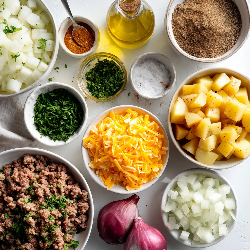 When making Cheesy Meat and Potato Skillet, you need simple but tasty ingredients. Start with ground meat. You can use either beef or turkey. I often choose turkey for a lighter meal, but beef adds a rich flavor.
