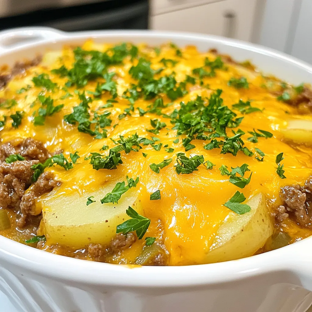 - Ground meat options: beef or turkey - Vegetables: potatoes and onions - Cheese selection: shredded cheddar - Seasoning essentials: garlic powder, paprika, salt, and pepper When making Cheesy Meat and Potato Skillet, you need simple but tasty ingredients. Start with ground meat. You can use either beef or turkey. I often choose turkey for a lighter meal, but beef adds a rich flavor. Next, you need vegetables. Four medium potatoes work best. Dice them into small cubes. This helps them cook faster. You also need one cup of diced onions. They add sweetness and depth. Cheese is key to this dish. I prefer two cups of shredded cheddar cheese. It melts beautifully and gives that rich, cheesy flavor. Don’t forget seasonings. You’ll need garlic powder and paprika for warmth. Salt and pepper add balance. These little touches make a big difference in taste. Gather these ingredients, and you’re ready to create a comforting, cheesy meal that everyone will love. {{ingredient_image_1}} First, you need to prepare your ingredients. Start by dicing the potatoes into small cubes. Aim for uniform pieces to ensure even cooking. Next, dice the onion. The onion adds flavor and sweetness to the dish. Now, let's measure the seasonings and cheese. You will need 1 teaspoon of garlic powder and paprika, plus salt and pepper to taste. Finally, measure out 2 cups of shredded cheddar cheese. This cheesy goodness will melt and create a rich topping. Heat 2 tablespoons of olive oil in a large skillet over medium heat. Once hot, add the diced onion. Sauté the onions until they turn translucent, around 3-4 minutes. This step brings out their sweet flavor. Next, add in 1 pound of ground beef or turkey. Break it up with a spatula as it cooks. Brown the meat for about 5-7 minutes. If there's excess fat, drain it off to keep the dish from being greasy. Now, stir in the diced potatoes along with the garlic powder, paprika, salt, and pepper. Mix everything well to coat the potatoes with all the seasonings. This adds depth to the flavor. Pour 1 cup of beef broth into the skillet. Bring everything to a gentle simmer. Reduce the heat to low and cover the skillet. Let it cook for about 15-20 minutes, or until the potatoes become tender. This step allows the potatoes to soak up all the tasty flavors. Once the potatoes are cooked, remove the lid. Sprinkle the shredded cheddar cheese evenly over the top. Cover the skillet again and let it sit for about 3-5 minutes. This will give the cheese time to melt and become gooey. Finally, remove the skillet from the heat. Garnish with chopped fresh parsley before serving. Enjoy your meal hot and cheesy! - To brown meat well, use medium heat. This helps it cook evenly. Avoid overcrowding the pan. This can cause steaming instead of browning. - For tender potatoes, cut them evenly. This ensures they cook at the same rate. Simmer them until fork-tender but not mushy. - Add a pinch of cayenne pepper for heat. This can boost flavor without overpowering. - Fresh herbs such as thyme or rosemary can brighten the dish. Add them near the end for the best taste. - This dish pairs well with a fresh green salad. The crunch adds contrast to the creamy skillet. - Try serving it in bowls with a sprinkle of extra cheese on top. This makes for a fun and interactive meal. Pro Tips Choose the Right Meat: Use ground turkey for a leaner option, or stick with ground beef for a richer flavor. Perfect Potato Prep: Dicing the potatoes into uniform pieces ensures they cook evenly and are tender throughout. Cheese Variations: Experiment with different types of cheese such as Monterey Jack or Pepper Jack for a flavor twist. Add More Veggies: Consider adding bell peppers or spinach for added nutrition and color in your dish. {{image_2}} You can easily swap the ground beef or turkey for chicken or sausage. Both options add unique flavors. Chicken gives a lighter taste, while sausage adds spice. If you're vegetarian, try using plant-based meat. It works well and keeps the dish hearty. Cheddar cheese is a classic choice, but feel free to explore other types. Try mozzarella for a stretchy melt or pepper jack for a spicy kick. You can also add creamy elements like sour cream. It makes the dish rich and tangy. Don’t stop at potatoes and onions! Add bell peppers for sweetness or green beans for crunch. You can also use seasonal veggies like zucchini or spinach. These additions boost flavor and nutrition, making your meal even better. After you enjoy your cheesy meat and potato skillet, let it cool first. Place it in a sealed container. Store it in the fridge. It will stay fresh for up to three days. If you want to keep it longer, freezing is a great option. When you're ready to eat leftovers, the best way is to use the stove. Heat it in a pan over low heat. Stir often to keep it from sticking. You can also use a microwave. Just cover it with a damp paper towel. This helps keep the cheese creamy and tasty. Avoid high heat, as it can make the potatoes tough. To freeze the dish, let it cool completely. Transfer it to a freezer-safe container. It can last up to three months in the freezer. When you're ready to eat, defrost it in the fridge overnight. Then reheat it on the stove or in the microwave. This keeps the flavors strong and the texture nice. This dish takes about 40 minutes in total. You need 10 minutes to prep. Then, it takes about 30 minutes to cook. Here’s the breakdown: - Prep time: 10 minutes - Cook time: 30 minutes - Sauté onions: 3-4 minutes - Brown meat: 5-7 minutes - Cook potatoes: 15-20 minutes - Melt cheese: 3-5 minutes Yes, you can make this dish ahead of time. It's great for meal prep! Cook it as directed and let it cool. Store it in an airtight container in the fridge. It will stay fresh for up to 3 days. When you are ready to eat, simply reheat it on the stove or in the microwave. You can use chicken broth or vegetable broth instead of beef broth. Each option will change the flavor slightly. Chicken