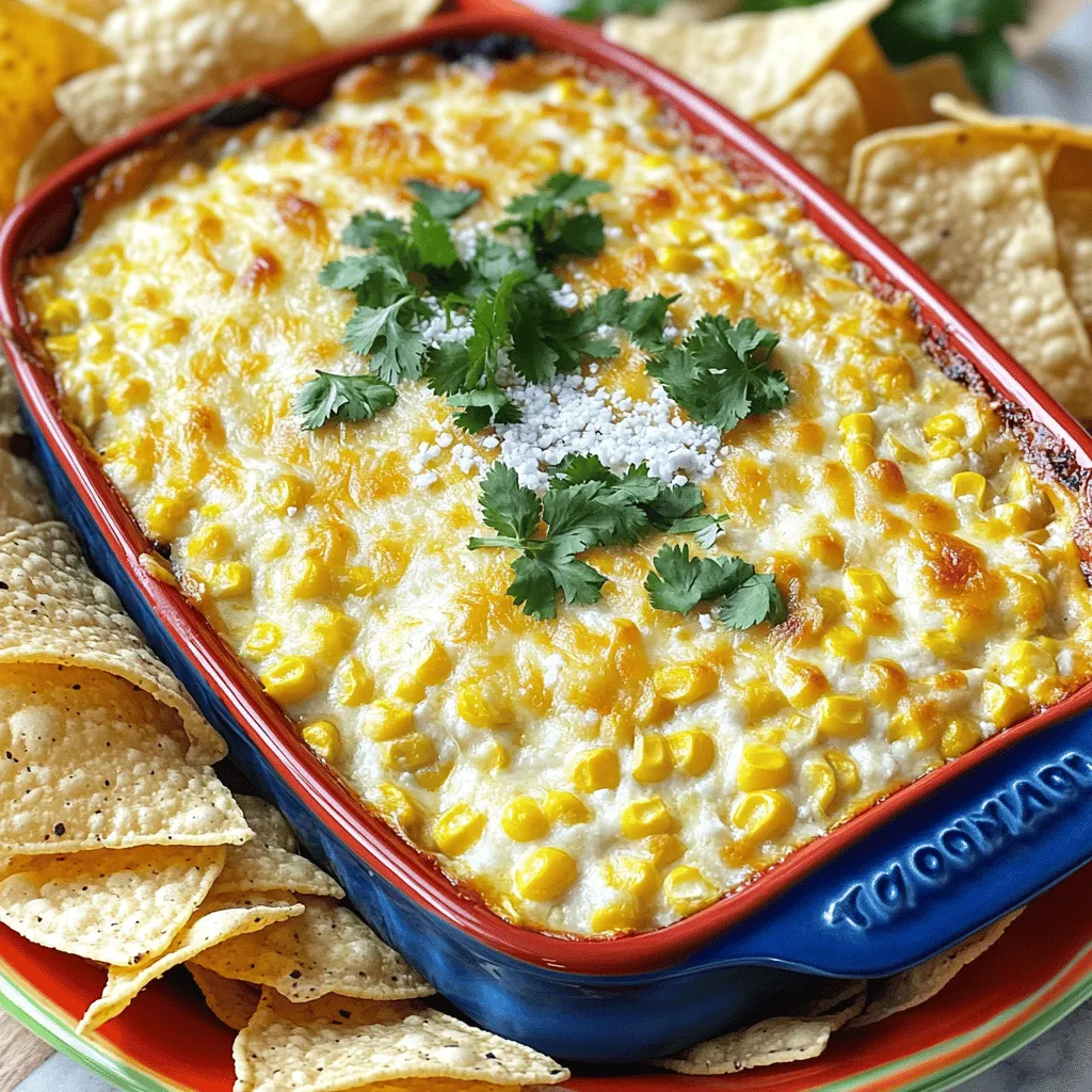 ![- 2 cups frozen corn kernels, thawed - 1 cup cream cheese, softened - 1 cup shredded Monterey Jack cheese - 1/2 cup grated cotija cheese - 1/2 cup sour cream - 1/4 cup mayonnaise - 2 tablespoons lime juice - 1 teaspoon chili powder - 1 teaspoon garlic powder - 1/2 teaspoon smoked paprika - 1/4 teaspoon cayenne pepper (optional) - 1/4 cup fresh cilantro, chopped - Salt and pepper to taste - Tortilla chips for serving Gather these ingredients for a tasty party dish. The corn brings sweetness, while the cheeses add creaminess. Cream cheese gives a rich base, and Monterey Jack melts perfectly. Cotija cheese adds a salty punch, making the dip special. You'll also need lime juice for a zesty flavor. Chili powder, garlic powder, smoked paprika, and cayenne add warmth and depth. Fresh cilantro brightens the dish and gives it a fresh taste. Don't forget salt and pepper to balance all the flavors. This dip is perfect with tortilla chips. The crunch pairs well with the creamy dip. You can also serve it with veggies for a healthy option. For the full recipe, check out the detailed steps! - Set to 350°F (175°C) First, you start by preheating your oven. This step is key for a perfect dip. It helps cook the dip evenly and makes it bubbly. - Combine corn kernels, cream cheese, Monterey Jack, cotija, sour cream, and mayonnaise Next, grab a big mixing bowl. Add the thawed corn kernels, softened cream cheese, shredded Monterey Jack, grated cotija cheese, sour cream, and mayonnaise. Mix these ingredients well. You want a smooth and creamy texture. Each bite should be rich and cheesy. - Mix in lime juice, chili powder, garlic powder, smoked paprika, cayenne (if using), and cilantro Now it's time to spice things up! Squeeze in the lime juice and sprinkle the chili powder, garlic powder, and smoked paprika. If you like it spicy, add cayenne. Toss in the chopped cilantro too. These flavors make the dip pop! Stir until everything blends nicely. - Transfer to baking dish and bake for 20-25 minutes After mixing, transfer your dip to a baking dish. Spread it evenly for even cooking. Bake it in your preheated oven for 20 to 25 minutes. Look for a bubbly top and a golden edge. This is when your Cheesy Mexican Street Corn Dip is ready! For the complete recipe, check the Full Recipe section. Serve this dip warm for the best flavor. When it’s hot, the cheeses melt nicely. This creates a rich and creamy texture that makes each bite delightful. If it cools down, it may not taste as good. So, keep it in the oven until ready to serve. Add extra cilantro and cotija cheese on top. This not only adds color but also boosts the flavor. Fresh cilantro brings a bright taste, while cotija adds a salty kick. You can even sprinkle some chili powder for a pop of color and heat. I recommend crispy tortilla chips for dipping. They add the perfect crunch to each bite. The chips also balance the creamy dip well. You can use store-bought chips or make your own for a fresher taste. Try cutting tortillas into triangles and baking them until crispy. Enjoy your dip! For the full recipe, check out the complete details and step-by-step guide! {{image_2}} You can spice up your Cheesy Mexican Street Corn Dip easily. Just add chopped jalapeños or a sprinkle of cayenne pepper. These spicy additions bring a nice kick to the dip. If you love heat, try both for a fiery twist. Adjust the amount to fit your taste. Cheese lovers can enjoy different cheesy options. Swap in queso blanco for a creamier feel. You can also use pepper jack for a spicy bite. Mixing cheeses can create a fun flavor experience. Don't hesitate to experiment and find the perfect blend for your taste buds. If you want a vegetarian option, replace sour cream with a vegan alternative. You can use cashew cream or coconut yogurt. These options keep the dip creamy without dairy. They also add unique flavors that can enhance the dish. Enjoy the same great taste while keeping it plant-based! To keep your Cheesy Mexican Street Corn Dip fresh, store it in an airtight container. Place it in the refrigerator. This helps preserve its creamy texture and flavors. When you want to enjoy leftovers, the oven is your best friend. Preheat it to 350°F (175°C). Place the dip in a baking dish, cover it with foil, and heat for about 15-20 minutes. This method keeps the dip creamy and prevents it from drying out. You can freeze the dip for later use, but it may change in texture. To freeze, place the dip in a freezer-safe container. When ready to eat, thaw it in the fridge overnight. Reheat it in the oven for the best results. Enjoy this tasty dip anytime! For the full recipe, check out the [Full Recipe]. Yes, you can prepare this dip a day in advance. Just mix all the ingredients and store it in the fridge. This dip tastes even better after the flavors blend overnight. When you're ready to serve, just bake it until hot and bubbly. Tortilla chips are a classic choice for dipping. You can also serve it with fresh veggies like carrots or bell peppers. Pita chips add a nice crunch too. This dip pairs well with anything that can scoop up its cheesy goodness. Typically, it lasts up to 3-4 days in an airtight container. Just make sure it's sealed tight to keep it fresh. If the dip looks or smells off, it's best to throw it out. Enjoy it while it's still creamy and delicious! This blog post shared the easy steps to make Cheesy Mexican Street Corn Dip. You learned about the simple ingredients, from corn to rich cheeses. I covered how to prepare, bake, and serve it. The tips offered help you enjoy it warm, with crispy chips and beautiful garnishes. Whether you keep it mild or spice it up, this dish fits all tastes. Remember, it’s great to make ahead and can even be frozen. Enjoy this tasty dip at your next gathering. It's sure to impress!](https://lisadishes.com/wp-content/uploads/2025/06/adcad653-9d67-4be4-a203-0bae8ef94a61-768x768.webp)