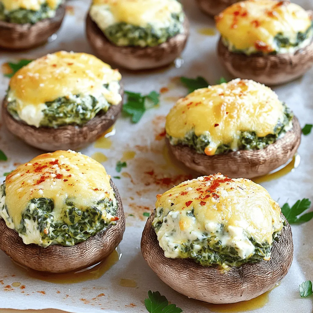 - 16 large cremini or button mushrooms - 1 cup fresh spinach - 1 cup cream cheese - 1/2 cup grated Parmesan cheese - 1/2 cup shredded mozzarella cheese - 2 cloves garlic - 1/4 teaspoon red pepper flakes - Olive oil - Salt and pepper to taste - Fresh parsley for garnish When making cheesy spinach stuffed mushrooms, you want the freshest ingredients. Start with 16 large cremini or button mushrooms. They hold the filling well and taste great. Chop 1 cup of fresh spinach. This adds color and a healthy touch. Next, grab 1 cup of cream cheese. It gives the filling a rich and creamy texture. You will also need 1/2 cup each of grated Parmesan cheese and shredded mozzarella cheese. Together, they create a cheesy, gooey delight. For flavor, use 2 cloves of minced garlic. It brings depth to the dish. If you like a little heat, add 1/4 teaspoon of red pepper flakes. Adjust salt and pepper to your taste. Lastly, drizzle some olive oil for cooking and garnish with fresh parsley. These ingredients make the perfect cheesy spinach stuffed mushrooms. For the complete process, check the Full Recipe. - Preheat the oven to 375°F (190°C). - Prepare the mushrooms by removing stems. This lets us fill them well. - Heat a skillet and add olive oil. Sauté minced garlic for one minute. - Add chopped spinach to the skillet. Cook until it wilts, about 2-3 minutes. - In a bowl, mix the cream cheese, Parmesan cheese, mozzarella cheese, and seasonings. Add the sautéed spinach and stir. - Stuff each mushroom cap with the cheese mixture. Fill them generously. - Place the stuffed mushrooms on a baking sheet. Drizzle with olive oil. - Bake for 20-25 minutes. The mushrooms should be soft and the filling golden. For more details, check the Full Recipe. Select large cremini or button mushrooms for the best results. These types have a sturdy cap that holds the filling well. When picking mushrooms, look for smooth, firm skin. Avoid any that feel slimy or look dry. Fresh mushrooms should have a pleasant, earthy smell. Mixing your cheese ingredients is key. Start with softened cream cheese for a smooth blend. Gradually add in grated Parmesan and shredded mozzarella. Feel free to adjust the flavors to your taste. If you like it spicy, add more red pepper flakes. If you prefer a milder taste, skip them altogether. For gatherings, arrange the stuffed mushrooms on a nice platter. This makes them look inviting. You can sprinkle fresh parsley on top for color. It adds a nice touch and makes the dish pop. These small details make a big difference when serving your Cheesy Spinach Stuffed Mushrooms. Don't forget to check the Full Recipe for more tips! {{image_2}} You can switch up your cheeses for new tastes. Try goat cheese for a tangy twist. Feta cheese also works well, giving a salty kick. If you want more creaminess, cream cheese blends beautifully with any cheese. For veggies, you can add chopped artichokes or sun-dried tomatoes. These add a burst of flavor. Bell peppers or zucchini can also be stuffed in. They contribute a nice crunch and flavor. To make these mushrooms gluten-free, avoid breadcrumbs if you use any. Focus on the cheese and spinach mix. This keeps the dish tasty without gluten. For vegan options, swap cream cheese with cashew cheese or tofu. Nutritional yeast can give that cheesy flavor. Use plant-based mozzarella for a melty effect. These adjustments ensure everyone enjoys the dish. Adding herbs can enhance the flavors. Try fresh basil or oregano for a garden taste. A sprinkle of thyme gives a warm, earthy note. You can also play with spices. A pinch of smoked paprika adds depth. For a kick, add cayenne pepper or more red pepper flakes. Toppings matter too. A sprinkle of breadcrumbs can add crunch. You could also drizzle balsamic glaze for sweetness. Every tweak opens up new taste possibilities. To keep your cheesy spinach stuffed mushrooms fresh, store them in the fridge. Place the leftovers in an airtight container. This helps prevent any strong odors. They will last for about 3 to 4 days in the fridge. If you want to enjoy them later, remember to cool them down before sealing. For long-term storage, you can freeze the stuffed mushrooms. First, let them cool completely. Then, place them on a baking sheet in a single layer. Freeze them until solid. Once frozen, transfer them to a freezer bag. They can stay good for up to 2 months. To reheat, bake them straight from the freezer. Just add a few extra minutes to the baking time. Leftover mushrooms are great for quick meals. You can chop them up and add them to pasta or salads. They also make a tasty topping for pizza. Pair them with your favorite sauces or dips for an easy snack. Enjoy the flavors of cheesy spinach stuffed mushrooms in new ways! For the full recipe, check out the main content. You can prep these stuffed mushrooms a day before your event. First, make the filling and stuff the mushrooms. Place them in a baking dish and cover with plastic wrap. Store them in the fridge overnight. Just remember to take them out an hour before baking. This allows them to come to room temperature. When you're ready, bake as directed in the Full Recipe. They will taste fresh and delicious! These stuffed mushrooms pair well with many dishes. Serve them with a light salad for a fresh touch. A side of garlic bread complements the cheese flavors nicely. If you want a drink, try a crisp white wine. Sparkling water with lemon also works great. These options enhance your meal while keeping it simple. Yes, frozen spinach can work well in this recipe. Just make sure to thaw it first and drain any extra water. This helps avoid a soggy filling. Fresh spinach has a brighter taste and better texture, but frozen is a good backup. Both options are nutritious and tasty. Whatever you choose, your stuffed mushrooms will still be a hit! This blog post covered making Cheesy Spinach Stuffed Mushrooms. We explored the key ingredients, preparation steps, and cooking methods. I shared tips for c