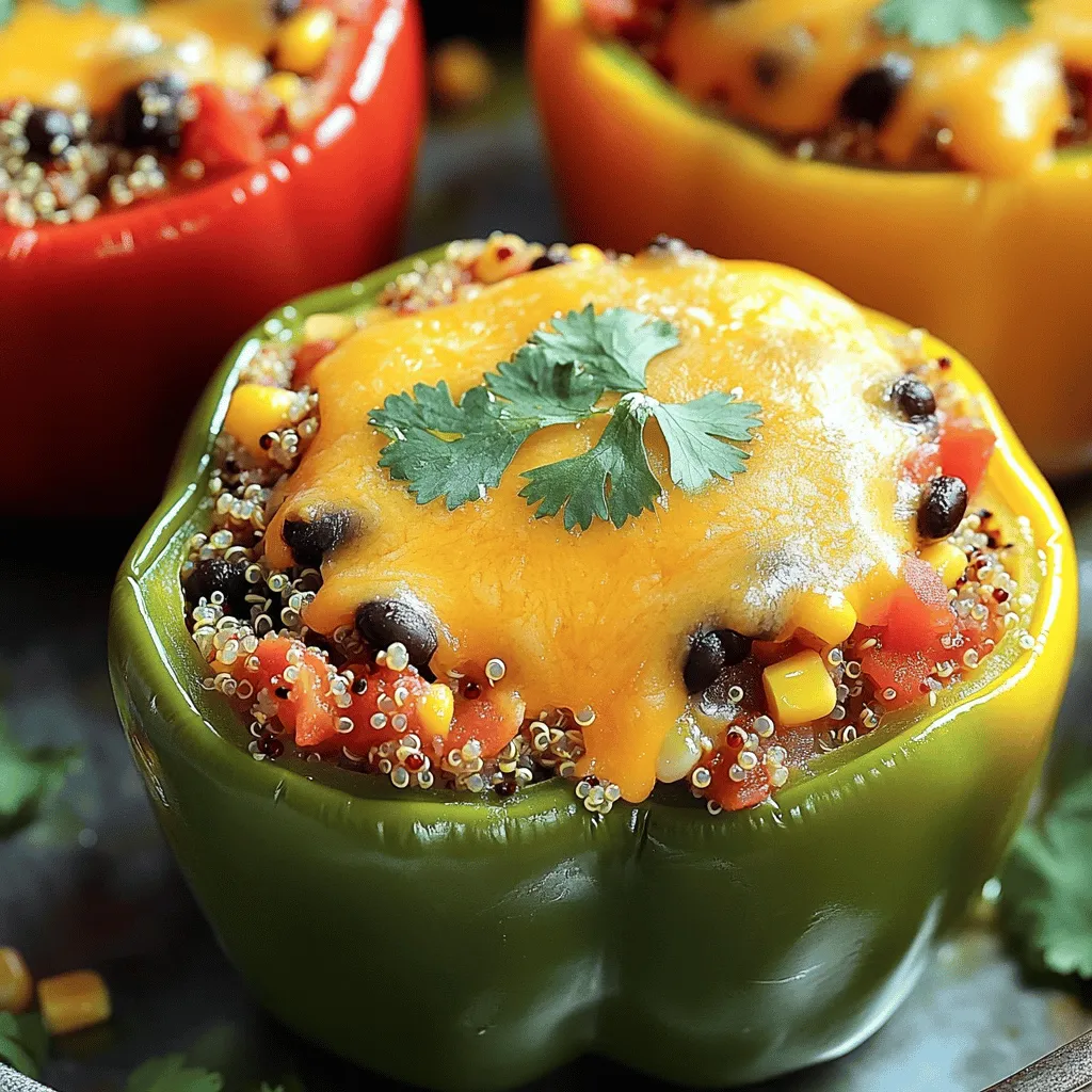 - 4 large bell peppers (any color) - 1 cup cooked quinoa - 1 cup black beans, rinsed and drained - 1 cup corn kernels (fresh, frozen, or canned) - 1 cup diced tomatoes (canned or fresh) - 1 teaspoon ground cumin - 1 teaspoon chili powder - ½ teaspoon garlic powder - 1 cup shredded cheddar cheese (plus extra for topping) - ¼ cup chopped fresh cilantro (optional) - Salt and pepper to taste - Olive oil for drizzling These ingredients make cheesy stuffed bell peppers both tasty and healthy. The bell peppers are colorful and fun to eat. Quinoa adds protein and fiber, making this dish filling. Black beans bring extra protein and a nice texture. Corn kernels sweeten the mix, while tomatoes add moisture and flavor. Spices like cumin and chili powder kick up the flavor. Garlic powder gives it a nice aroma. Cheddar cheese makes it cheesy and rich. You can sprinkle some fresh cilantro on top for a fresh taste. Use olive oil to help the peppers cook and brown nicely. Each stuffed pepper has about 300 calories. It has 15 grams of protein, 45 grams of carbs, and 10 grams of fat. Key ingredients offer great health benefits: - Bell Peppers: High in vitamin C and antioxidants. - Quinoa: A complete protein with all nine essential amino acids. - Black Beans: Good source of fiber and protein. - Corn: Adds vitamins and minerals, plus a bit of sweetness. - Cheddar Cheese: Provides calcium and protein. You can find the full recipe in the article. Enjoy cooking! 1. Preheat your oven to 375°F (190°C). This ensures even cooking for our stuffed peppers. 2. Cut the tops off the bell peppers. Remove the seeds and membranes. You want them clean and ready for stuffing. 3. Brush the outside of each pepper with olive oil. This helps them roast nicely in the oven. 4. Place the peppers upright in a baking dish. This keeps them stable while they cook. 1. In a large bowl, mix together the filling ingredients: cooked quinoa, black beans, corn, diced tomatoes, ground cumin, chili powder, garlic powder, and half of the shredded cheddar cheese. Stir until everything is well combined. 2. Season the mixture with salt and pepper. Taste it to make sure the flavors pop! 3. Stuff each bell pepper with the quinoa mixture. Press down lightly to pack it in. Fill them generously for a hearty meal. 4. Top each stuffed pepper with the remaining cheddar cheese. This will melt beautifully and add flavor. 1. Cover the baking dish with aluminum foil. This traps steam and helps the peppers cook through. 2. Bake for 25 minutes. This softens the peppers and warms the filling. 3. Remove the foil and bake for an additional 10-15 minutes. You want the cheese to melt and bubble. 4. Once done, take them out of the oven and let cool for a few minutes. This makes serving easier and safer. For the full recipe, refer to the [Full Recipe]. To bring out the best in your cheesy stuffed bell peppers, use fresh herbs and spices. I love adding a pinch of smoked paprika for a subtle smokiness. You can also try oregano or thyme for extra depth. Always season your mix with salt and pepper. Taste as you go. This simple step helps ensure every bite is packed with flavor. Baking is key for even cooking. Preheat your oven to 375°F (190°C) for the best results. Place the stuffed peppers upright in a baking dish, allowing them to cook evenly. Cover the dish with foil for the first part of baking. This traps steam and helps the peppers get tender. After 25 minutes, remove the foil to let the cheese get bubbly and golden. To make your dish shine, garnish with fresh cilantro or parsley. A dollop of sour cream or a slice of avocado adds color and creaminess. Serve the peppers on a colorful plate to make them pop. Pair them with a simple side salad or some crusty bread. This balance makes for a delightful meal. {{image_2}} You can change the protein in cheesy stuffed bell peppers to fit your taste. Use ground turkey, chicken, or beef for a meaty twist. Each option adds a unique flavor to the peppers. If you want to go meat-free, try black beans, lentils, or chopped mushrooms. These choices keep the dish hearty and satisfying for everyone. Cheese is the star here, but you can mix it up. Cheddar is great, but try pepper jack for a spicy kick. Mozzarella gives a creamy texture. You can also add more flavor with herbs like oregano or basil. Want more crunch? Add diced bell peppers, corn, or even cooked grains like rice or farro for extra texture and taste. If you need gluten-free options, this recipe is naturally safe. Just make sure your ingredients, like the beans and corn, are gluten-free. For those on low-carb or keto diets, swap quinoa for cauliflower rice. This change keeps the dish light while still being full of flavor. You can enjoy cheesy stuffed bell peppers without worry about your diet. Check out the Full Recipe for more ideas! To store leftovers, let the stuffed peppers cool first. Place them in an airtight container. They will last for up to four days in the fridge. When you’re ready to eat, reheat them in the oven or microwave. Use a microwave-safe dish and cover with a damp paper towel to keep them moist. If reheating in the oven, set it to 350°F and heat for about 15-20 minutes. Freezing stuffed peppers is easy. First, let them cool completely. Wrap each pepper tightly in plastic wrap or foil. Place them in a freezer-safe bag or container. They can stay frozen for up to three months. To thaw, move them to the fridge overnight. For reheating, bake them at 375°F for about 30-35 minutes, or until hot. You can make these cheesy stuffed bell peppers ahead of time. Prepare the filling and stuff the peppers, then store them in the fridge for up to two days. This makes busy days easier. For portioning, cut the peppers in half if you want smaller servings. This way, you can have quick meals ready to go. To spice up your cheesy stuffed bell peppers, add diced jalapeños or chopped serrano peppers. You can also mix in hot sauce or crushed red pepper flakes into 
