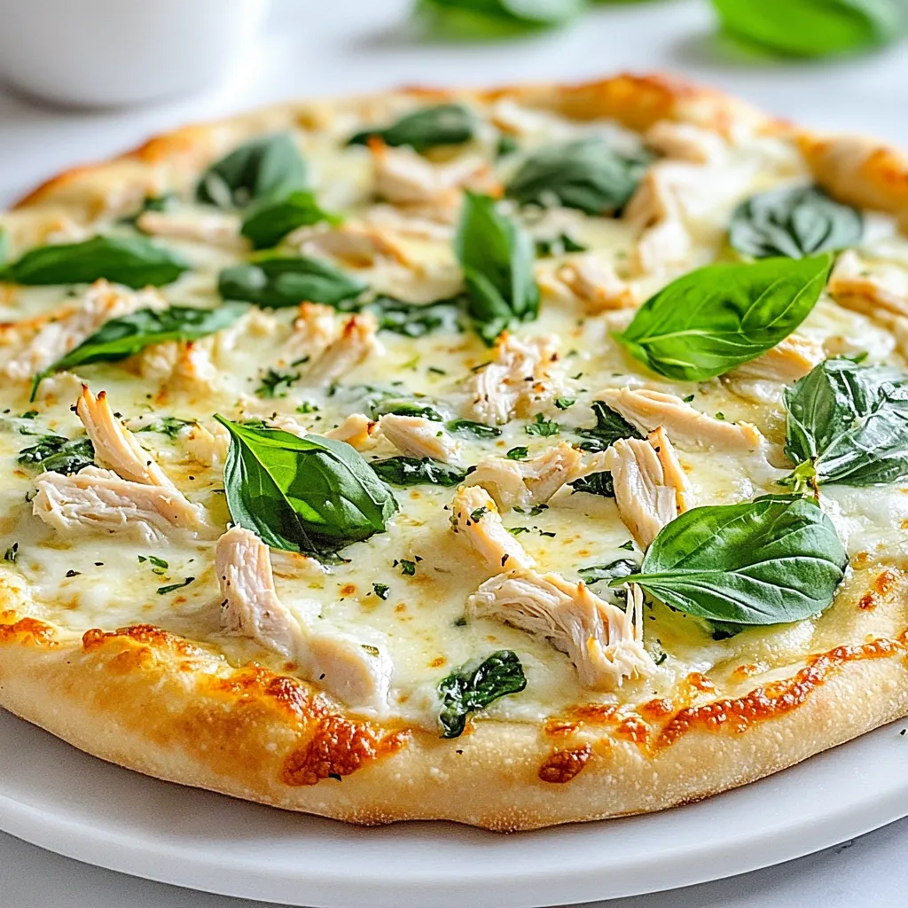 - 1 pre-made pizza crust (or homemade if preferred) - 1 cup cooked chicken breast, shredded - 1 cup Alfredo sauce (store-bought or homemade) - 1 ½ cups shredded mozzarella cheese - ½ cup grated Parmesan cheese - 1 cup fresh spinach, chopped - ½ teaspoon garlic powder - ¼ teaspoon black pepper - ¼ teaspoon crushed red pepper flakes (optional) - Fresh basil leaves, for garnish If you want to switch things up, try these options: - Use a cauliflower crust for a low-carb choice. - Swap chicken for cooked shrimp or sausage for different flavors. - Try a white sauce if you want a unique base. - Use vegan cheese for a dairy-free option. I trust these brands for quality: - Pizza Crust: Boboli or Caulipower for gluten-free. - Alfredo Sauce: Rao's Homemade or Bertolli for store-bought. - Cheese: Galbani for mozzarella and Kraft for Parmesan. - Spinach: Fresh Express for pre-washed convenience. Using great ingredients makes your Chicken Alfredo Pizza even better! {{ingredient_image_1}} Start by preheating your oven to 475°F (245°C). This high heat helps create a crispy crust. If you’re using homemade dough, roll it out on a floured surface until it’s the thickness you like. Once ready, place the dough on a pizza stone or baking sheet. This step sets the stage for the perfect pizza. In a small bowl, mix the Alfredo sauce with garlic powder, black pepper, and crushed red pepper flakes if you want a little heat. This adds depth to the sauce. Stir until all the ingredients blend well. You’ll want this sauce to be flavorful as it is the heart of your pizza. Spread the seasoned Alfredo sauce evenly over the pizza crust. Leave a small border around the edges for a nice crust. Next, sprinkle the shredded chicken on top of the sauce. This gives the pizza a hearty base. Then, add the chopped spinach for a fresh touch. Finish by covering everything with a generous amount of mozzarella cheese and a sprinkle of Parmesan cheese. This cheesy layer melts beautifully in the oven. Carefully place the pizza in your preheated oven. Bake for 12-15 minutes. Keep an eye on it until the cheese is bubbly and golden brown. The crust should be cooked to your liking. When it’s done, take the pizza out and let it cool for a minute. Garnish with fresh basil leaves to add color and flavor before slicing. Enjoy your Chicken Alfredo Pizza! To get a great crust, start with a hot oven. Preheat it to 475°F (245°C). This heat helps make the edges crisp. If you use a pizza stone, place it in the oven while it heats. A stone can keep the crust crispy. Roll out your dough to about ¼ inch thick. If it's too thick, it may not cook well. Also, avoid adding too much sauce or toppings. They can make the crust soggy. Give your pizza a flavor boost with seasonings. Mix garlic powder and black pepper into the Alfredo sauce. It adds depth to the taste. For a kick, include crushed red pepper flakes. Fresh spinach adds a nice pop of color and taste. You can also use fresh herbs like basil or oregano. These herbs will make your pizza even more delicious. Slice the pizza into squares for easy serving. This way, everyone can grab a piece. Serve it with a fresh salad for a light meal. A simple green salad pairs well with the rich flavors of the pizza. You can also offer extra grated Parmesan on the side. This lets guests add more cheese if they want. Pro Tips Cook Chicken in Advance: For the best flavor, use leftover rotisserie chicken or pre-cooked chicken breast to save time and enhance taste. Homemade Alfredo Sauce: If you have time, make your own Alfredo sauce for a richer flavor. Use butter, heavy cream, and Parmesan cheese for a creamy texture. Don’t Overload with Cheese: While cheese is delicious, too much can make your pizza soggy. Stick to the recommended amounts for the perfect balance. Fresh Basil Addition: Add fresh basil leaves after baking for a burst of flavor and color. It elevates the dish and adds a nice aroma! {{image_2}} You can change up your Chicken Alfredo Pizza with many toppings. Try adding sliced mushrooms for earthiness. Red onions give a mild sweetness. You can also use bell peppers for crunch and color. If you love heat, add jalapeños for a spicy kick. For a touch of sweetness, consider pineapple or roasted red peppers. Don’t forget, you can mix and match these toppings to make your pizza unique! While Alfredo sauce is a classic choice, feel free to get creative. A creamy garlic sauce can add a nice twist. You might like using a pesto sauce for a fresh taste. If you prefer a lighter option, try a white sauce made with yogurt. Marinara sauce can also work well if you want a tomato flavor. Each sauce changes the pizza's overall vibe, so explore until you find your favorite! The crust is the base of your pizza. You can use a pre-made crust for ease. If you want more control, try making your own at home. You can also explore using cauliflower crust for a low-carb option. For a fun twist, use a whole wheat crust for added flavor and nutrients. Each type of crust can change the texture and taste, so pick what you love! To keep your Chicken Alfredo Pizza fresh, store it in the fridge. Use an airtight container or wrap it tightly in plastic wrap. It stays good for 2-3 days. This helps keep moisture in and flavors intact. When you want to enjoy leftovers, the oven is your best friend. Preheat it to 350°F (175°C). Place the pizza on a baking sheet. Heat it for about 10-15 minutes. This brings back the crispy crust and melts the cheese again. You can also use a microwave, but the crust may get soft. If you want to save some pizza for later, freezing works great. Wrap each slice in plastic wrap and place them in a freezer bag. It can last up to 2 months. When you're ready to eat, thaw it in the fridge overnight before reheating. Chicken Alfredo Pizza is a tasty blend of flavors. It combines creamy Alfredo sauce with tender chicken. You start with a pizza crust, either store-bought or homemade. Then, you spread t