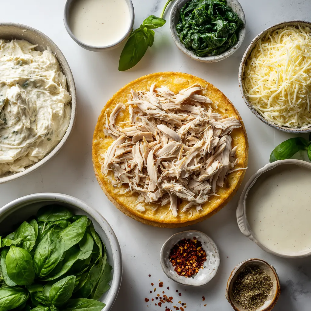 Spread the seasoned Alfredo sauce evenly over the pizza crust. Leave a small border around the edges for a nice crust. Next, sprinkle the shredded chicken on top of the sauce. This gives the pizza a hearty base. Then, add the chopped spinach for a fresh touch. Finish by covering everything with a generous amount of mozzarella cheese and a sprinkle of Parmesan cheese. This cheesy layer melts beautifully in the oven.