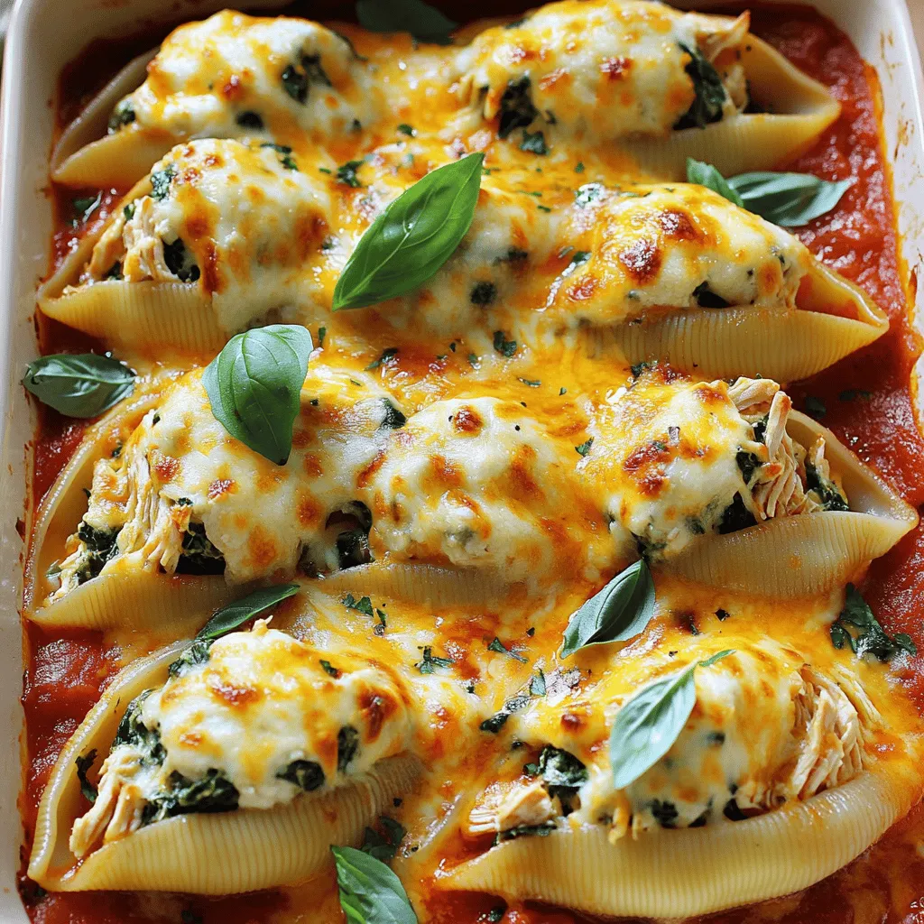 ![For this dish, you need simple and fresh items. The main ingredients include: - 20 jumbo pasta shells - 2 cups cooked chicken, shredded - 1 cup fresh spinach, chopped - 1 cup ricotta cheese - 1 cup mozzarella cheese, shredded - 1/2 cup Parmesan cheese, grated - 1 egg, beaten - 2 cups marinara sauce - 1 teaspoon garlic powder - 1 teaspoon onion powder - Salt and pepper to taste - Fresh basil leaves for garnish These ingredients come together to create a tasty meal. The chicken brings protein, while the spinach adds nutrients. The cheeses create a creamy texture that makes each bite rich and satisfying. You can enhance your stuffed shells with a few extras. Consider adding: - 1 teaspoon Italian seasoning - Red pepper flakes for a little spice - Fresh herbs like parsley or oregano These optional ingredients can boost the flavors and make your dish unique. They allow you to customize your meal based on your taste. To make cooking easier, use the right tools. Here are some recommended items: - Large pot for boiling pasta - Mixing bowl for the filling - Baking dish (9x13 inches) - Spoon or spatula for mixing - Aluminum foil to cover the dish Having these tools ready will help you cook smoothly. Good tools make the process fun and keep your kitchen organized. For the full recipe, check out the guidelines that include every step you need. Start by preheating your oven to 375°F (190°C). Next, cook the jumbo pasta shells. Follow the package instructions and boil them until they are al dente. This means they should still have a slight firmness. Drain the shells and set them aside to cool for a few minutes. You want to make sure they are easy to handle. In a large mixing bowl, add the cooked chicken. Shred it into small pieces. Then, add the chopped fresh spinach. Mix in the ricotta cheese, half of the mozzarella cheese, and grated Parmesan cheese. Next, crack an egg into the bowl and add garlic powder, onion powder, salt, and pepper. Stir everything together until it is well combined. This filling is packed with flavor and nutrients. Now it's time to stuff the pasta shells. Take each shell and fill it with the chicken and spinach mixture. Place the stuffed shells in a 9x13 inch baking dish. Once all the shells are filled, pour marinara sauce evenly over them. Sprinkle the remaining mozzarella cheese on top. Cover the dish with aluminum foil and place it in the oven. Bake for 25 minutes. After that, take off the foil and bake for an extra 10-15 minutes. The cheese should become bubbly and golden. Let the dish sit for 5 minutes before serving. Garnish with fresh basil leaves for a nice touch. You can find the Full Recipe [here]. Cooking pasta shells may seem simple, but a few tricks help. Always cook the shells until they are al dente. This way, they stay firm and hold the filling well. Follow the package instructions for timing. After cooking, drain the shells and rinse them with cold water. This stops the cooking and keeps them from sticking together. Stuffing shells can get messy, but practice makes perfect. Use a spoon or a piping bag to fill each shell. Fill them generously but avoid overstuffing. This helps the shells stay intact while baking. Place the shells in your baking dish with the opening facing up. This way, they soak up the sauce and flavors better. Once your stuffed shells are ready, serve them hot. They pair well with a fresh salad or garlic bread. You can also sprinkle some extra Parmesan cheese on top for added flavor. For drinks, a light white wine or sparkling water makes a nice choice. Want to try something different? Add a side of roasted vegetables for a colorful plate. For the full recipe, check out the [Full Recipe]. {{image_2}} If you want a vegetarian spin on this dish, swap the chicken for more veggies. Use mushrooms, zucchini, or bell peppers. You can also add more spinach or even kale for extra greens. For the cheese, you might try using cottage cheese instead of ricotta. This will keep the dish creamy and delicious without meat. You can change up the protein in these stuffed shells to suit your taste. Ground turkey or beef works well. If you prefer seafood, cooked shrimp or crab meat adds a nice twist. Just make sure to cook any raw meat before mixing it with the other filling ingredients. This way, everything cooks evenly in the oven. While marinara sauce is a classic choice, feel free to get creative with your sauce. Try Alfredo sauce for a rich and creamy taste. A pesto sauce can add a fresh and herby flavor. For a spicy kick, a arrabbiata sauce can bring heat to the dish. You can even mix sauces for a unique blend that makes your meal stand out. For the full recipe, check out the instructions above. After enjoying your Chicken and Spinach Stuffed Shells, store any leftovers promptly. Use an airtight container to keep them fresh. Place the shells in a single layer if possible. This way, they won't stick together. Store them in the fridge for up to three days. Always check for signs of spoilage before eating. Freezing is a great option for meal prep. To freeze, let the stuffed shells cool completely. Then, place them in a freezer-safe container or a zip-top bag. Make sure to label the bag with the date. They can last up to three months in the freezer. For best results, freeze them before baking. This keeps the flavors fresh. When you’re ready to enjoy your frozen stuffed shells, there are easy ways to reheat them. For frozen shells, thaw them overnight in the fridge. Preheat your oven to 375°F (190°C). Place the shells in a baking dish and cover with foil. Bake for about 25 minutes. If they are refrigerated, bake for about 15 minutes. Check with a fork to make sure they are hot in the center. Enjoy your tasty meal! Yes, you can make Chicken and Spinach Stuffed Shells ahead of time. You can prepare them and then store them in the fridge before baking. This saves time on busy days. Just cover the dish with foil and keep it in the fridge for up to 24 hours. Whe