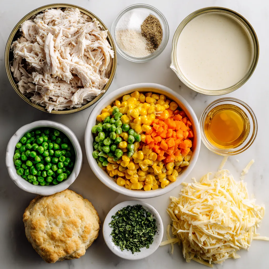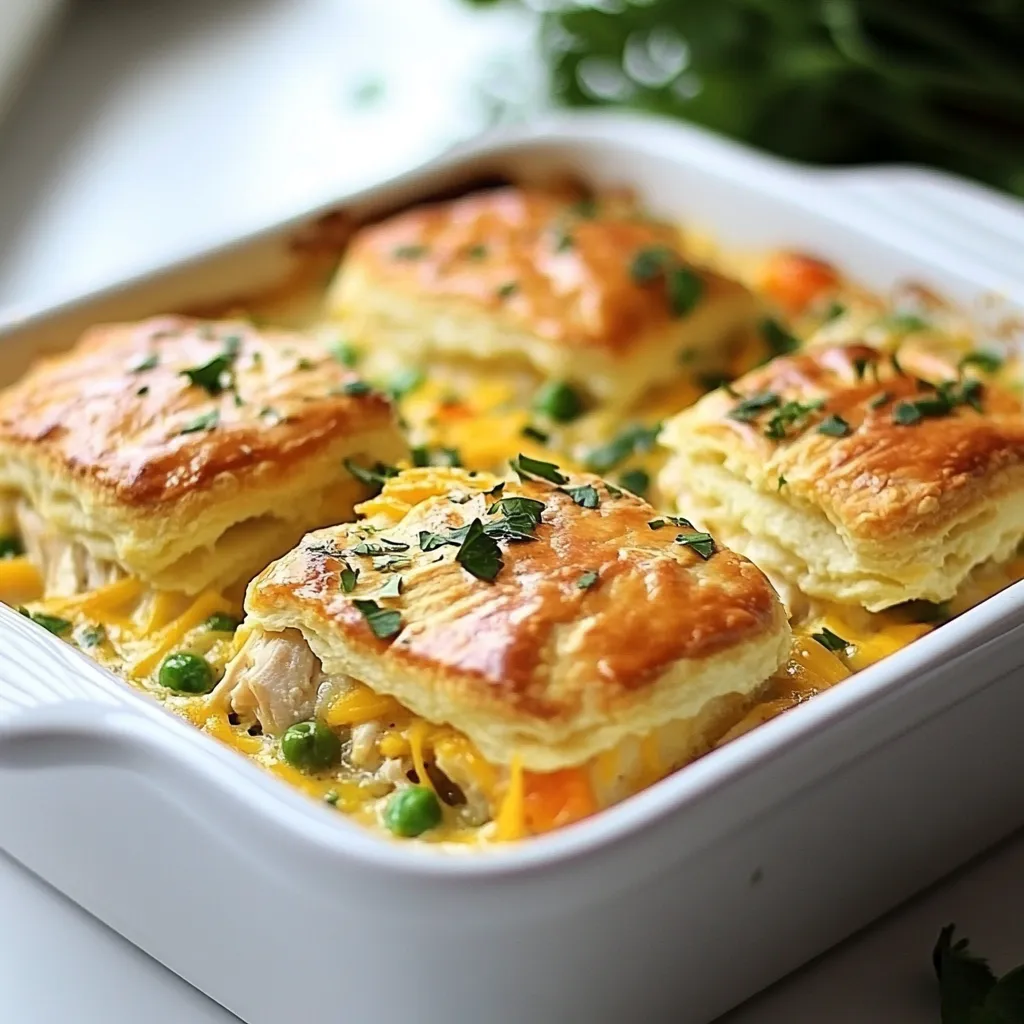A comforting chicken pot pie casserole filled with shredded chicken, mixed vegetables, and topped with biscuit dough and cheese.