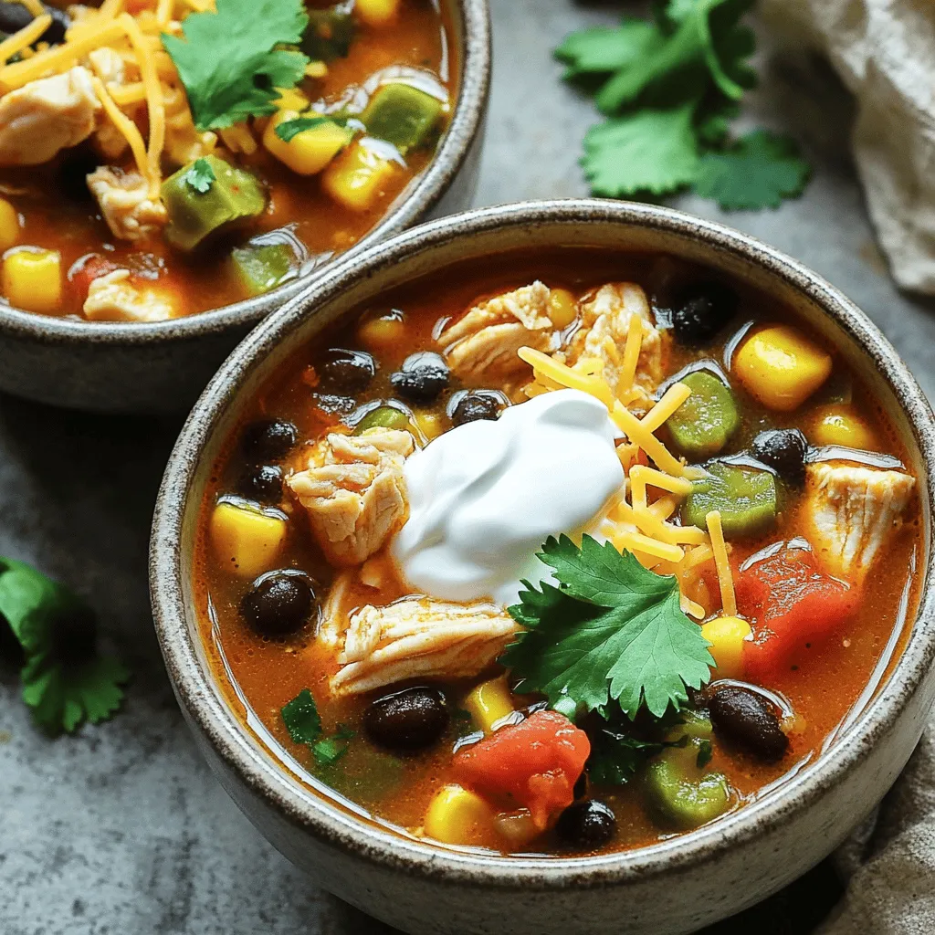 ![For a tasty chicken taco soup, gather these items: - 1 lb boneless, skinless chicken breasts, diced - 1 can (15 oz) black beans, rinsed and drained - 1 can (15 oz) corn, drained - 1 can (10 oz) diced tomatoes with green chilies - 1 onion, chopped - 2 cloves garlic, minced - 1 bell pepper (any color), chopped - 1 packet taco seasoning - 4 cups chicken broth - 1 tablespoon olive oil - Salt and pepper to taste - Fresh cilantro, for garnish - Sour cream and shredded cheese, for serving If you cannot find an item, don’t worry! You can use: - Ground chicken or turkey instead of diced chicken. - Any canned beans like kidney or pinto beans. - Fresh corn if you prefer over canned corn. - Add lime juice for a fresh kick. These swaps will still keep your soup yummy. This recipe can fit many diets: - Gluten-Free: Use a gluten-free taco seasoning. - Low-Carb: Swap the corn for zucchini or cauliflower. - Dairy-Free: Skip the sour cream and cheese or use plant-based options. With these tips, you can enjoy this soup no matter your diet! This chicken taco soup is easy to make and so tasty! Start by heating one tablespoon of olive oil in a large pot over medium heat. Add one chopped onion and one chopped bell pepper. Cook these for about 3-4 minutes until they soften. Next, stir in two minced garlic cloves and cook for one more minute. This adds a nice flavor. Now, push the veggies to one side of the pot. In the center, add one pound of diced chicken breasts. Cook the chicken for about 5-6 minutes until it gets a nice brown color. After that, sprinkle one packet of taco seasoning over the chicken. Mix everything well to combine the flavors. Pour in four cups of chicken broth. Then, add one can of black beans, one can of corn, and one can of diced tomatoes with green chilies. Make sure to stir all the ingredients together. Bring the soup to a boil, then lower the heat. Let it simmer for 20-25 minutes. This simmering time helps the flavors mix well. Don’t forget to taste the soup! Adjust the seasoning with salt and pepper to make it perfect for you. For this dish, the total cooking time is about 35 minutes. The prep time is just 10 minutes. Be sure to keep the heat at medium when sautéing the vegetables. This keeps them from burning. When you bring the soup to a boil, watch it closely. Once boiling, lower the heat to let it simmer gently. This helps keep the chicken tender and juicy. When serving, ladle the soup into bowls. Top each bowl with a dollop of sour cream and a sprinkle of shredded cheese. Add a few leaves of fresh cilantro for a pop of color. This not only makes the dish look nice but also adds fresh flavor. Enjoy your chicken taco soup with tortilla chips or crusty bread for a complete meal. For the full recipe, you can refer back to the beginning of this guide. To make the best chicken taco soup, start with fresh ingredients. Use good quality chicken for flavor. I recommend boneless, skinless chicken breasts. Dice them into small pieces for even cooking. Sauté your veggies well. This builds a rich base for your soup. Cook your onions and bell pepper until soft. This takes about 3-4 minutes. Don’t skip the garlic. It adds great taste. Avoid overcooking the chicken. It can turn dry and tough. Cook it just until browned on all sides. Another mistake is not seasoning enough. Always taste your soup before serving. Adjust the salt and pepper to your liking. Lastly, don’t forget to stir in the taco seasoning. This gives your soup that signature flavor. You can boost the flavor of your chicken taco soup in many ways. Add a squeeze of lime juice for brightness. Fresh cilantro adds a nice touch, too. If you like heat, toss in some sliced jalapeños. For extra creaminess, add a dollop of sour cream. Consider using homemade chicken broth for a deeper taste. These tips will elevate your soup from good to great. For the complete recipe, check the [Full Recipe]. {{image_2}} You can make a vegetarian version of chicken taco soup. Replace chicken with diced tofu or jackfruit. Tofu gives protein and has a nice texture. Jackfruit adds a unique flavor with a meaty feel. Use vegetable broth instead of chicken broth for a vegan option. For beans, you can use kidney beans or pinto beans, too. Add spices to boost flavor. Try cumin, smoked paprika, or chili powder. These spices add warmth and depth. You can also mix in fresh jalapeños for heat. Top your soup with avocado, lime wedges, or diced radishes. A sprinkle of cheese or crispy tortilla strips makes it even better. You can use a slow cooker for easy cooking. Just add all ingredients to the pot. Set it on low for 6-8 hours or high for 3-4 hours. For a quick meal, the Instant Pot is great. Cook on high pressure for about 10 minutes, then let it release naturally. Both methods give you a rich and tasty soup. For the full recipe, check out the complete guide. After you enjoy your Chicken Taco Soup, let it cool first. Use a clean, airtight container to store it. This helps keep the soup fresh. Place it in the fridge if you plan to eat it soon. It will last for about 3 to 4 days. Make sure to label the container with the date. If you want to save it for later, freezing is a great choice. Pour the cooled soup into freezer-safe bags or containers. Leave some space at the top, as soup expands when frozen. Seal the bags tightly to prevent air from getting in. You can freeze the soup for up to 3 months. Remember to label it with the date. To reheat, you can use the stove or microwave. If using the stove, pour the soup into a pot. Heat it over medium heat, stirring often. This helps it heat evenly. If using the microwave, place your soup in a microwave-safe bowl. Cover it loosely and heat for 2-3 minutes. Stir halfway through to ensure even warming. Always check the temperature before eating, and enjoy your delicious Chicken Taco Soup again! For the full recipe, check the section above. Chicken taco soup is a warm, tasty dish. It mixes chicken, beans, corn, and 