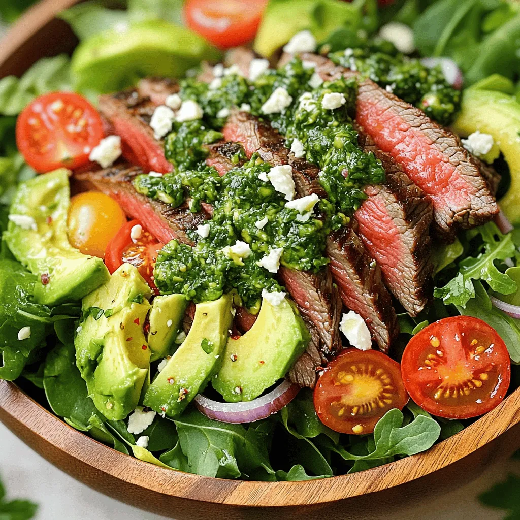 Slice your rested steak thinly against the grain. Place it on top of the salad. Drizzle with chimichurri sauce for a vibrant finish. You can even garnish with extra parsley for a pop of color. This makes your dish look as good as it tastes!
