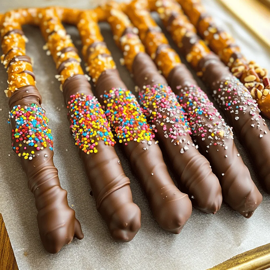 Chocolate dipped pretzel rods are a simple and fun treat. You can make them in just about 40 minutes. This recipe yields 12 tasty rods. It’s perfect for parties or gifts. Here’s what you need for this recipe: - 1 cup pretzel rods - 1 cup semi-sweet chocolate chips - 1 tablespoon coconut oil - 1/2 cup crushed nuts (almonds, peanuts, or hazelnuts) - 1/2 cup colorful sprinkles - Sea salt for sprinkling These ingredients come together to create a sweet and salty snack. I love using semi-sweet chocolate chips. They melt nicely and have a rich flavor. You can also try dark chocolate for a bolder taste. White chocolate adds a creamy touch, too. Each type offers a different taste experience. Choose what you love best! Start by laying out your baking sheet. Use parchment paper to cover it. This step is key. It keeps the chocolate from sticking. You want a clean finish for each pretzel. Make sure the sheet is flat on a stable surface. Grab a microwave-safe bowl. Add the semi-sweet chocolate chips and coconut oil. Microwave the bowl in 30-second bursts. Stir the chocolate in between. Keep going until it is smooth and shiny. This will take about one to two minutes. Be careful not to overheat. Hot chocolate can burn easily. Now for the fun part! Dip each pretzel rod into the melted chocolate. Use a spoon if you need help covering any spots. Make sure to coat it well. After dipping, roll it in crushed nuts or colorful sprinkles. This adds flavor and fun. Place the coated pretzels on your baking sheet. Before the chocolate hardens, sprinkle a little sea salt on top. This tiny touch makes a big difference! Once you finish, pop the baking sheet in the fridge for 30 minutes to let the chocolate set completely. For the full recipe, refer back to the ingredients section. Coating your pretzel rods is key to a tasty treat. First, ensure the chocolate is smooth. This helps it stick better. Use a tall bowl for dipping. This lets you coat more of the pretzel quickly. Dip one rod at a time, then shake off excess chocolate. Too much chocolate can make the rod heavy. Get creative with your toppings! You can use crushed nuts for crunch. Try almonds, peanuts, or hazelnuts. Colorful sprinkles add fun and joy. You can also drizzle white chocolate on top for a pretty look. For a fun twist, use crushed cookies or candy pieces. The options are endless! Avoid dipping pretzels in cold chocolate. This can cause the chocolate to clump. Make sure to work quickly. If the chocolate cools too much, it will not coat well. Don’t forget to sprinkle sea salt before the chocolate sets. This adds a nice salty flavor that balances the sweet. {{image_2}} You can change the flavor of your chocolate dipped pretzel rods easily. Try using dark chocolate for a rich taste. White chocolate adds a sweet twist. You can also mix chocolates for a fun look and flavor. Each choice gives a new taste to the pretzels. Want to add a surprise? Fill the pretzel rods with yummy goodies. Peanut butter works great for a creamy bite. Caramel adds a sweet, gooey center. You can even use cream cheese or Nutella. Just be careful when you dip the rods, so the filling doesn’t spill out. Make your pretzel rods special for holidays or events. For Halloween, add orange and black sprinkles. During Christmas, use red and green colors with a bit of peppermint. You can even shape them for birthdays, using favorite colors or themes. These themed rods make fun gifts for friends and family. Enjoy creating your own unique designs! Store your chocolate dipped pretzel rods in an airtight container. This keeps them fresh and prevents them from getting soggy. Place parchment paper between layers to avoid sticking. Always keep them in a cool, dry place away from sunlight. Heat can melt the chocolate and ruin the look and taste. Chocolate dipped pretzel rods last about one to two weeks at room temperature. If you keep them in the fridge, they can last up to three weeks. Always check for any signs of spoilage, like a strange smell or discoloration. Use your senses to decide if they are still good to eat. You can freeze chocolate dipped pretzel rods for longer storage. Wrap them carefully in plastic wrap, then place them in a freezer bag. Make sure to remove as much air as possible. They can last for up to three months in the freezer. When you want to eat them, take them out and let them thaw in the fridge. This keeps the chocolate from getting too soft. For the full recipe, check out the section above. You let chocolate-dipped pretzels set for about 30 minutes. This time allows the chocolate to harden and keep its shape. I recommend placing them in the fridge. The cool air helps speed up the process. If you leave them out, it may take longer. You want the chocolate to be firm before serving. Yes, you can make chocolate-dipped pretzel rods in advance. These treats stay fresh for a few days if stored well. I suggest putting them in an airtight container. This keeps them from getting stale or soft. If you want to make them even earlier, you can freeze them. Just remember to thaw them in the fridge before serving. The best way to gift chocolate-covered pretzels is to package them nicely. Use clear bags or small boxes to show off their colors. You can tie them with ribbon for a special touch. Adding a note or tag makes it personal. For a fun twist, create themed packages for holidays or events. These treats make great gifts for friends or family. They are tasty and fun! For the full recipe, check out the earlier section. You learned how to make chocolate-dipped pretzel rods. We covered key ingredients, step-by-step instructions, and tips to avoid mistakes. I shared fun ideas for flavors, fillings, and themes. Plus, I discussed storage methods to keep them fresh. Enjoy making these treats for yourself or as delightful gifts. Even small changes can bring big smiles. Now, get creative and have fun with this simple yet tasty project!
