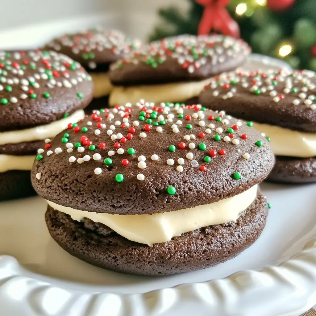 To make your whoopie pies festive, use sprinkles. Red and green sprinkles add a holiday touch. After frosting, sprinkle them on the sides. You can also add crushed peppermint candies for extra flavor. For a fun twist, drizzle melted chocolate on top. This adds a rich taste and a beautiful look. Serve these whoopie pies on a festive platter to impress your guests. Enjoy the smiles they bring!