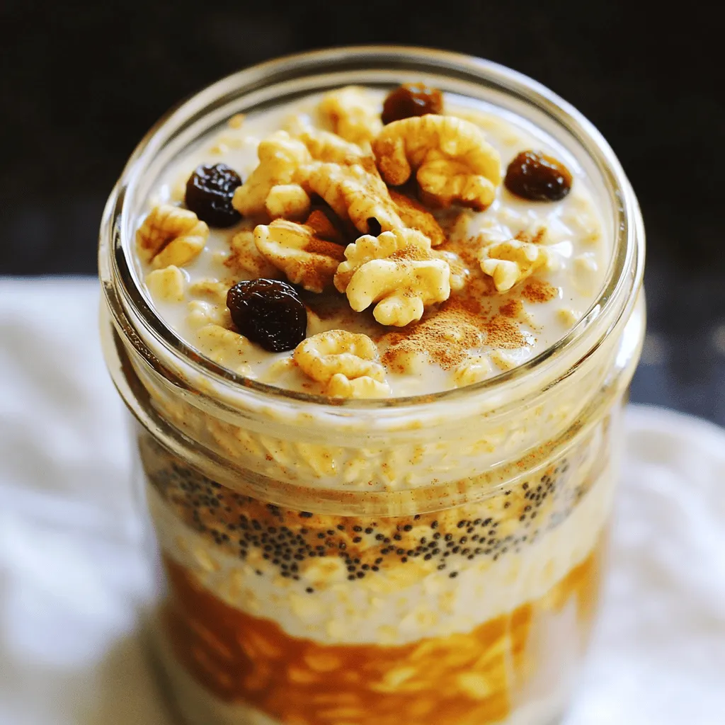 ![To start making your cinnamon roll overnight oats, you need these key items: - 1 cup rolled oats - 1 cup unsweetened almond milk (or milk of choice) - 1 tablespoon chia seeds - 1 tablespoon maple syrup (or honey) - 1 teaspoon ground cinnamon - 1/2 teaspoon vanilla extract These ingredients create a creamy base, full of flavor. The oats soak in the almond milk and sweet syrup. The chia seeds add a nice texture and help thicken the mix. You can enhance your oats with these fun add-ins: - 1/4 cup Greek yogurt (optional) - 2 tablespoons raisins or dried cranberries - Chopped nuts (walnuts or pecans) for topping Greek yogurt adds creaminess. Raisins or cranberries give a sweet burst. Nuts add crunch and heartiness to your meal. Each serving of these delightful oats is packed with nutrition. Here’s what you get: - Calories: Approximately 300 - Protein: 10 grams - Fiber: 8 grams - Sugars: 8 grams These oats are a great choice for breakfast. They fuel your day with wholesome ingredients. You can find the full recipe to make these delightful oats and enjoy a delicious start to your morning! To start, gather your ingredients. You need rolled oats, almond milk, chia seeds, and sweeteners. In a medium bowl, mix 1 cup of rolled oats with 1 cup of almond milk. Add 1 tablespoon of chia seeds and 1 tablespoon of maple syrup. Next, sprinkle in 1 teaspoon of ground cinnamon and 1/2 teaspoon of vanilla extract. Stir everything together until well combined. This mix forms the base of your delicious overnight oats. After preparing the base, you can add extra creaminess if you want. Fold in 1/4 cup of Greek yogurt if you like a richer taste. It makes the oats smooth and tasty. Then, gently add 2 tablespoons of raisins or dried cranberries. These fruits give a sweet burst in every bite. Make sure all the ingredients blend well together. This step is key for a balanced flavor. Cover your bowl or jar tightly. Place it in the fridge overnight, or for at least 4 hours. This waiting time allows the oats to soak up all the liquid. In the morning, stir the mixture well. If it feels too thick, add a splash of almond milk until it reaches your desired texture. Serve your oats cold or at room temperature. Top with chopped nuts for crunch and a sprinkle of cinnamon for extra flavor. Enjoy this delightful breakfast treat! For the complete recipe, check out the Full Recipe. To make your oats creamy, use rolled oats. They soak up liquid well. I often add chia seeds for extra creaminess. They also help the oats thicken. If you want a richer texture, add Greek yogurt. Mix it in with the oats before refrigerating. This step makes a big difference. You can switch up the flavor easily. Try adding vanilla extract or even almond extract. For a fruity twist, mix in fresh or frozen berries. You could also use different spices like nutmeg or pumpkin spice. These changes keep your oats exciting and fun. Toppings can elevate your oats. Chopped nuts are a great choice for crunch. Walnuts and pecans work best. You can also add a sprinkle of cinnamon for extra flavor. For sweetness, drizzle a bit of maple syrup or honey on top. This gives your oats a delightful finish. For the full recipe, check [Full Recipe]. {{image_2}} You can easily make vegan cinnamon roll overnight oats. Just swap almond milk with oat or soy milk. Use maple syrup instead of honey for sweetness. For creaminess, skip the Greek yogurt or use a plant-based yogurt. These simple swaps keep the flavors rich and satisfying. You’ll enjoy a vegan treat that tastes just as delightful. For a fun twist, add chocolate chips to the mix. Just stir in a handful of mini chocolate chips before refrigerating. The chocolate melts slightly, giving a rich taste. It pairs well with the cinnamon flavor. This variation is perfect for chocolate lovers, making breakfast feel like a treat. If you want extra protein, mix in Greek yogurt. It adds creaminess and boosts nutrition. Combine the yogurt with your oats, milk, and other ingredients. This version keeps you full longer, making it great for busy mornings. You might even notice a richer taste, which makes each bite even more enjoyable. You can find the full recipe for cinnamon roll overnight oats to explore these variations! Storing leftover cinnamon roll overnight oats is easy. Place them in a sealed container. This keeps the oats fresh and prevents spills. If you have a portion left, just scoop it into a jar. Make sure to use a lid to cover it tightly. I suggest using glass jars or airtight plastic containers. Glass jars let you see the oats inside. They are also good for the environment. Plastic containers are lightweight and easy to carry. Choose a container that fits your fridge space. Your cinnamon roll overnight oats last about 3 to 5 days in the fridge. The oats may become thicker over time. Add a splash of almond milk to make them creamy again. You can enjoy them cold or warm. To heat them, pop them in the microwave for about 30 seconds. Stir and check the temperature before eating. Enjoy your delicious breakfast treat anytime! For the full recipe, check the link above. Yes, you can make these oats in advance. I often prepare them the night before. This lets the oats soak up all the flavors. You can store them in the fridge for up to three days. Just keep them in an airtight container. You can use any milk you prefer. Cow's milk, soy milk, or oat milk works well too. Each option gives a different flavor. Choose what you like best or what you have at home. To make more servings, simply double or triple the ingredients. For example, use 2 cups of oats and 2 cups of milk for four servings. Just keep the same ratio. This will help maintain the taste and texture. Absolutely! This recipe is perfect for meal prep. You can make several jars at once. Just store them in the fridge. Each morning, grab one and enjoy a quick, tasty breakfast. Cinnamon Roll Overnight Oats are easy to make and full of flavor. You can customize them to match 