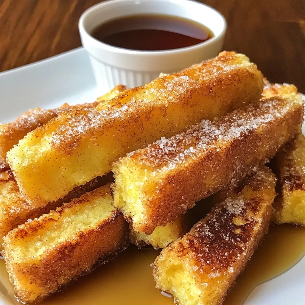 Delicious and crispy French toast sticks coated in cinnamon sugar, perfect for dipping.