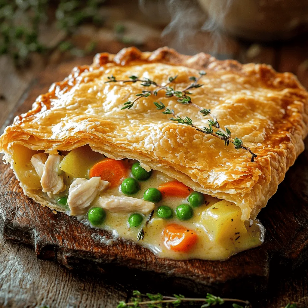 ![- 2 cups cooked chicken, diced - 1 cup frozen peas and carrots mix - 1 cup potatoes, peeled and diced - 1/2 cup onion, diced - 1/2 cup celery, diced - 1 cup chicken broth - 1 cup milk - 1/3 cup butter - 1/3 cup all-purpose flour - 1 teaspoon garlic powder - 1 teaspoon dried thyme - Salt and pepper to taste - 1 package (2) refrigerated pie crusts - 1 egg, beaten (for egg wash) - Fresh herbs (e.g., parsley, rosemary) - Different vegetable options (e.g., corn, green beans) - Alternative crusts (e.g., biscuit topping, puff pastry) To create my classic chicken pot pie, I gather all the essential ingredients. These items form the base of a comforting meal that warms the heart. Required Ingredients: I start with two cups of cooked chicken, diced into bite-sized pieces. It’s perfect for a hearty filling. Next, I add one cup of frozen peas and carrots, which brings in color and sweetness. One cup of peeled and diced potatoes adds a nice texture and makes it filling. The base gets flavor from half a cup of diced onion and half a cup of diced celery. For the sauce, I use one cup of chicken broth and one cup of milk. These make the filling creamy and rich. I also need one-third cup of butter and one-third cup of all-purpose flour to create a roux. This roux thickens the sauce. To season, I use one teaspoon of garlic powder and one teaspoon of dried thyme. Salt and pepper help enhance all the flavors. Finally, I grab one package of refrigerated pie crusts, which makes assembly easy. I like to brush the top crust with one beaten egg for a lovely golden finish. Optional Ingredients: For those who want to mix it up, I suggest fresh herbs like parsley or rosemary. They add a fresh note. You can also swap in different vegetables like corn or green beans to suit your taste. If you want a twist, consider using a biscuit topping or puff pastry instead of a traditional crust. With these ingredients ready, you are set for a delightful cooking experience. You can find the Full Recipe to guide you through each step. - Preheat the oven to 425°F (220°C). - Gather your vegetables and cooked chicken. Start by chopping your onion, celery, and potatoes into small pieces. This helps them cook evenly. Make sure your chicken is already cooked and diced. You can use rotisserie chicken for ease. - Sauté onions and celery. In a large saucepan, melt the butter over medium heat. Add the diced onion and celery, cooking until soft, about 3-4 minutes. Stir them often to avoid burning. - Make the creamy filling sauce. Next, stir in the flour, garlic powder, thyme, salt, and pepper. Cook this mixture for about a minute. Then, slowly add the chicken broth and milk. Stir constantly until the mixture thickens and is smooth. Bring it to a gentle simmer. - Combine chicken and vegetables with the sauce. Now, add the cooked chicken, peas, carrots, and potatoes to the sauce. Mix well to combine everything. Remove the pan from heat. - Roll out the pie crusts. Take one pie crust and roll it out into a 9-inch pie plate. Make sure it hangs over the edges a bit. - Add filling and cover with the second crust. Pour the chicken filling into the pie crust. Next, place the second pie crust on top. Seal the edges by pressing them together. Cut small slits on the top for steam to escape. - Brush with egg wash and cut steam slits. Use the beaten egg to brush the top crust. This gives it a beautiful golden finish. - Bake until golden brown. Place the pie in the oven and bake for 30-35 minutes. Check for a golden brown crust. If the edges brown too quickly, cover them with foil. - Cooling and serving instructions. Let the pie cool for 10 minutes before serving. This helps the filling set. Enjoy your comforting chicken pot pie! You can find the Full Recipe with all the details and tips to make this dish even better. To make your chicken pot pie shine, focus on seasoning. Use salt and pepper to enhance the flavors. Add garlic powder and dried thyme for depth. You can also try fresh herbs like parsley or rosemary. For the chicken, poach it gently in broth. This keeps it tender and juicy. A flaky crust is key to a great pot pie. Use cold butter and cold water when making your dough. This helps create those lovely layers. When rolling out the crust, avoid overworking it. This can make it tough. To prevent a soggy bottom, pre-bake the crust for a few minutes before adding the filling. This step helps keep it crisp. Serve your chicken pot pie hot from the oven. For a lovely touch, sprinkle fresh herbs on top. This adds color and flavor. Pair it with a simple side salad or roasted vegetables. These sides balance the richness of the pie. For a fun twist, serve pot pie in individual ramekins. This makes each serving special. For the complete recipe, check out the [Full Recipe]. {{image_2}} You can switch up the protein in your chicken pot pie. Leftover turkey works great. It gives the same comfort but with a new twist. If you want a veggie option, use mushrooms and beans. They add great flavor and texture. You can also play with the vegetables. Use whatever you have on hand. Green beans, corn, or bell peppers can make the dish pop. Try mixing in sweet potatoes for a hint of sweetness. This keeps the recipe fresh and exciting. Getting creative with how you serve chicken pot pie can be fun. Try making chicken pot pie cups. Use muffin tins and cut the crust into smaller rounds. Fill each cup with the creamy filling. Bake until golden for a fun twist. Another quick method is skillet pot pie. Cook everything in a skillet on the stove. Top with a layer of crust and bake until bubbly. This method saves time and gives you a crispy bottom. Switching up the sauce can change the whole dish. You can use cream of mushroom soup for a rich taste. It adds a nice creaminess and flavor. Another option is cream of celery soup. This gives a lighter taste but still keeps it rich. If you want a cheesy flavor, mix in some shredded cheese. Cheddar or Gruyère works well. It adds 