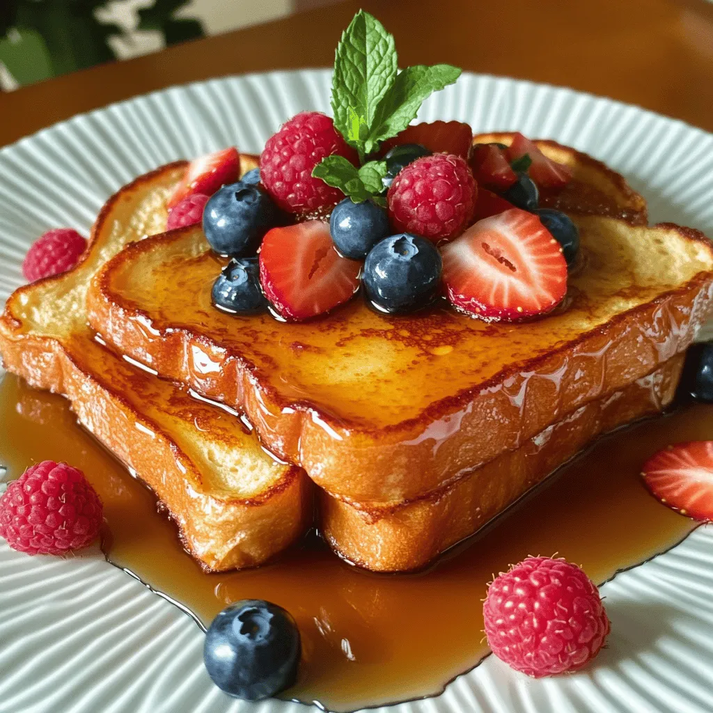 To make a great Classic French Toast, you need a few key ingredients: - 4 slices of thick bread (preferably brioche or challah) - 2 large eggs - 1 cup milk (any type) - 1 teaspoon vanilla extract - 1 teaspoon ground cinnamon - 1 tablespoon sugar (optional) - 1 tablespoon butter (for frying) The bread is the star here. Brioche and challah are soft, buttery, and soak up the egg mixture well. The egg and milk mixture gives the toast its rich flavor. Vanilla and cinnamon add warmth, while sugar sweetens it up. Now, let’s talk about toppings. They can really make your French toast pop. - Maple syrup varieties: You can use classic maple syrup or try flavored ones like vanilla or cinnamon. - Fresh fruit options: Berries like strawberries, blueberries, or raspberries add freshness. Bananas also work great. - Additional toppings: Powdered sugar gives a nice touch. Whipped cream adds creaminess and fun. These simple toppings add flavor and make your dish look beautiful. Enjoy your Classic French Toast with your favorite toppings from the Full Recipe! To make the perfect batter, start with a large bowl. Add two eggs and one cup of milk. Whisk them together well to combine. Use a steady motion to create air bubbles. This frothiness helps the French toast rise. Add one teaspoon of vanilla extract, one teaspoon of ground cinnamon, and sugar if you like it sweet. Whisk again until the mixture looks smooth and airy. Preheat your skillet or griddle over medium heat. Melt one tablespoon of butter in the pan. Make sure it coats the bottom evenly to prevent sticking. Once the butter is hot, dip each bread slice into the egg mixture. Let it soak for just a few seconds on each side. You want it wet but not falling apart. Place the soaked bread in the skillet. Cook for 2-3 minutes on each side until it turns a lovely golden brown. Keep an eye on it to avoid burning. To serve, place the French toast on a nice plate. Drizzle warm maple syrup over the top. Add fresh berries like strawberries, blueberries, or raspberries for color. A sprig of mint can make it look fancy. Pair this with a hot cup of coffee or a glass of fresh juice. Enjoy! To get the best texture, soak the bread for about 10 seconds on each side. You want it wet but not falling apart. Use a medium heat on your skillet. If it’s too hot, the outside burns before the inside cooks. If it’s too low, the toast gets soggy. One big mistake is over-soaking the bread. If you leave it too long, it turns mushy. Another mistake is using the wrong heat setting. Too high will burn the toast, while too low will dry it out. Keep an eye on the toast as it cooks. Flip it when it’s golden brown. For a detailed recipe, check the Full Recipe for Classic French Toast. {{image_2}} You can make French toast exciting with fun flavors. Try these: - Cinnamon French Toast: Add more cinnamon for a warm taste. Just mix a bit more into the egg mixture. It brings a sweet and cozy feeling to each bite. - Chocolate Chip French Toast: After dipping the bread, sprinkle chocolate chips on top before cooking. The chips will melt slightly, giving you a decadent treat. Everyone loves chocolate! - Savory French Toast Options: For a twist, skip the sugar and vanilla. Instead, mix in herbs like thyme or rosemary. Top with cheese and avocado for a savory delight. You might want to change some ingredients for health reasons or taste. Here are a few swaps: - Dairy-Free Alternatives for Milk: You can use almond, soy, or oat milk instead of regular milk. These options work well and keep the French toast creamy. - Gluten-Free Bread Choices: If you need gluten-free bread, look for brands that are soft and thick. They will hold up better when soaked in the egg mixture. These variations and swaps can help you find the perfect French toast recipe that fits your taste and needs. For the full recipe, be sure to follow the steps to create your own delicious French toast. To store leftover French toast, place it in the fridge. Use an airtight container to keep it fresh. You can also freeze French toast. Wrap each slice in plastic wrap, then place them in a freezer bag. This way, they won't stick together. When you're ready to eat your French toast, reheating is simple. The best method is using a toaster or a skillet. For a toaster, pop the slices in until warm. If you use a skillet, heat it on low. Add a bit of butter to keep the toast moist. Cook for a couple of minutes on each side. This helps keep the texture nice and fluffy. Enjoy your delicious French toast again! For the full recipe, check out the Heavenly Classic French Toast section. I recommend using thick bread for the best texture. Brioche and challah are top choices. They soak up the egg mixture well and cook to a nice golden brown. Both types have a rich flavor that makes French toast special. If you want a different twist, try sourdough or Texas toast. They can add a nice crunch, too. Yes, you can make French toast ahead! Prepare the batter and soak the bread slices. Then, store them in the fridge for up to one day. Just cook them when you're ready to serve. You can also freeze cooked French toast. Place slices in a single layer on a baking sheet, then freeze. Once frozen, put them in a bag. To reheat, just pop them in the toaster or oven. You can definitely make egg-free French toast! Use mashed banana or unsweetened applesauce as a substitute. Another great option is using silken tofu, blended until smooth. For a simple mix, combine one tablespoon of ground flaxseed with three tablespoons of water. Let it sit for a few minutes until it thickens. This will help bind the ingredients together, just like eggs do. This blog post covered key ingredients and steps to make great French toast. We explored bread choices and how to prepare the perfect egg mixture. You learned about cooking tips for golden results and creative topping ideas. By following these simple steps, you can enjoy a delicious breakfast. Remember to experiment with flavo