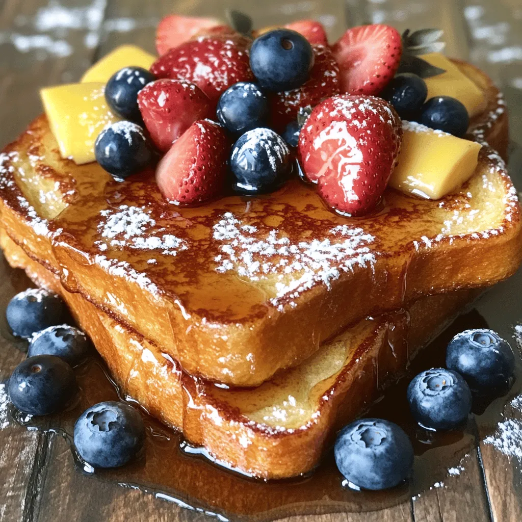To make classic French toast, you need the following ingredients: - 4 slices of thick brioche or challah bread - 2 large eggs - 1/2 cup milk (any kind you prefer) - 1 teaspoon vanilla extract - 1 teaspoon ground cinnamon - 1 tablespoon sugar (optional) - Pinch of salt - 2 tablespoons unsalted butter - Maple syrup, for serving - Fresh fruit (e.g., strawberries, blueberries, or bananas), for garnish - Powdered sugar, for dusting (optional) Each ingredient plays a key role. The bread gives it structure. Eggs create a rich texture. Milk adds creaminess. Vanilla and cinnamon bring flavor. Sugar adds sweetness, but it’s not a must. Butter helps with cooking and adds a nice taste. Toppings can elevate your French toast. Here are some suggestions: - Maple syrup: The classic choice. It adds sweetness and flavor. - Fresh fruit: Strawberries, blueberries, or bananas brighten the dish. - Powdered sugar: A light dusting offers a touch of elegance. - Whipped cream: Adds a fluffy texture and richness. - Nuts: Chopped walnuts or pecans add crunch. Feel free to mix and match. Make it your own! You can swap some ingredients if needed: - Bread: Use any thick bread, like sourdough or whole wheat. - Milk: Almond milk or oat milk works well for a dairy-free option. - Eggs: For a vegan option, use flaxseed meal mixed with water. - Sugar: Honey or maple syrup can replace sugar. These swaps still give you that delicious flavor. Enjoy experimenting! For the complete recipe, check out the Full Recipe. To start, gather your ingredients. You will need: - 4 slices of thick brioche or challah bread - 2 large eggs - 1/2 cup milk (any kind you prefer) - 1 teaspoon vanilla extract - 1 teaspoon ground cinnamon - 1 tablespoon sugar (optional) - Pinch of salt - 2 tablespoons unsalted butter - Maple syrup, for serving - Fresh fruit (e.g., strawberries, blueberries, or bananas), for garnish - Powdered sugar, for dusting (optional) In a large bowl, whisk together the eggs and milk. Add the vanilla, cinnamon, sugar, and salt. Mix well until smooth. This simple mixture holds the key to rich flavor. Now, preheat a non-stick skillet or griddle over medium heat. Add 1 tablespoon of butter and let it melt. This ensures that the bread cooks evenly. Next, dip each slice of bread into the egg mixture. Let it soak for about 10-15 seconds on each side. You want it to absorb enough liquid, but not fall apart. Place the soaked bread on the hot skillet. Cook for about 3-4 minutes on each side. Look for a golden brown color and a slight crisp. This gives your French toast a delightful texture. Repeat this process until all slices are cooked. - Use thick slices of bread. They hold more egg mixture and stay soft inside. - Don’t rush the soaking. Let the bread soak enough to absorb flavor. - Keep the heat medium. Too hot can burn the outside before the inside cooks. - Add more butter as needed for each batch. This keeps everything moist and tasty. - For a special touch, serve with maple syrup, fresh fruit, and a dusting of powdered sugar. These tips will help you enjoy classic French toast at its best! For the full recipe, check out the details above. To make the best classic French toast, use thick bread like brioche or challah. These types soak up the egg mixture well and stay soft inside. Start with fresh eggs and milk for the best flavor. Mix them in a bowl with vanilla, cinnamon, and sugar. Whisk until it’s smooth. When soaking the bread, dip each slice for about 10-15 seconds. Don’t let it sit too long; you want it moist, not soggy. Preheat your skillet on medium heat. Add butter to coat the pan, and then place the soaked bread on it. Cook each side for about 3-4 minutes. You want them golden brown and a bit crispy. Serve with maple syrup and fresh fruit for a treat. One common mistake is using thin bread. Thin bread cooks too fast and can fall apart. Another mistake is not preheating the skillet. If it’s not hot enough, the bread will absorb too much butter and become greasy. Also, don’t overcrowd the pan. Cook in batches to give each slice space to cook evenly. Avoid using too much egg mixture. If the slices are too wet, they won’t cook right. Lastly, don’t skip the cinnamon! It adds warmth and flavor that makes your French toast special. Want to save time? Prepare the egg mixture the night before. Store it in the fridge, and mix in your spices. In the morning, just dip and cook your bread. You can also use leftover bread. Stale bread works great for French toast. Cut it into slices ahead of time, and keep it in a bag. This way, you have your bread ready to go. If you want to serve a crowd, cook extra slices at once. Keep them warm in the oven until ready to serve. For a quick clean-up, use a non-stick skillet. It makes cooking easier and helps with clean-up. Follow these tips, and you’ll have a delicious breakfast in no time! For the full recipe, check out the details provided earlier. {{image_2}} You can add fun flavors to your French toast. Try adding a splash of orange juice to the egg mix. It gives a bright taste. You can also use almond or hazelnut extract instead of vanilla. Want a spicy kick? Mix in a dash of nutmeg or cardamom. For chocolate lovers, use cocoa powder in the egg mix. You can even use flavored creamers instead of milk for a rich twist. French toast is not just for sweet lovers. For a savory option, skip the sugar and vanilla. Add herbs like thyme or rosemary to the egg mix. Top it with cheese or crispy bacon after cooking. A sprinkle of salt can elevate the taste. Sweet options are great too! Use maple syrup, fresh fruit, or whipped cream. The choice is yours! During the holidays, you can spice things up. Add pumpkin puree and pumpkin spice for fall. In winter, try a peppermint extract twist. For summer, use fresh berries in the batter. You can even serve it with a berry compote. For special occasions, serve with a dollop of cream. These variations can make any time feel festive. If you want the 