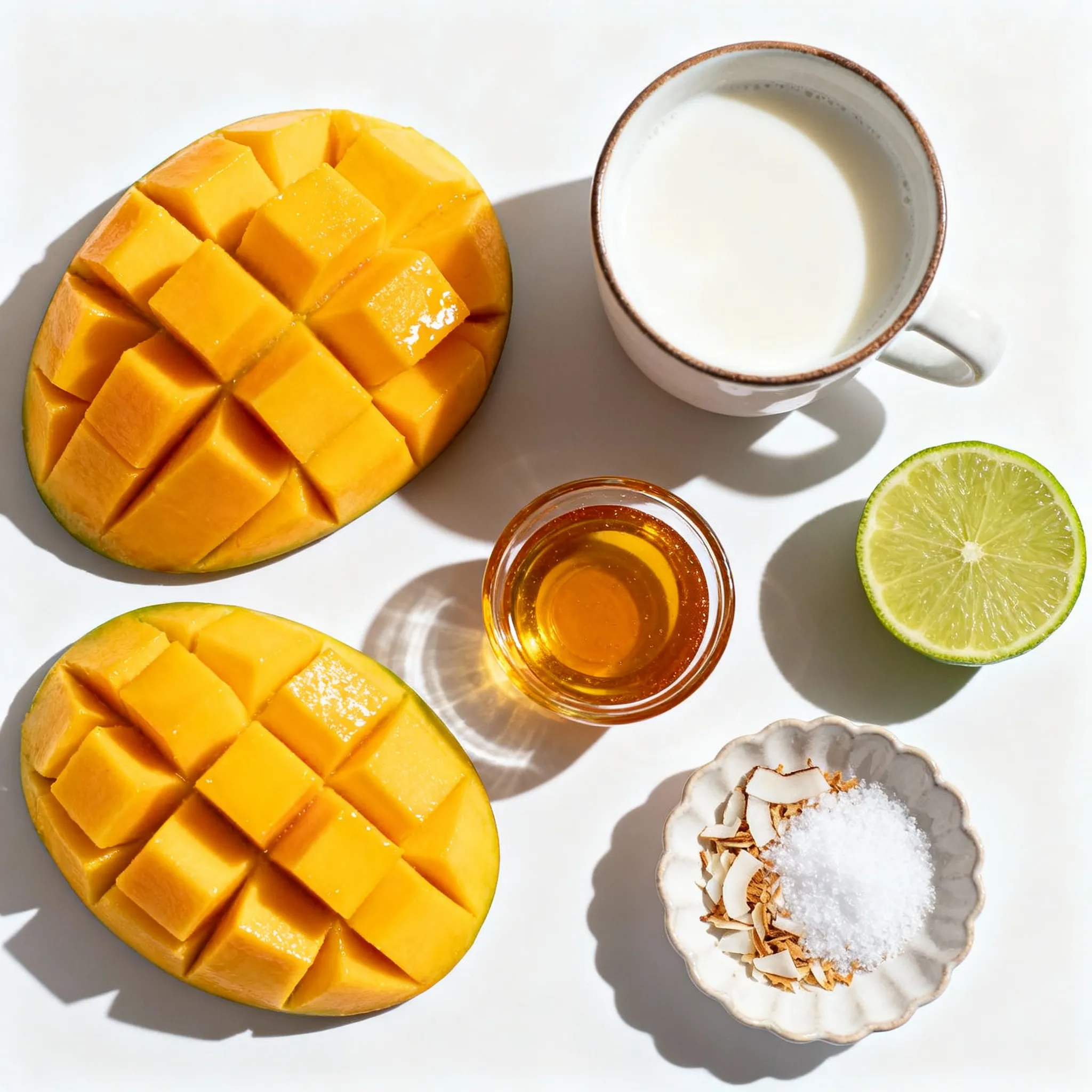 In a blender, combine the diced mangoes, coconut milk, honey (or agave syrup), lime juice, and a pinch of salt.