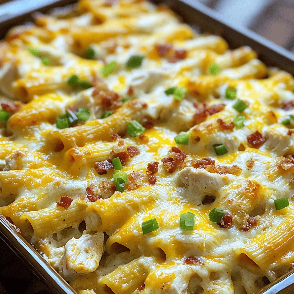 - 12 oz ziti pasta - 2 cups cooked, shredded chicken - 1 (8 oz) package cream cheese, softened - 1 cup ranch dressing Crack Chicken Baked Ziti has simple but tasty ingredients. Ziti pasta gives it a hearty base. I like using cooked, shredded chicken for ease and flavor. Cream cheese adds richness, while ranch dressing brings a zesty twist. - 1 cup shredded sharp cheddar cheese - 1 cup shredded mozzarella cheese - 1/2 teaspoon garlic powder - 1/2 teaspoon onion powder - 1/4 teaspoon black pepper - 1/4 teaspoon paprika Cheese makes this dish creamy and gooey. I use sharp cheddar for a bold flavor and mozzarella for meltiness. The spices, like garlic and onion powder, add depth to each bite. Black pepper and paprika give a slight kick. - 1 cup cooked and crumbled bacon (optional) - Chopped green onions for garnish Bacon adds a nice crunch and smoky flavor. If you want to impress, sprinkle crumbled bacon on top. Green onions give a fresh touch and bright color when serving. You can find the full recipe for all these tasty elements in one place. 1. First, preheat your oven to 375°F (190°C). This step is key for even baking. 2. Next, cook the ziti pasta. Follow the package instructions until it is al dente. Drain the pasta and set it aside. 3. In a large mixing bowl, combine an 8 oz package of softened cream cheese and 1 cup of ranch dressing. Mix until the mixture is smooth and creamy. This is the heart of the dish. 1. Now, add 2 cups of cooked, shredded chicken to the bowl. Also, add 1/2 teaspoon of garlic powder, 1/2 teaspoon of onion powder, 1/4 teaspoon of black pepper, and 1/4 teaspoon of paprika. Stir well until the chicken is fully coated with the creamy mixture. 2. Gently fold in the cooked ziti pasta along with 1 cup of shredded sharp cheddar cheese and 1 cup of shredded mozzarella cheese. Make sure everything is evenly combined for the best flavor. 1. Transfer the entire mixture into a greased 9x13 inch baking dish. Spread it out evenly to ensure it bakes well. 2. Top the mixture with the remaining shredded cheddar and mozzarella cheeses. This will create a delicious, cheesy crust. 3. Bake in your preheated oven for 25-30 minutes. Look for a bubbly and slightly golden top. 4. Once done, remove from the oven and let it cool for a few minutes. Garnish with chopped green onions before serving. Enjoy this comforting meal! For more details, refer to the Full Recipe. To get the right pasta texture, cook the ziti until it is al dente. This means it should still have a slight bite. If you cook it too long, it can become mushy in the oven. Always drain the pasta well. This keeps it from adding extra moisture to your dish. Mixing ingredients evenly is key. I recommend using a large bowl. Start with the cream cheese and ranch dressing. Blend them well before adding anything else. Then, mix in the chicken and seasonings. Finally, fold in the cooked ziti and cheese slowly. This way, everything gets coated nicely. To boost the flavor, you can add more spices. Try adding a pinch of red pepper flakes for heat. Fresh herbs, like parsley or basil, can brighten the dish too. If you want a tangy twist, add a splash of lemon juice. Adjust spice levels to your taste. If you like it mild, stick to the basic seasonings. For more kick, add cayenne pepper or more black pepper. Always taste the mix before baking. This way, you can tweak it to your liking. To avoid soggy pasta, remember to drain and cool the ziti. Don't let it sit in water. The key is to mix it in right away with the creamy sauce. Watch the cheese while it bakes. Cover the dish with foil for the first half of baking. This keeps the cheese from burning. After 15 minutes, you can remove the foil. This lets the cheese melt and bubble nicely without overcooking. For a full recipe, check the details above. {{image_2}} You can change this dish to suit your taste. Here are some ideas: - Different cheese options: Try using gouda or pepper jack for a fun twist. You can also mix in some feta for tanginess. The cheese really makes this dish shine. - Using leftover rotisserie chicken: This is a great way to save time. Just shred the chicken right off the bone. It adds lots of flavor and makes prep quicker. We all have different needs when we eat. Here are some ways to adapt this dish: - Gluten-free substitutions: Use gluten-free ziti or any gluten-free pasta. This way, everyone can enjoy the meal without worry. - Vegetarian or low-carb adaptations: For a vegetarian version, swap out the chicken for mushrooms or zucchini. For a low-carb option, use spaghetti squash instead of pasta. Both choices keep the dish tasty. Pair this baked ziti with great sides to make a meal. Here are some ideas: - Pairings that complement the dish: Serve with garlic bread or a fresh green salad. A light vinaigrette works well to balance the creamy ziti. - Ideas for sides and salads: A classic Caesar salad or a simple cucumber salad can add crunch. These sides brighten the meal and bring freshness. These variations and ideas will help you create a dish that's just right for you. For the full recipe, be sure to check the main sections above. To keep your Crack Chicken Baked Ziti fresh, use an airtight container. This helps prevent spoilage and keeps flavors intact. Place it in the fridge right after it cools. It will last about 3 to 4 days. Make sure to enjoy it within this time frame for the best taste. If you want to save some for later, freezing is a great option. First, let the baked ziti cool completely. Then, cut it into portions for easy meals. Wrap each portion tightly in plastic wrap. Place them in a freezer-safe bag or container. It can last for up to 3 months in the freezer. To reheat, let it thaw in the fridge overnight. Then, bake it at 350°F (175°C) until hot. Preparing Crack Chicken Baked Ziti ahead of time is simple. Cook the ziti and chicken the day before. Store them separately in the fridge. You can mix the creamy sauce and spices too. This way, all componen