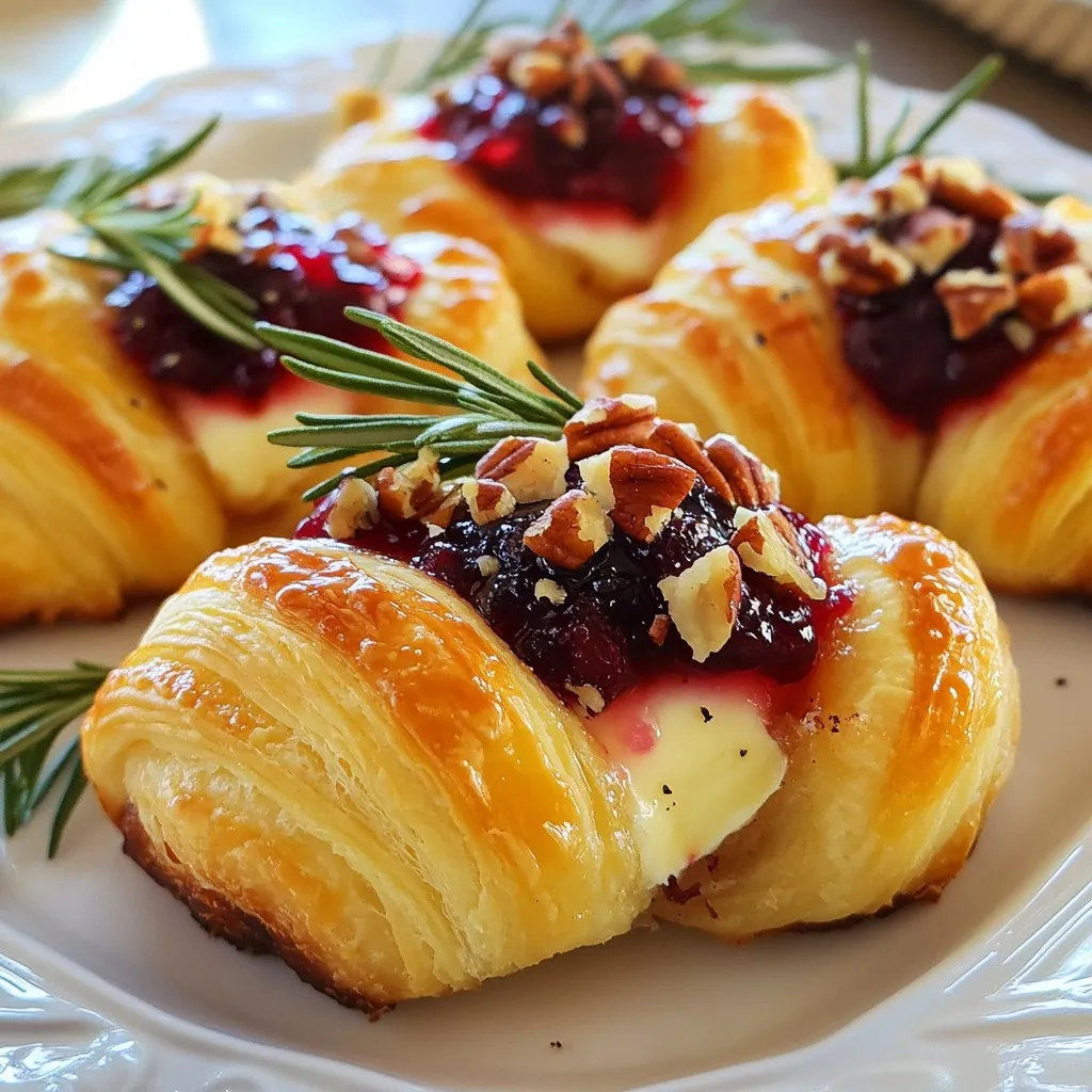 Delicious bites of crescent dough filled with Brie cheese, cranberry sauce, and honey, perfect for a festive appetizer.