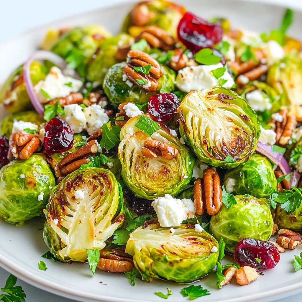 A delicious and vibrant salad featuring roasted Brussels sprouts, dried cranberries, and pecans, topped with a tangy dressing.