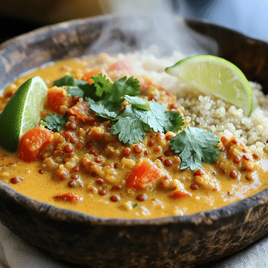 ![To make Creamy Coconut Lentil Curry, gather these simple ingredients: - 1 cup red lentils, rinsed and drained - 1 can (14 oz) coconut milk - 1 medium onion, finely chopped - 3 cloves garlic, minced - 1-inch piece of ginger, minced - 1 tablespoon curry powder - 1 teaspoon ground cumin - 1/2 teaspoon turmeric powder - 1 can (14 oz) diced tomatoes - 2 cups vegetable broth - 1 tablespoon vegetable oil - 1 tablespoon lime juice - Salt and pepper to taste - Fresh cilantro, for garnish Using fresh ingredients can enhance the flavor. If you can’t find fresh ginger, you can use ground ginger. For the spices, fresh spices give a stronger flavor than dried ones. If you have dried spices, use them, but try to add them earlier in the cooking process. If you’re out of red lentils, you can substitute with green or brown lentils. Keep in mind that these will take longer to cook. Also, if you want a creamier texture, try using full-fat coconut milk instead of light coconut milk. Using vegetable broth adds depth to the dish, but you can easily swap it with water if needed. The lime juice adds a fresh kick, so don’t skip it! Fresh cilantro makes a great garnish, but if you don’t like it, parsley works too. This recipe is flexible, so feel free to adjust based on what you have. For the full recipe, check the main article. To make a great Creamy Coconut Lentil Curry, you need to prepare well. Start by gathering all your ingredients. This makes cooking easier and more fun. Accurate measuring helps you get the right taste. For this dish, use a cup for the lentils and a can for the coconut milk. Sautéing the vegetables is key for flavor. Heat your vegetable oil in a pot over medium heat. Add the chopped onion first. Cook it until it turns soft and a little clear, about five minutes. This step brings out the onion's sweet taste. Next, add minced garlic and ginger. Cook them for one to two minutes. You want to smell their lovely aroma. Add the spices next. Mix in the curry powder, cumin, and turmeric. Let them cook for a minute to release their flavors. This step makes your curry taste amazing. Now, let's cook the lentils. Pour in the diced tomatoes and vegetable broth. Stir everything well and bring it to a gentle boil. Add the rinsed lentils to the pot. Make sure to stir again. Cover the pot and let it simmer for about 20 minutes. The lentils should be soft and cooked through. After that, it’s time for the coconut milk. Stir it in along with lime juice. This adds creaminess and a nice zing. Season with salt and pepper to your liking. Heat everything for another five minutes. When it's ready, take the pot off the heat. Let it sit for a few minutes before you serve. This allows the flavors to blend nicely. Enjoy your creamy, flavorful meal over rice or quinoa. For a lovely touch, add fresh cilantro on top. For the full recipe, check out the [Full Recipe]. To cook lentils perfectly, start by rinsing them well. This removes any dust or debris. Use red lentils for this recipe; they cook fast and become soft. Adjusting spice levels is easy. If you like it mild, add less curry powder and cumin. For heat, add chili powder or fresh chili to the mix. Always taste as you go. Avoid common mistakes like overcooking lentils. When they turn mushy, they lose texture. Keep an eye on them while cooking. Also, don’t skip the lime juice; it brightens the dish. Serve Creamy Coconut Lentil Curry with fluffy rice or warm naan. Both soak up the sauce well. You can also try quinoa for a healthy twist. Garnish your curry for a beautiful look. Fresh cilantro adds color and flavor. A wedge of lime on the side is perfect for a zesty kick. Pair your meal with a light beverage. I recommend coconut water or a crisp white wine. They complement the curry and refresh your palate. For the full recipe, check out the complete guide to Creamy Coconut Lentil Curry. {{image_2}} You can easily adjust this creamy coconut lentil curry to fit your diet. First, it is vegan and vegetarian-friendly. Both options use the same base ingredients, so you get great flavor without meat. For gluten-free needs, this recipe already fits the bill. Just ensure that your vegetable broth is gluten-free. Always check labels when buying broth or other packaged items. If you want to add protein, try chicken or tofu. Cook chicken pieces in the pot before adding other ingredients. For tofu, use firm tofu, and sauté it until golden before mixing it in. Adding different vegetables can enhance the dish. Try spinach, bell peppers, or carrots. You can add them in the last few minutes of cooking for a nice crunch. Incorporating spices like coriander or cardamom can also change the flavor. These spices add a lovely warmth to the curry. You can also use fresh herbs like basil or mint for freshness. Regional adaptations make this recipe even more fun. For instance, add Thai red curry paste for a spicier kick. This gives it a whole new flavor profile. You can also make it Indian-style by adding garam masala or mustard seeds. So, feel free to play around with the ingredients. The creamy coconut lentil curry is all about your taste! After serving, let the curry cool down. Place it in an airtight container. This keeps it fresh. You can store the curry in the fridge for up to 4 days. When you're ready to eat it again, reheat it on low heat. Stir often to keep it from sticking. You want to avoid losing that rich flavor. To freeze the curry, let it cool completely. Use a freezer-safe container or bag. Be sure to leave some space for expansion. The curry can freeze well for up to 3 months. When you want to eat it, take it out of the freezer. Move it to the fridge for a night to defrost. To reheat, warm it gently on the stove. Add a splash of water or broth to keep it creamy and delicious. This way, you maintain the taste and texture. Enjoy your flavorful meal anytime! What makes the curry creamy? The creaminess comes from coconut milk. It adds richness and smoothness. When you 