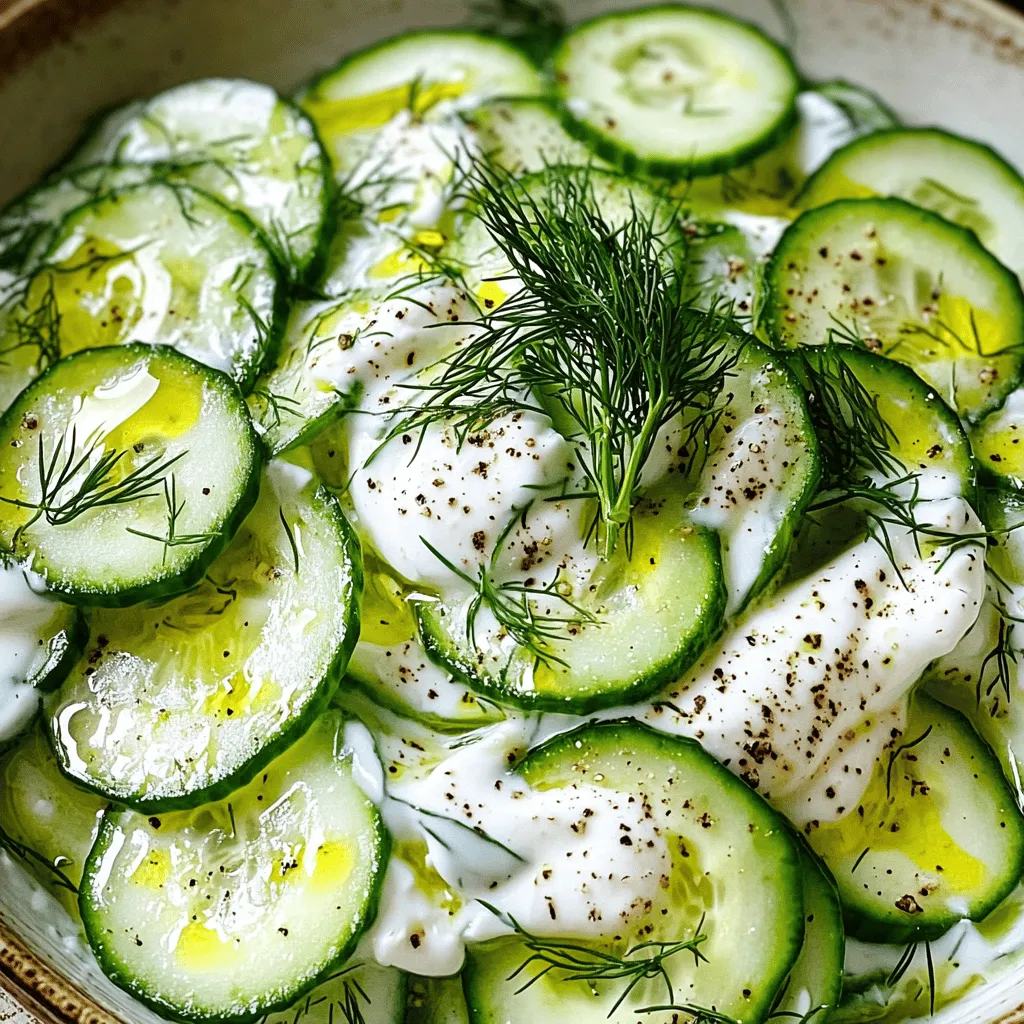 Gathering these ingredients will set you up for success. The cucumbers bring a crisp, refreshing crunch. The Greek yogurt and sour cream add a creamy base that makes this salad rich and smooth. Fresh dill gives it a bright flavor, while garlic adds a nice kick. The lemon juice brightens the mix, and olive oil ties it all together. You can use sugar to balance the flavors if you prefer a touch of sweetness.