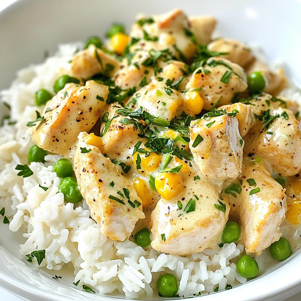 A delicious and creamy chicken dish served over fluffy jasmine rice, perfect for a comforting meal.