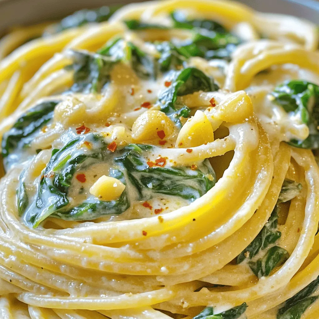 ![- Pasta options: You can choose spaghetti or any pasta you like. Fettuccine, penne, or even gluten-free options work well too. The key is to pick one that you enjoy. - Fresh spinach quantity and type: Use about 6 cups of fresh spinach, which is roughly 3 oz. Baby spinach is great for this dish because it wilts down nicely. - Garlic and its role in the recipe: You will need 4 cloves of garlic, minced. Garlic adds a wonderful flavor that makes this dish shine. It gives depth and richness when sautéed. - Cream and cheese selection: For creaminess, use 1 cup of heavy cream. Pair it with 1/2 cup of grated Parmesan cheese. This combo creates a smooth, rich sauce that coats the pasta perfectly. - Seasoning essentials: Use 1 teaspoon of salt and 1/2 teaspoon of black pepper for flavor. You can also add a 1/4 teaspoon of nutmeg for a hint of warmth. Fresh lemon juice, about 1 tablespoon, brightens the dish and adds a nice zing. Don't forget extra Parmesan and red pepper flakes for garnish if you like a little heat. This detailed list allows you to gather everything you need for your creamy garlic spinach pasta. For the full recipe, check out the [Full Recipe]. To cook the pasta, bring a large pot of salted water to a boil. Add the spaghetti and cook it until it is al dente. This means it should be firm but not hard. Check the package for the exact cooking time, usually around 8 to 10 minutes. While cooking, reserve 1/2 cup of the pasta water before draining. Set the pasta aside once it's done. For perfect garlic, heat the olive oil in the same pot or a large skillet over medium heat. Add the minced garlic and sauté for 1-2 minutes. You want the garlic to smell great and turn golden. Be careful here; burnt garlic tastes bitter. If you see it darkening too fast, lower the heat a bit. Add the fresh spinach to the pot next. Stir it in slowly until it wilts, which takes about 2-3 minutes. This step helps you waste little spinach and adds great flavor. Once the spinach is ready, lower the heat and pour in the heavy cream. Stir until it mixes well. Then, add the grated Parmesan, salt, pepper, and nutmeg if you wish. Mix until the cheese melts and the sauce gets creamy. Now, toss the drained pasta in the sauce. If the sauce seems too thick, add some of that reserved pasta water. Mix until the pasta is well coated. Finally, squeeze fresh lemon juice over it. This gives the dish a nice, bright flavor. Enjoy your creamy garlic spinach pasta! For full details, check the Full Recipe. One common mistake is overcooking garlic and cream. Garlic cooks quickly. If you burn it, it turns bitter. Sauté it just until golden. This usually takes 1 to 2 minutes. For the cream, avoid boiling it. High heat can separate the cream and ruin the sauce. Always keep the heat low when adding cream. Another mistake is having the wrong sauce consistency. If your sauce is too thick, it won’t coat the pasta well. If it's too thin, it may seem watery. Reserve some pasta cooking water. Add it slowly until you reach the right thickness. To boost flavor, consider adding herbs and spices. Fresh basil or thyme can elevate the dish. A pinch of red pepper flakes adds heat. You can also try a dash of garlic powder for more intensity. Fresh lemon juice is key too. It brightens the dish and balances the creaminess. Add it just before serving for the best taste. Presentation matters! Serve the pasta in shallow bowls. This showcases the creamy sauce. Top it with extra Parmesan cheese and a sprinkle of red pepper flakes. This adds color and texture. Pair your pasta with a simple green salad. A light vinaigrette complements the rich pasta. For drinks, a crisp white wine or sparkling water works well. These choices enhance the meal's flavors. For the complete recipe, don’t forget to check the Full Recipe! {{image_2}} You can add protein to your creamy garlic spinach pasta for a heartier meal. Chicken, shrimp, or tofu work great. - Chicken: Cook diced chicken in olive oil until golden. Then, mix it with the pasta and sauce. - Shrimp: Sauté shrimp until they turn pink. Add them right before tossing with the pasta. - Tofu: For a vegan option, cube firm tofu and pan-fry until crispy. Toss it in last for added texture. If you have dietary needs, there are great options. Gluten-free pasta is widely available. Look for rice or chickpea pasta. These options still taste great! For a vegan version, substitute cream with coconut cream or cashew cream. Nutritional yeast can replace Parmesan cheese to keep flavors rich. Using seasonal veggies can add freshness to your dish. Asparagus and peas are fantastic choices. - Asparagus: Trim and cut into pieces. Add them with spinach for a colorful touch. - Peas: Stir in fresh or frozen peas when adding spinach. They add sweetness and texture. You can also add more greens, like kale or Swiss chard. Just chop them finely and sauté with the garlic. This makes your pasta even more vibrant and healthy. For the full recipe, check the section above. To store leftover creamy garlic spinach pasta, follow these tips: - Allow the pasta to cool to room temperature. - Use an airtight container to keep it fresh. - Separate the sauce from the pasta if possible. This prevents sogginess. For best results, use glass or plastic containers with tight lids. They keep the flavors intact and help avoid spills. Reheating pasta can be tricky. You want to keep it creamy and warm. Here are some methods: - Use a skillet over low heat. Add a splash of water or cream. Stir often to mix. - You can also use a microwave. Place the pasta in a bowl, cover it, and heat in short bursts. Add a little cream to keep it moist. These methods help restore the creamy texture of your dish. In the fridge, creamy garlic spinach pasta lasts about three to four days. Ensure it stays in an airtight container. Look for these signs of spoilage: - A sour smell or taste. - Changes in color or texture. - Mold growth on the surface. Always trust your senses when c