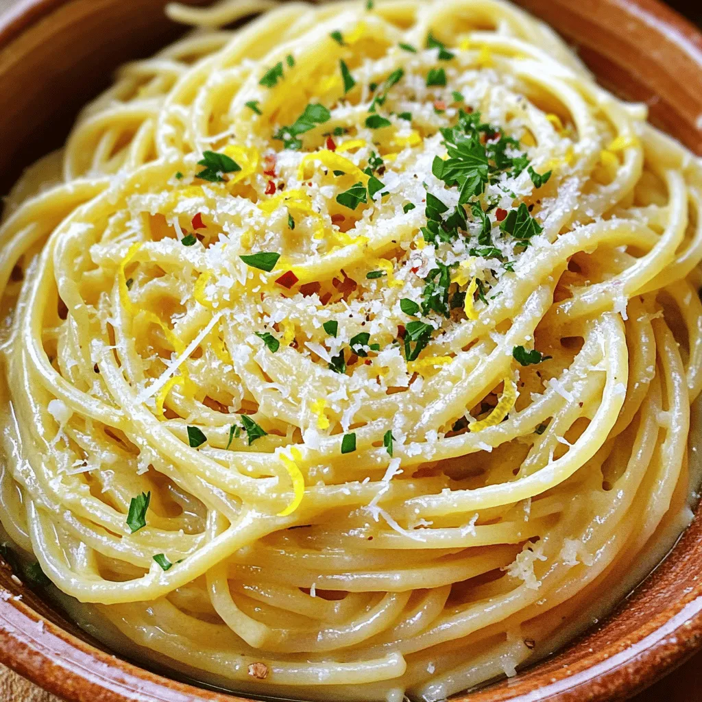 ![- 300g spaghetti or fettuccine - 3 tablespoons olive oil - 4 cloves garlic, minced - 1 cup heavy cream - 1 lemon (zest and juice) - 1/2 cup grated Parmesan cheese - Salt and pepper to taste - Fresh parsley, chopped (for garnish) - Red pepper flakes (optional, for a kick) - Additional herbs (such as basil or thyme) In this dish, you will find simple yet tasty ingredients. The pasta is the base. Spaghetti or fettuccine works best. I love using olive oil for its rich flavor. Garlic brings a nice aroma and taste. Heavy cream adds that creamy touch we all crave. Next, the lemon zest and juice give the dish a bright flavor. Parmesan cheese adds a salty richness. Don't forget salt and pepper to boost the taste. Fresh parsley makes a lovely garnish. You can change it up with red pepper flakes for heat. Other herbs like basil or thyme can add more flavor. This mix of ingredients makes a perfect weeknight meal. If you want the full recipe, it's just one click away! - Bring a large pot of salted water to a boil. - Cook pasta according to package instructions until al dente. Cooking pasta is simple. Start by boiling water. The salt adds flavor to the pasta. Once the water bubbles, add the pasta. Stir it gently to prevent sticking. Check the package for timing. Al dente means the pasta is firm but not hard. When it's done, reserve one cup of the water. This water will help with the sauce later. - Heat olive oil in a skillet over medium heat. - Sauté minced garlic until fragrant. - Add heavy cream and let simmer. Next, you’ll make the sauce. Heat olive oil in a large skillet. Use medium heat so the oil doesn't smoke. Add minced garlic and sauté for one to two minutes. The garlic should smell good, but don’t let it brown. Then, pour in the heavy cream. Stir it well and let it simmer for two to three minutes. This helps the flavors blend. - Incorporate lemon zest and juice into the sauce. - Stir in grated Parmesan cheese for creaminess. - Adjust sauce thickness with reserved pasta water. Now, it’s time to mix everything. Add lemon zest and juice to the sauce. This gives the dish a bright flavor. Next, stir in the grated Parmesan cheese. This makes the sauce rich and creamy. If the sauce feels too thick, add a splash of reserved pasta water. It helps to reach the perfect consistency. Finally, add the cooked pasta to the skillet. Toss it well in the sauce so every piece is coated. Season with salt and pepper to taste. For a kick, sprinkle in red pepper flakes if you like. You can find all these steps in detail in the Full Recipe. Enjoy your cooking! To prevent garlic from burning, always cook it on medium heat. Garlic cooks fast, so stay alert! Saute it until just fragrant, about 1-2 minutes. If it turns brown, it will taste bitter. For the right sauce thickness, start with heavy cream. Let it simmer on low heat for a few minutes. If it gets too thick, add a bit of the reserved pasta water. This helps create a smooth and creamy sauce. For an appealing dish, use shallow bowls. This allows the pasta to shine! Drizzle some olive oil on top and sprinkle fresh parsley and Parmesan cheese. It makes the dish look fancy. Pair this pasta with a simple salad or garlic bread. A light salad with lemon vinaigrette works well. You can also serve it with grilled vegetables for extra flavor. Use a large pot for boiling pasta. A deep skillet is perfect for making the sauce. A wooden spoon helps mix everything well. For pasta, spaghetti or fettuccine works best. Choose your favorite or whatever you have on hand. The key is to cook it to al dente for the best texture. For the [Full Recipe], refer to the steps above for a delicious meal. Happy cooking! {{image_2}} You can easily swap pasta types. Try whole wheat or gluten-free pasta. Both work well in this dish. They add different tastes and textures. For a dairy-free option, use coconut cream or cashew cream. These will mimic the rich creaminess of heavy cream. Nutritional yeast can replace Parmesan cheese for a cheesy flavor. Want to add some protein? Cooked chicken or shrimp makes a great addition. Just toss them in with the pasta for a hearty meal. You can also mix in seasonal veggies. Spinach or cherry tomatoes brighten the dish. They add color and nutrition, making your meal more vibrant. Love spice? Adjust the heat by using different peppers. Jalapeños add a fresh kick, while crushed red pepper gives warmth. Herbs can change the flavor too. Basil or thyme adds depth to the creamy sauce. Feel free to experiment and find your favorite mix! For more guidance, check the Full Recipe for ideas and tips. To store leftover creamy lemon garlic pasta, wait for it to cool. Place it in an airtight container. Glass or plastic containers work well. Make sure to seal the lid tightly. This helps keep the pasta fresh and tasty. To reheat your pasta, you can use two methods. The stovetop method is best for keeping the creaminess. Add a splash of water or cream to the skillet. Heat it on low and stir gently. For the microwave, place the pasta in a bowl. Cover it with a damp paper towel. Heat in short bursts, stirring in between. This way, the pasta warms evenly without drying out. Creamy lemon garlic pasta lasts in the fridge for about three days. Keep an eye on it. Check for signs of spoilage, like an off smell or mold. If you see any changes, it's best to throw it out. Enjoy your leftovers while they are still fresh! What can I substitute for heavy cream in Creamy Lemon Garlic Pasta? You can use whole milk mixed with a bit of butter. This will give you a creamier texture. Another option is coconut milk for a dairy-free choice. It adds a nice flavor too. Can I make this dish vegan? Yes, you can make it vegan! Use coconut cream or cashew cream instead of heavy cream. Replace Parmesan with nutritional yeast or vegan cheese. This keeps the dish creamy and tasty. Should I rinse pasta after cooking? No, do not rinse your pasta. Rinsing removes the starch that helps the sauce stic