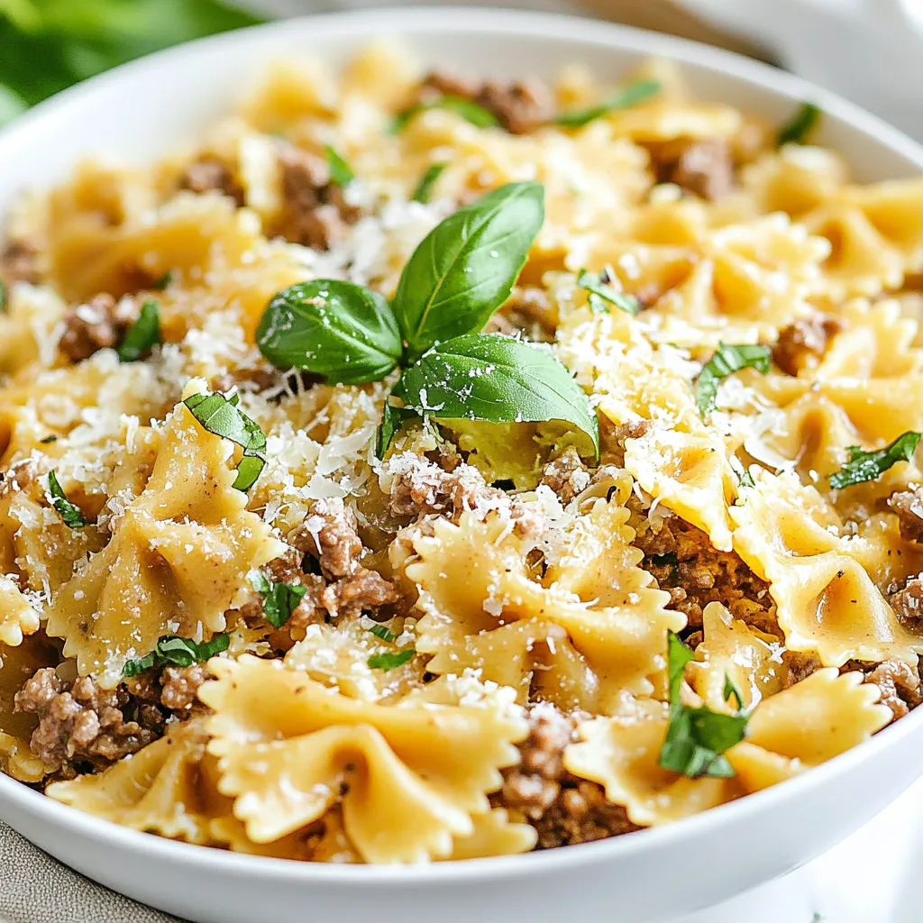 Here’s what you need to make Creamy Parmesan Beef Bowtie Pasta: - 8 oz bowtie pasta - 1 lb ground beef - 2 cloves garlic, minced - 1 small onion, finely chopped - 1 cup heavy cream - 1 cup grated Parmesan cheese - 1 teaspoon Italian seasoning - 1/2 teaspoon red pepper flakes (optional) - Salt and pepper to taste - 2 tablespoons olive oil - Fresh basil leaves for garnish Each ingredient plays a key role. The bowtie pasta is fun and holds the sauce well. Ground beef adds protein and flavor. Garlic and onion give depth to the dish. Cream and cheese create that rich, creamy sauce we love. Seasonings like Italian seasoning and red pepper flakes bring warmth. Finally, fresh basil adds a bright touch. {{ingredient_image_1}} Start by boiling a large pot of salted water. Once it boils, add the bowtie pasta. Cook it according to the package instructions until it is al dente. This usually takes about 8-10 minutes. After cooking, drain the pasta and set it aside for later. Next, grab a large skillet and add two tablespoons of olive oil. Heat the oil over medium heat. Add the finely chopped onion and cook it until it turns soft and clear. This takes about 3 to 4 minutes. Then, add the minced garlic to the skillet. Cook it for one more minute until it smells great. Now, increase the heat to medium-high. Add the ground beef and break it apart with a spoon. Cook the beef until it turns brown, which should take about 6 to 8 minutes. If there is extra fat, drain it out. Lower the heat back to medium. Stir in the heavy cream, Italian seasoning, red pepper flakes, salt, and pepper. Allow the mixture to simmer for 3 to 4 minutes. This helps the sauce thicken a bit. Then, add the grated Parmesan cheese. Stir until it melts and becomes creamy. Now it’s time to bring everything together. Add the cooked bowtie pasta into the skillet with the sauce. Toss the pasta in the creamy mixture. Make sure each piece of pasta is coated well. Taste your dish and adjust the seasoning if needed. Remove from heat and get ready to serve. To cook bowtie pasta perfectly, start with a large pot. Use plenty of water and add salt. This helps flavor the pasta. Bring the water to a rapid boil. Add the pasta and stir it right away. This prevents it from sticking. Follow the package time for cooking. Check for doneness by tasting. Aim for al dente, meaning firm but not hard. Drain the pasta in a colander, but save some pasta water. It can help adjust your sauce later. For a creamy sauce, choose high-fat heavy cream. It makes the sauce rich and smooth. Start with a hot skillet and olive oil. Cook onions until they look clear. This brings out their sweetness. Add garlic next, cooking just until you smell it. Then, add the ground beef. Break it apart as it cooks, browning it well. When the meat is ready, lower the heat. Stir in the heavy cream, Italian seasoning, and red pepper flakes. Let it simmer gently. This lets the flavors blend. Finish by adding the Parmesan cheese. Stir until it melts and becomes creamy. Garnishing your pasta makes it even better! Use fresh basil leaves for a bright touch. They add color and flavor. You can also sprinkle more Parmesan cheese on top. This gives extra creaminess. If you like a kick, add a dash of red pepper flakes. Serve the pasta in bowls for a cozy feel. Enjoy it warm for the best taste! Pro Tips Perfect Pasta: Always salt your pasta water generously. This is your only chance to flavor the pasta itself! Meat Mastery: For a richer flavor, try using a combination of ground beef and Italian sausage. Cheese Choice: Use freshly grated Parmesan cheese for the best melting and flavor. Herb Freshness: Add fresh herbs like basil or parsley just before serving for a burst of freshness. {{image_2}} You can easily change this recipe to fit your needs. If you want a lighter meal, swap ground beef for turkey or chicken. Both add great flavor and cut down on fat. For a vegetarian option, use mushrooms or lentils instead of beef. You still get a hearty dish with these swaps. If you avoid dairy, try using coconut cream in place of heavy cream. Nutritional yeast also adds a cheesy taste without the dairy. Bowtie pasta is fun and looks great, but you can use other shapes too. Penne or fusilli work well and hold onto the sauce nicely. If you want a gluten-free option, choose gluten-free pasta made from rice or chickpeas. Each shape gives a new twist to the dish while keeping it creamy and delicious. Adding veggies can make this dish healthier and more colorful. Spinach or broccoli is easy to toss in. Just add them when simmering the sauce. You can also try bell peppers or zucchini for added crunch. If you want more protein, consider adding cooked chicken or shrimp. They blend well with the creamy sauce and make the meal even more filling. To store your creamy Parmesan beef bowtie pasta, let it cool first. Use an airtight container. It keeps well in the fridge for up to three days. Be sure to label the container with the date. When you’re ready to enjoy leftovers, use the microwave or stovetop. If using the microwave, heat in short bursts, stirring often. On the stovetop, add a splash of cream or water to help it reheat evenly. Stir until hot. You can freeze this pasta dish for later. Place cooled pasta in a freezer-safe container. It can last up to three months in the freezer. To reheat, let it thaw overnight in the fridge. Warm it on the stove or microwave, adding a bit of cream for creaminess. Yes, you can make this dish ahead of time. Cook the pasta and beef mixture. Store them separately in airtight containers in the fridge. When you are ready to eat, reheat the beef sauce. Then, combine it with the pasta. This keeps the pasta from getting mushy. You can use whole milk or half-and-half instead of heavy cream. This will change the creaminess. For a thicker sauce, add a bit of flour or cornstarch. You can also use coconut cream for a dairy-free option. Just remember, it will add a slight coconut flavor. Yes! F