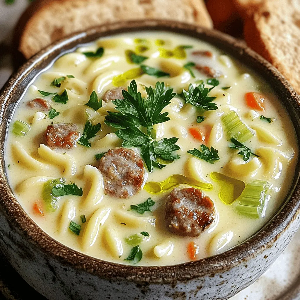 ![To make a hearty Creamy Parmesan Sausage Ditalini Soup, you need a few key ingredients: - 1 tablespoon olive oil - 1 pound Italian sausage (mild or spicy, your choice) - 1 medium onion, diced - 2 cloves garlic, minced - 2 medium carrots, diced - 2 celery stalks, diced - 6 cups chicken broth - 1 cup ditalini pasta These ingredients form the base of the soup, bringing rich flavors and a satisfying texture. Next, we add the creamy elements that make this soup truly special: - 1 cup heavy cream - 1 cup grated Parmesan cheese These creamy ingredients create a velvety texture that makes each spoonful delightful. Lastly, don’t forget the seasoning to elevate the flavors: - 1 teaspoon Italian seasoning - 2 cups fresh spinach, roughly chopped - Fresh parsley, chopped (for garnish) These extras add freshness and brightness to the soup. You can customize the soup to your taste by adjusting the seasonings. For the full recipe, check out the details provided earlier in this article. This dish is not just a meal but an experience that warms the heart. - Start by sautéing the sausage. In a large pot, heat 1 tablespoon of olive oil over medium heat. Add 1 pound of Italian sausage, removing the casings first. Break it apart with a wooden spoon. Cook until it's browned, which should take about 5 to 7 minutes. If there is too much grease, remove it. - Next, cook the aromatics. Add 1 medium onion, diced, 2 medium carrots, diced, and 2 celery stalks, diced, to the pot. Sauté these for about 5 minutes until they soften. Stir in 2 cloves of minced garlic and cook for one more minute until it smells great. - Bring in the chicken broth. Pour in 6 cups of chicken broth and let it come to a gentle boil. Once boiling, add 1 cup of ditalini pasta and 1 teaspoon of Italian seasoning. Lower the heat and let it simmer. Cook the pasta according to the package, usually 8 to 10 minutes until it’s al dente. - Add heavy cream and finishing touches. After the pasta is cooked, stir in 1 cup of heavy cream and 1 cup of grated Parmesan cheese. Mix well until the cheese melts and the soup becomes creamy. Season with salt and pepper to your taste. - For ladling and garnishing the soup, use a ladle to serve the soup into bowls. Top with fresh parsley for a pop of color. You can also offer extra Parmesan cheese on the side for those who love it. - Ideas for accompanying bread or sides include serving the soup with crusty bread. This adds a nice crunch and completes your meal. You can also pair it with a simple salad for a fresh touch. To boost flavor, try adding spices. A pinch of red pepper flakes brings heat. Fresh herbs like basil or thyme add brightness. You can also toss in diced bell peppers or zucchini. These veggies give the soup more texture and taste. For the best creaminess, add heavy cream slowly. Stir it in well after cooking the pasta. If you want chewy pasta, cook it separately. This keeps the pasta from getting too soft in the soup. Use a large pot for even cooking. A sturdy wooden spoon is best for stirring. It won’t scratch your pot and helps break up the sausage. Make sure you have a ladle for serving. It makes it easy to dish out the soup. For the complete recipe, check the Full Recipe section. {{image_2}} You can switch up the meat in this soup. Using chicken or turkey sausage is a great option. These choices are leaner but still packed with flavor. They will make your soup lighter but just as tasty. For a vegetarian version, skip the sausage altogether. Use mushrooms for umami flavor. Tofu or tempeh can also add protein. Think about adding more beans for extra texture and nutrition. If you need a gluten-free soup, don’t worry! You can find gluten-free ditalini pasta at most stores. Rice or quinoa can also work well. They’ll change the texture a bit but still give you a hearty meal. For thickening, use cornstarch or arrowroot powder. Just mix them with a little cold water first. This will help avoid clumps in your soup. You can easily change the spice level in your soup. Choose mild sausage for a gentle taste. If you like heat, spicy sausage is the way to go. You can also have fun with cheeses. While Parmesan shines in this dish, adding mozzarella can make it extra gooey. Feta cheese will give a tangy twist. Mix and match to find your favorite! For the full recipe, check out the [Full Recipe]. To store your Creamy Parmesan Sausage Ditalini Soup, cool it to room temperature first. Then, transfer the leftovers into airtight containers. Glass or plastic containers work well for this. Make sure to leave some space in the container, as the soup may expand when frozen. This helps keep the soup fresh and tasty. If you want to freeze the soup for later, use freezer-safe containers. Fill them about three-quarters full, leaving room for expansion. If you use a plastic bag, remove as much air as possible before sealing. To thaw, place the soup in the fridge overnight. Reheat it gently on the stove over low heat, stirring often to keep it creamy. In the fridge, your soup will last about 3 to 4 days. Look for signs of spoilage, like a sour smell or unusual texture. If you see any mold, it’s best to throw it away. Keeping an eye on these details helps ensure your soup stays safe and delicious. For the full recipe, check the earlier section. Can I make this soup ahead of time? Yes, you can prepare this soup a day before. Just store it in the fridge. When you're ready to eat, heat it up on the stove. The flavors will blend even more. Is it possible to freeze the creamy soup? Absolutely! This soup freezes well. Let it cool before putting it in airtight containers. It can last up to three months in the freezer. Thaw in the fridge overnight when you want to enjoy it again. What can I substitute if I can’t find ditalini pasta? If you can't find ditalini, use small pasta like elbow macaroni or shells. These will work well and still bring great texture to your soup. Alternatives for heavy cream If you need a lighte